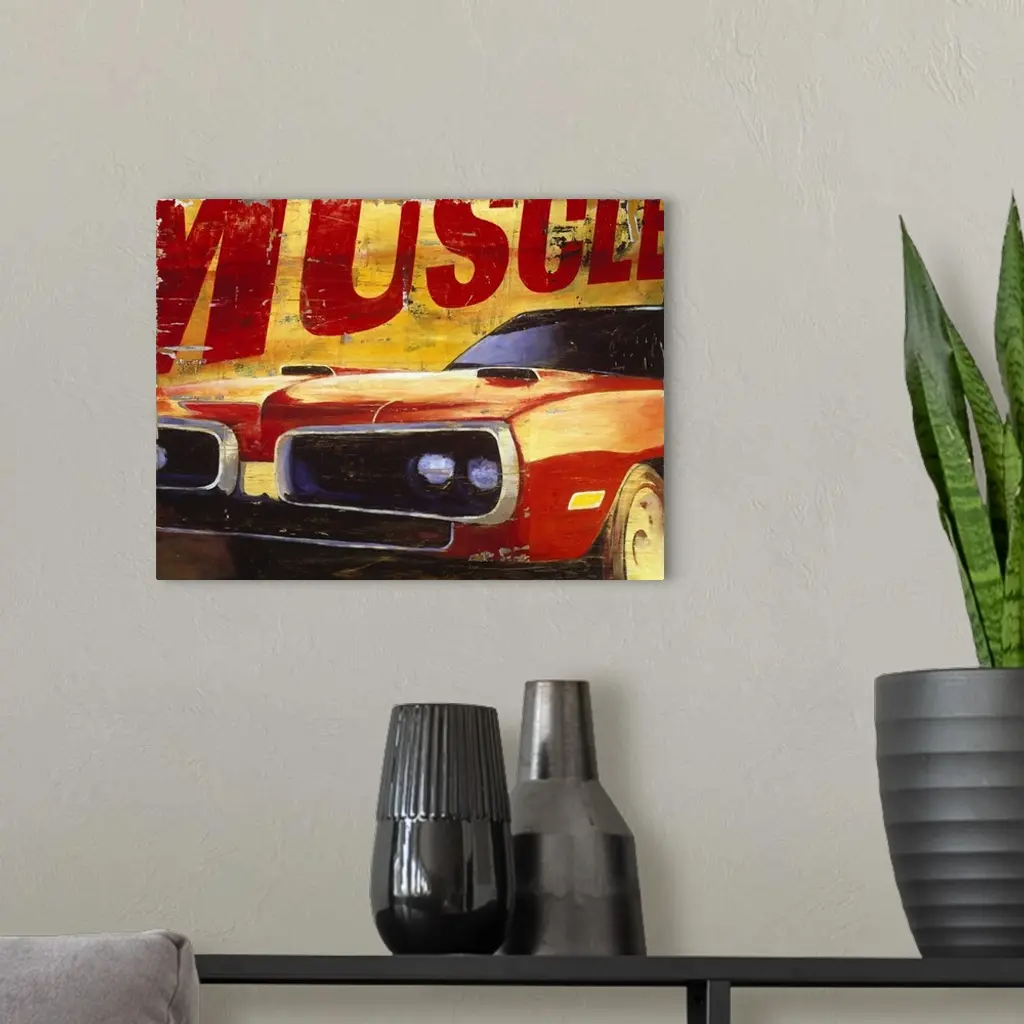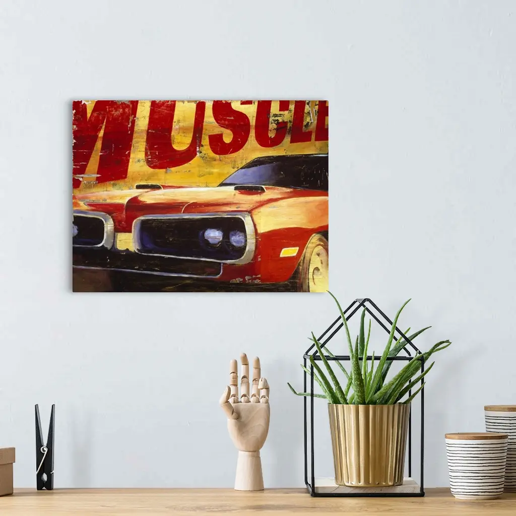 Retro-style painting of a vintage muscle car, with a focus on the headlights, and the text "Muscle" in capital letters.