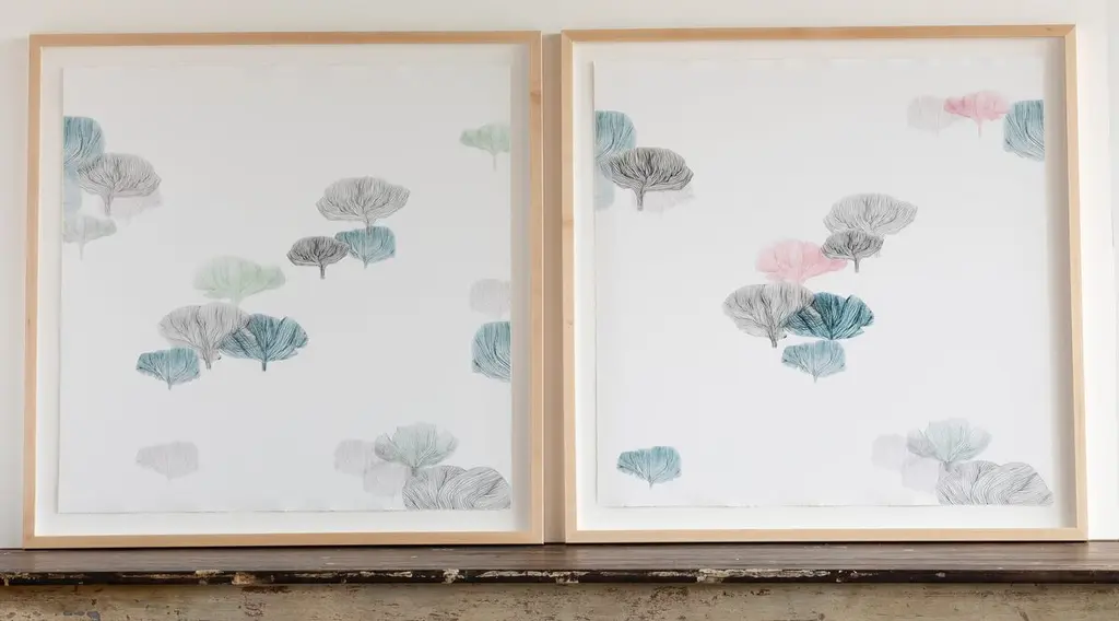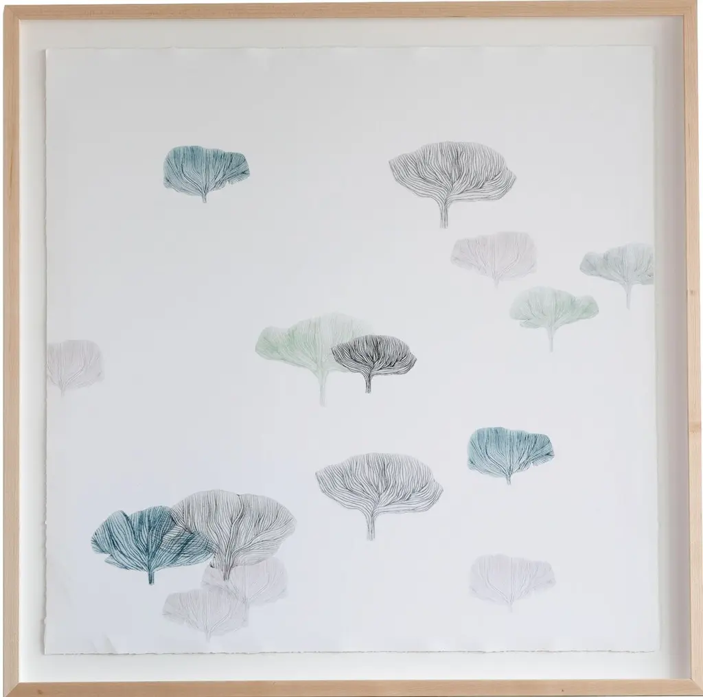 Whether you interpret the items depicted on this giclée print as trees or mushrooms, one thing is clear: They make for a graceful, serene composition. Printed on heavy cotton rag paper, the work arrives framed and ready to hang.