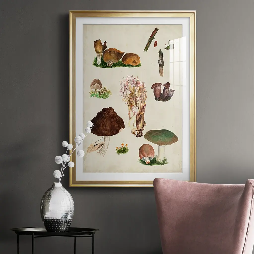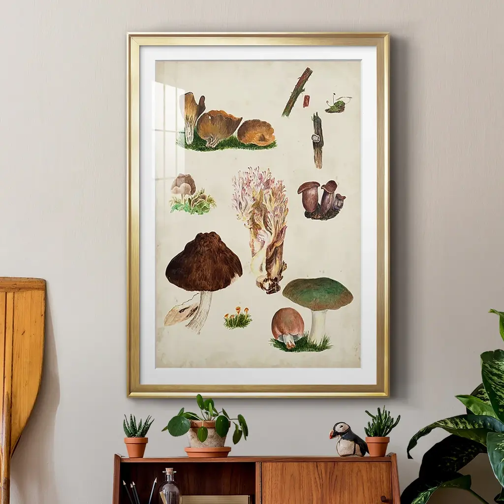 Mushroom Species IX Premium Framed Print - Ready to Hang A Premium Framed Print created to last. Framed in distressed wood and available in an array of sizes and colors Featuring a beveled a solid wood stretcher bar, each piece comes ready to hand 4 SIZES AVAILABLE 30.5''X42.5'' - Overall Size 26.5'X36.5'' - Overall Size 22.5''x30.5'' - Overall Size 18.5''x24.5'' - Overall Size Each piece is made to order. Each piece comes with hanging hardware. Made in the USA Ready to Hang Giclee Paper Print Acrylic Glass Beveled Matt Board