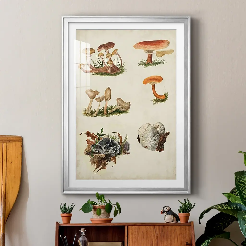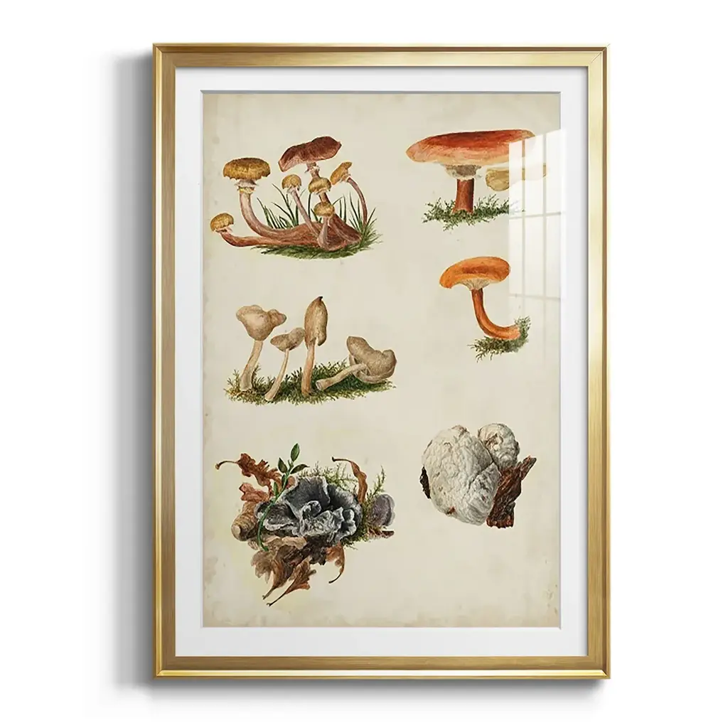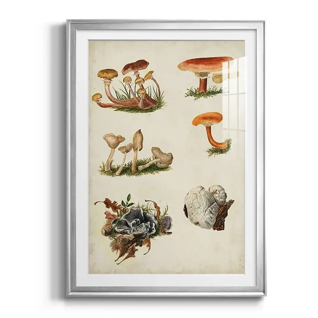 Mushroom Species X Premium Framed Print - Ready to Hang A Premium Framed Print created to last. Framed in distressed wood and available in an array of sizes and colors Featuring a beveled a solid wood stretcher bar, each piece comes ready to hand 4 SIZES AVAILABLE 30.5''X42.5'' - Overall Size 26.5'X36.5'' - Overall Size 22.5''x30.5'' - Overall Size 18.5''x24.5'' - Overall Size Each piece is made to order. Each piece comes with hanging hardware. Made in the USA Ready to Hang Giclee Paper Print Acrylic Glass Beveled Matt Board