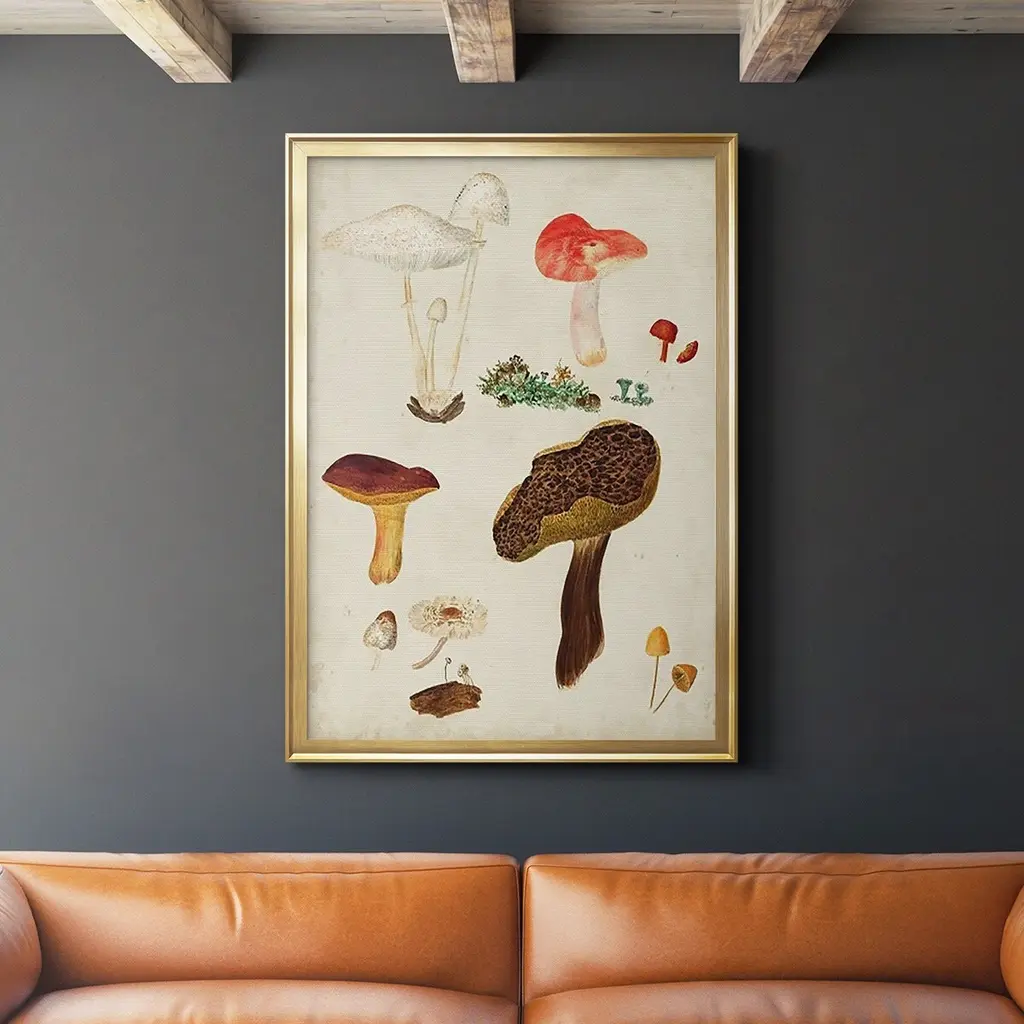 Mushroom Species XI Premium Framed Print - Ready to Hang A Premium Framed Print created to last. Framed in distressed wood and available in an array of sizes and colors Featuring a beveled a solid wood stretcher bar, each piece comes ready to hand 4 SIZES AVAILABLE 30.5''X42.5'' - Overall Size 26.5'X36.5'' - Overall Size 22.5''x30.5'' - Overall Size 18.5''x24.5'' - Overall Size Each piece is made to order. Each piece comes with hanging hardware. Made in the USA Ready to Hang