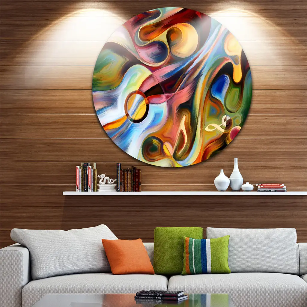Bring Contemporary Abstraction to your home with this large Circle Metal wall art. This Music beyond the Frames Metal Artwork makes it the focal point of any room or office. - White Gloss Coating ensures colors are extra vibrant with light reflection.- Aluminum grade Sheet Metal with 1 inch mounting frame on the back giving the illusion that the artwork is floating on the wall..- Mounting Brackets are included along with instructions.- High Quality Digital images are created directly into a glossy aluminum panel producing a stunning and captivating print into the glossy finish of the metal.- Water, Fire and Scratch resistant HD Aluminum panels.- Looks better than any photo paper and guaranteed to last at least 20 years- Easy to clean with a microfiber cloth. Colors are far superior to regular Canvas Art. - Easy to Hang