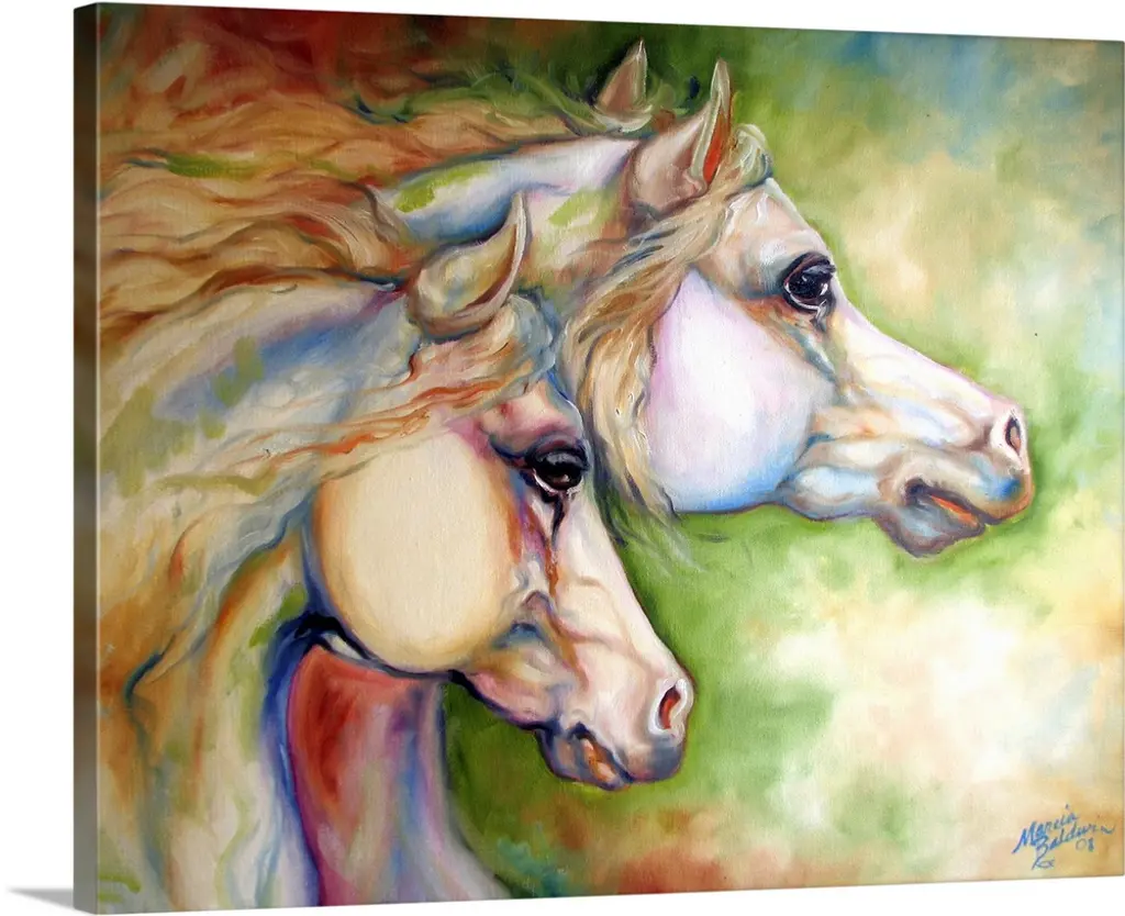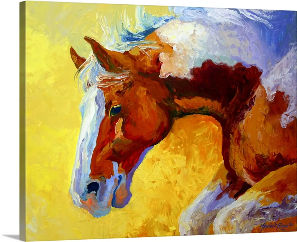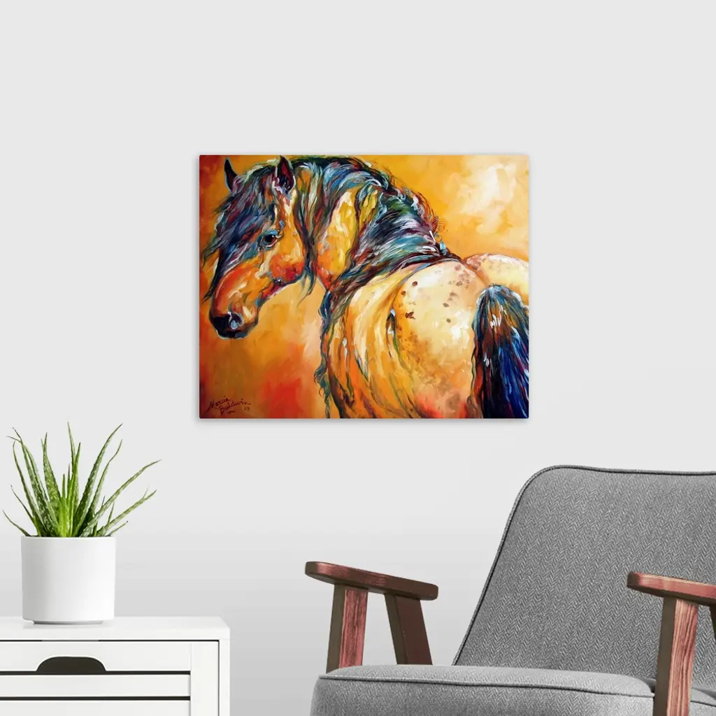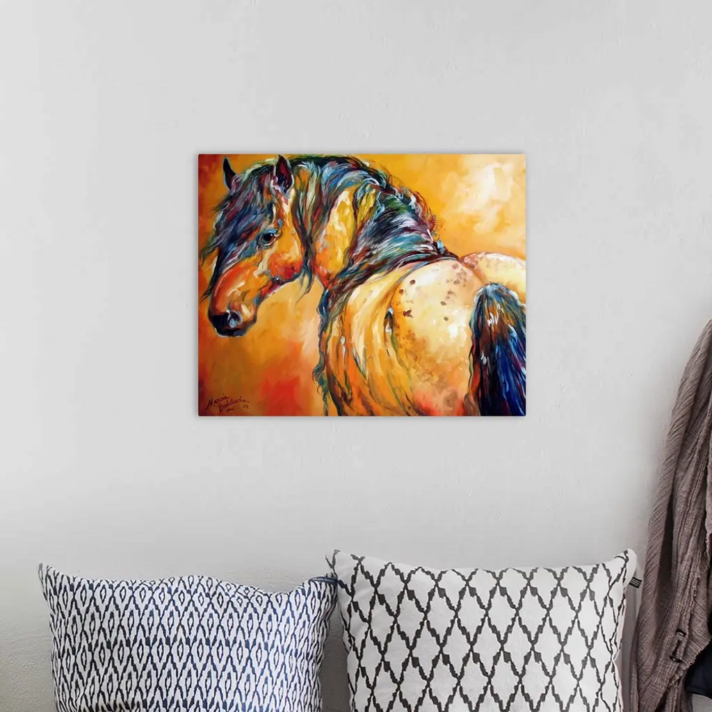 Contemporary painting of horse in warm orange, yellow, and red tones with cool colors in its mane.