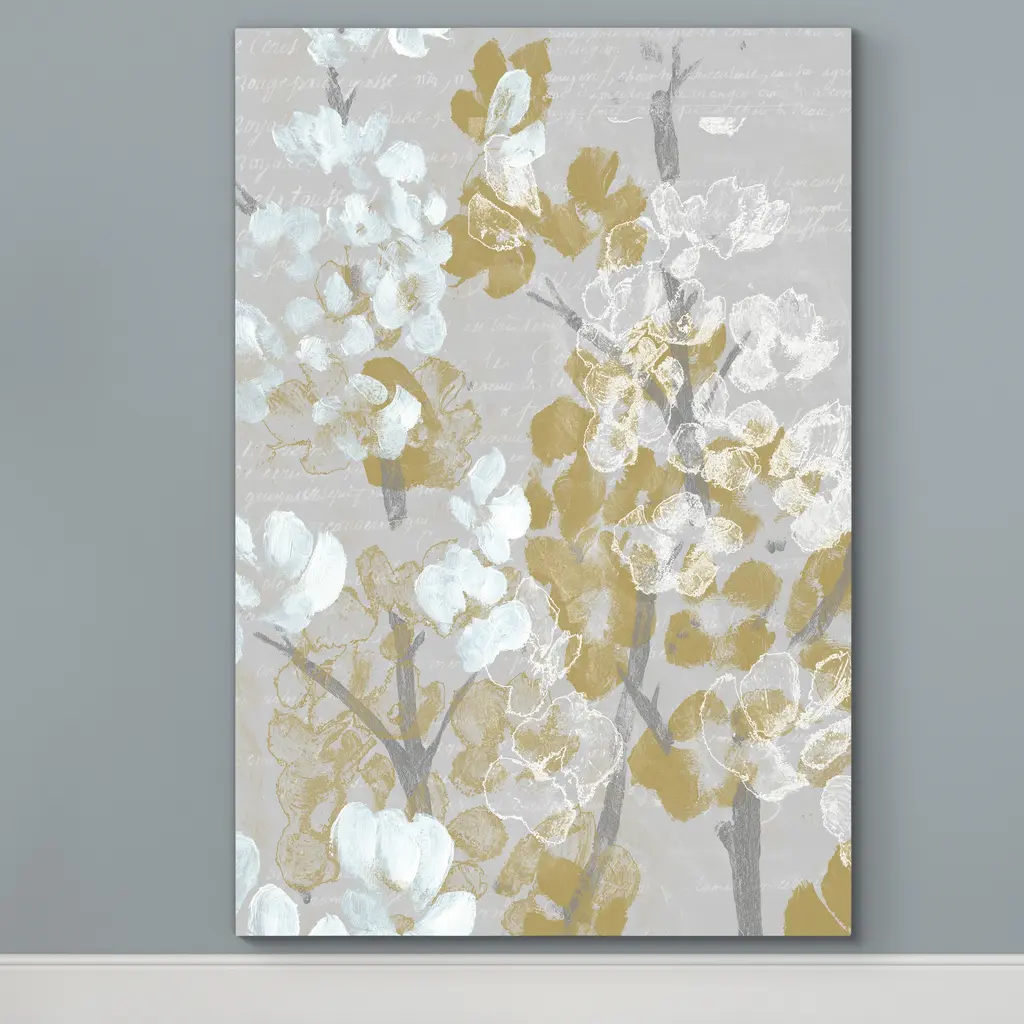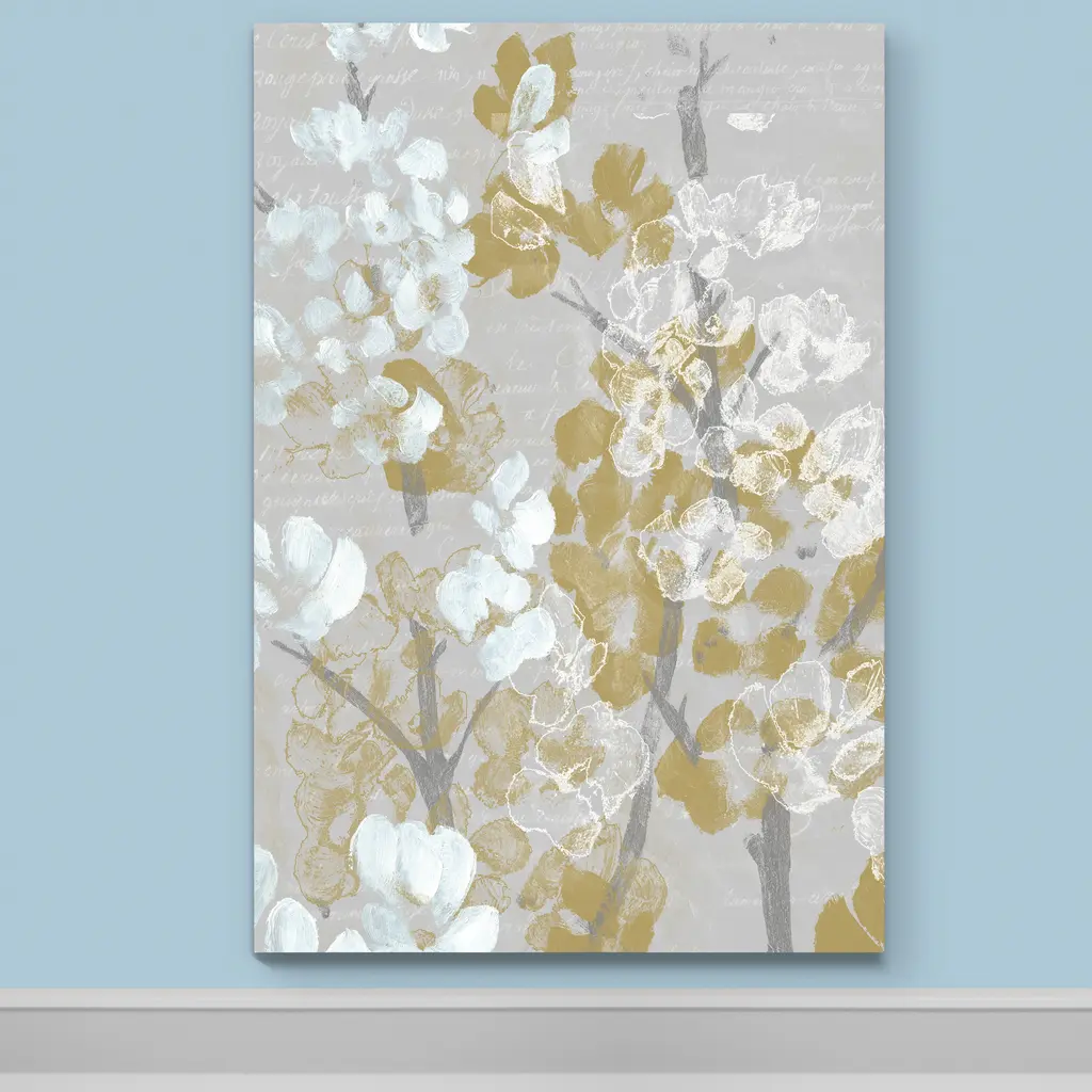 Mustard on Grey Blooms I-Premium Gallery Wrapped Canvas - Ready to Hang A premium hand stretched gallery wrapped canvas print created to last. Featuring a beveled a solid wood stretcher bar, each piece comes ready to hand 5 SIZES AVAILABLE 8''X12'' - Overall Size 16''x20'' - Overall Size 18''x27'' - Overall Size 24''x36'' - Overall Size 32''x48'' - Overall Size Each piece is made to order. Built to Last Each piece comes ready to hang Solid wood stretcher Fade and Water resistant Made domestically