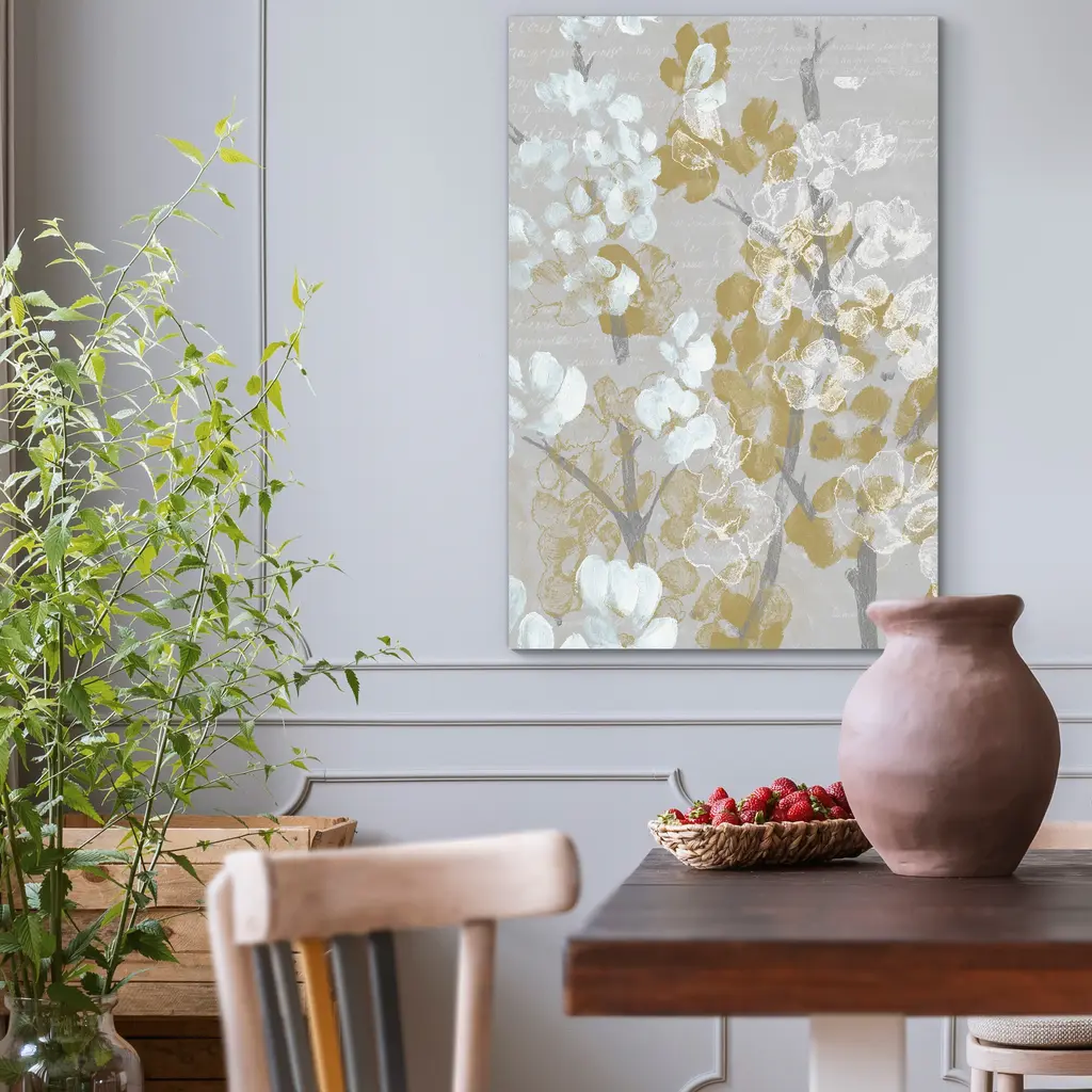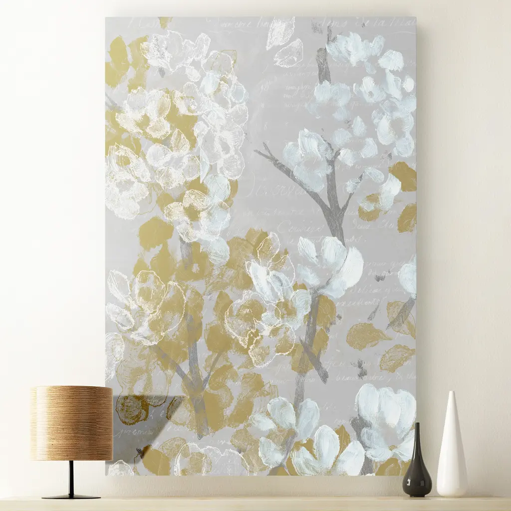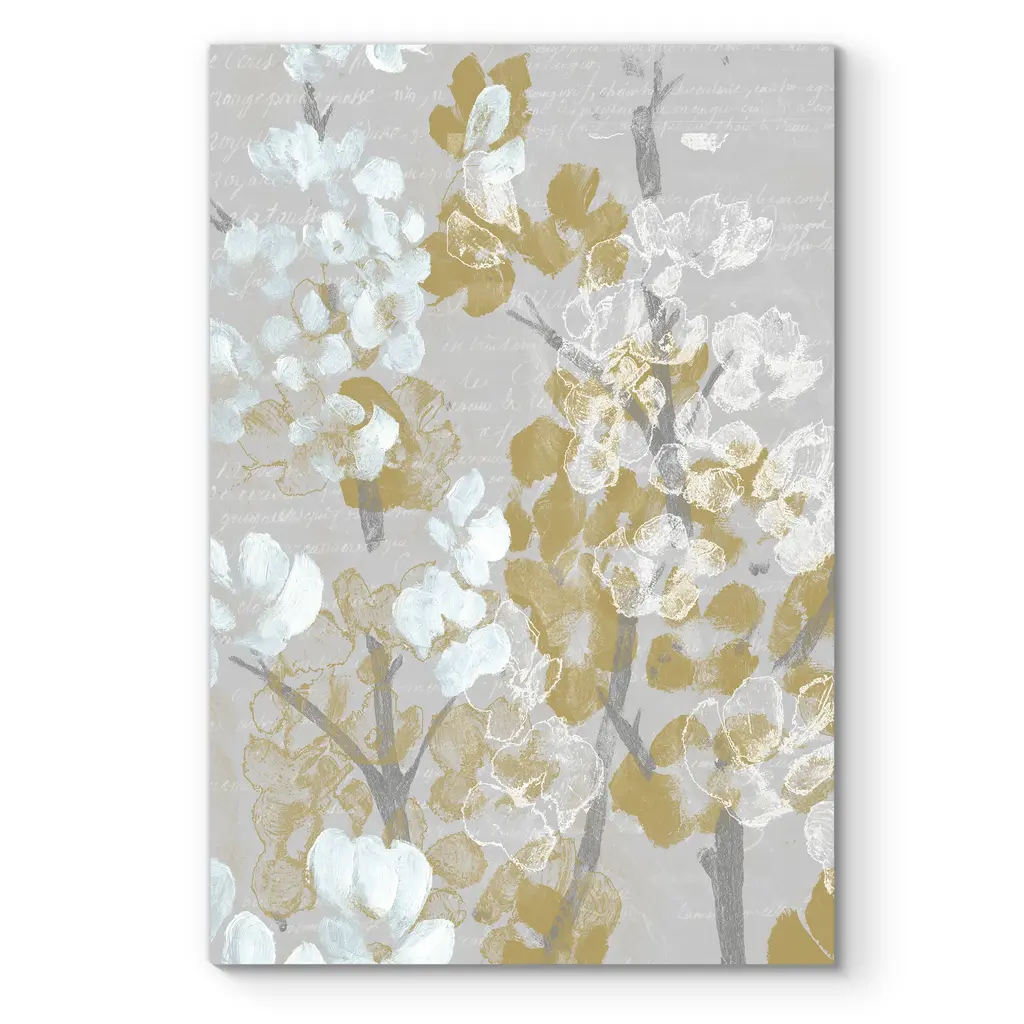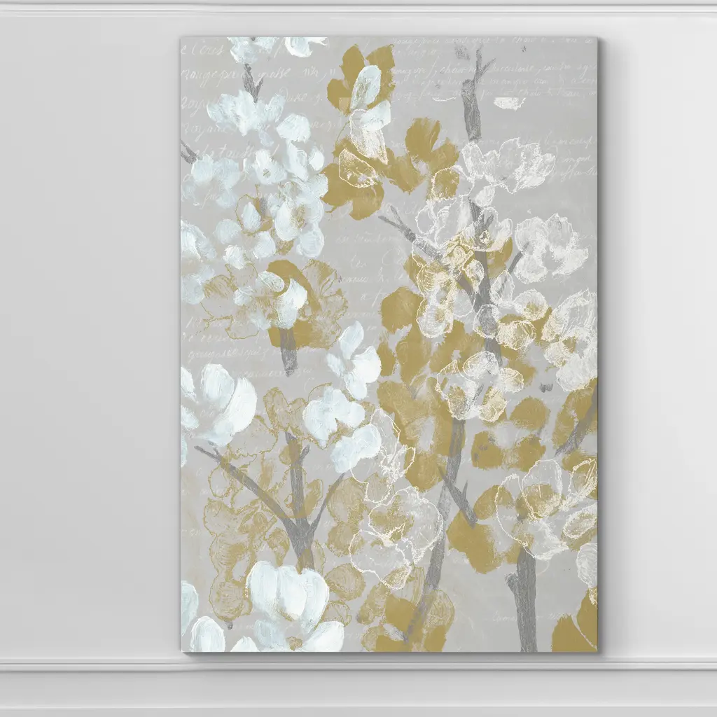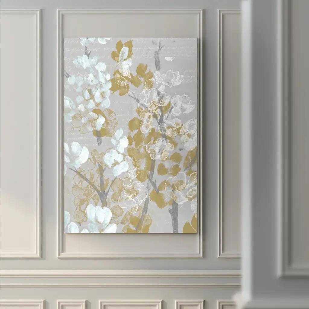 Mustard on Grey Blooms I-Premium Gallery Wrapped Canvas - Ready to Hang A premium hand stretched gallery wrapped canvas print created to last. Featuring a beveled a solid wood stretcher bar, each piece comes ready to hand 5 SIZES AVAILABLE 8''X12'' - Overall Size 16''x20'' - Overall Size 18''x27'' - Overall Size 24''x36'' - Overall Size 32''x48'' - Overall Size Each piece is made to order. Built to Last Each piece comes ready to hang Solid wood stretcher Fade and Water resistant Made domestically