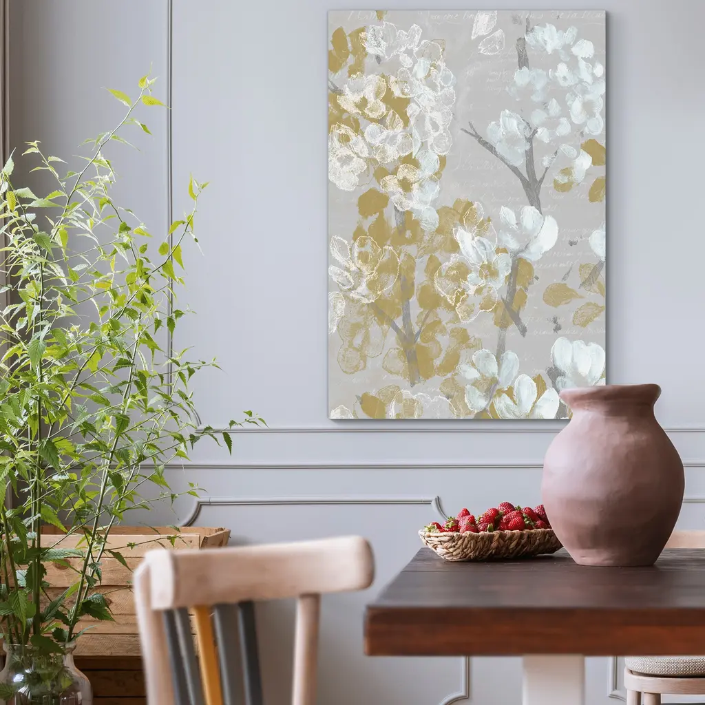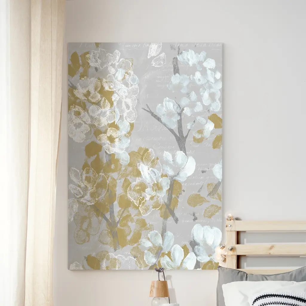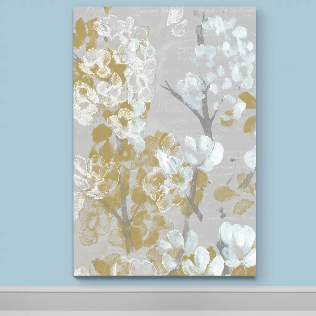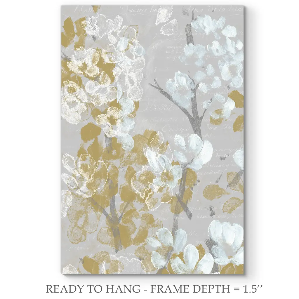 Mustard on Grey Blooms II-Premium Gallery Wrapped Canvas - Ready to Hang A premium hand stretched gallery wrapped canvas print created to last. Featuring a beveled a solid wood stretcher bar, each piece comes ready to hand 5 SIZES AVAILABLE 8''X12'' - Overall Size 16''x20'' - Overall Size 18''x27'' - Overall Size 24''x36'' - Overall Size 32''x48'' - Overall Size Each piece is made to order. Built to Last Each piece comes ready to hang Solid wood stretcher Fade and Water resistant Made domestically
