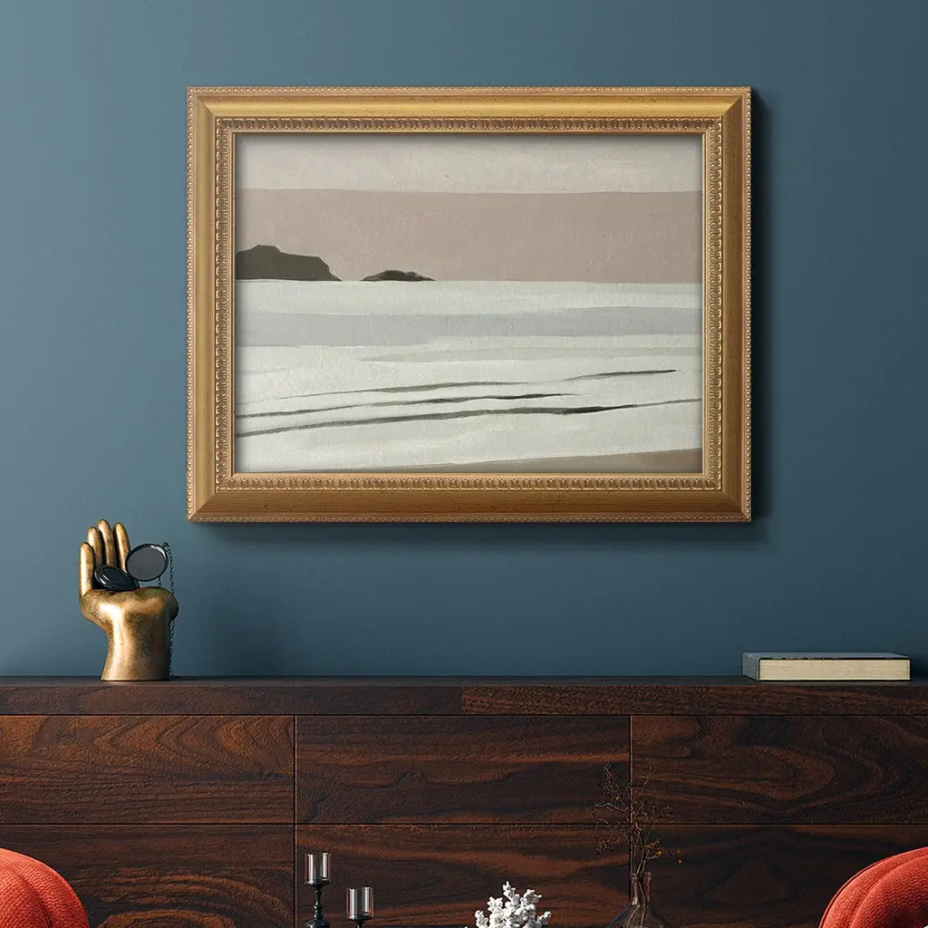 Muted Tonal Horizon I Premium Framed Canvas- Ready to Hang A Premium Framed Canvas created to last. Framed in distressed wood and available in an array of sizes and colors Featuring a beveled a solid wood stretcher bar, each piece comes ready to hand 3 SIZES AVAILABLE 16''X20'' - Overall Size 18'X27'' - Overall Size 24''x36'' - Overall Size Each piece is made to order. Each piece comes with hanging hardware. Made in the USA Ready to Hang Giclee Paper Print Acrylic Glass Beveled Matt Board