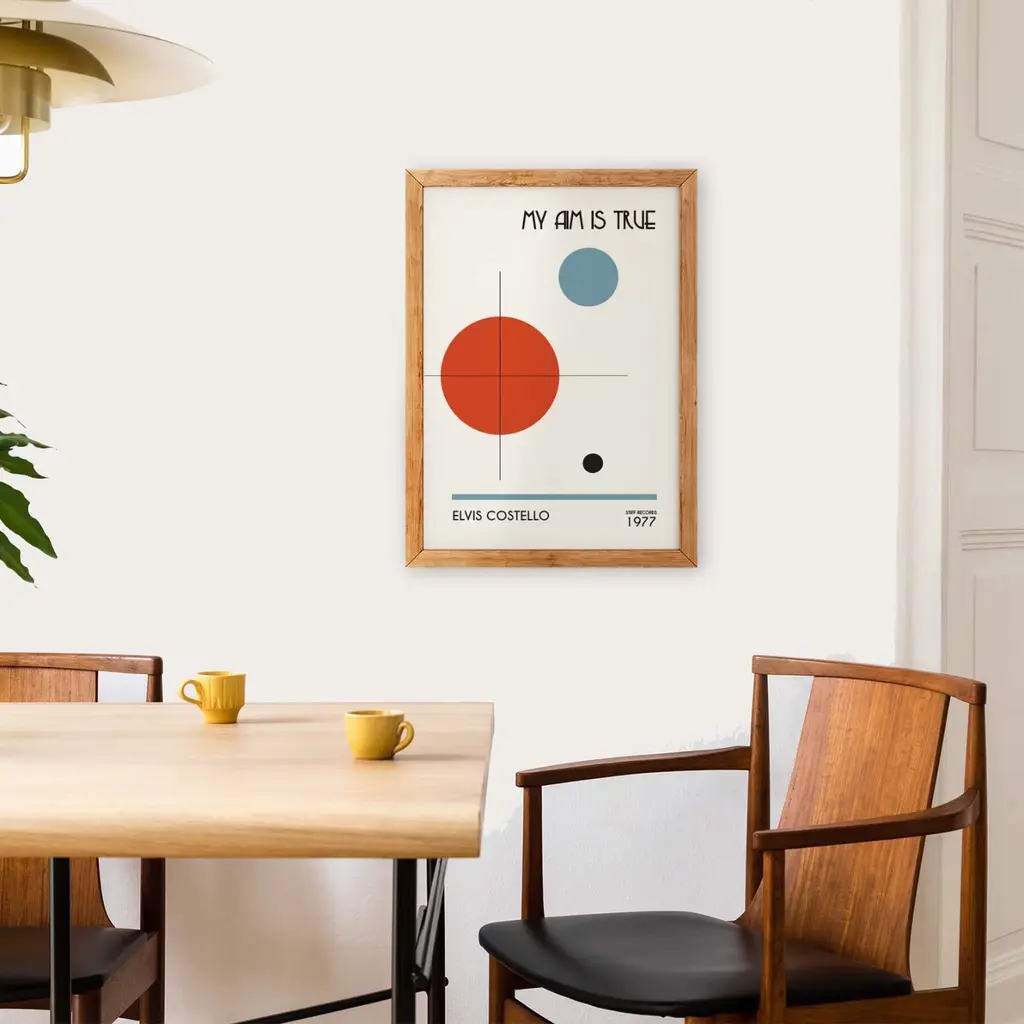 My aim is true retro art print, inspired by the 70s icon that is Elvis Costello. Taking influence from his 70s classic hit Alison and old science and mathematical textbooks to help create our midcentury inspired graphic art. Primary colours and Bauhaus inspired shape work this art print is an easy staple for any mid century modern home, just add some green plants and you're good to go. Sold without frameGiclée printed on Munken pure smooth cream paper which is certified by the Rainforest Alliance Program for FSC® Standards.
