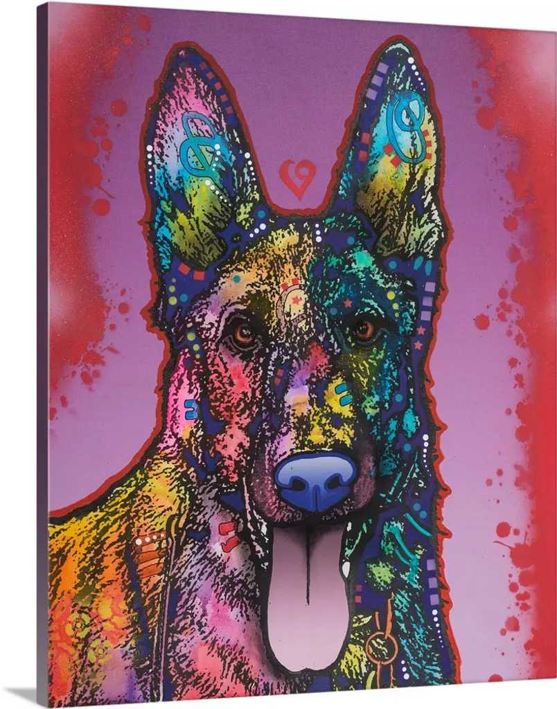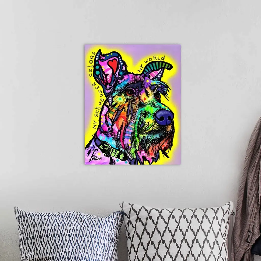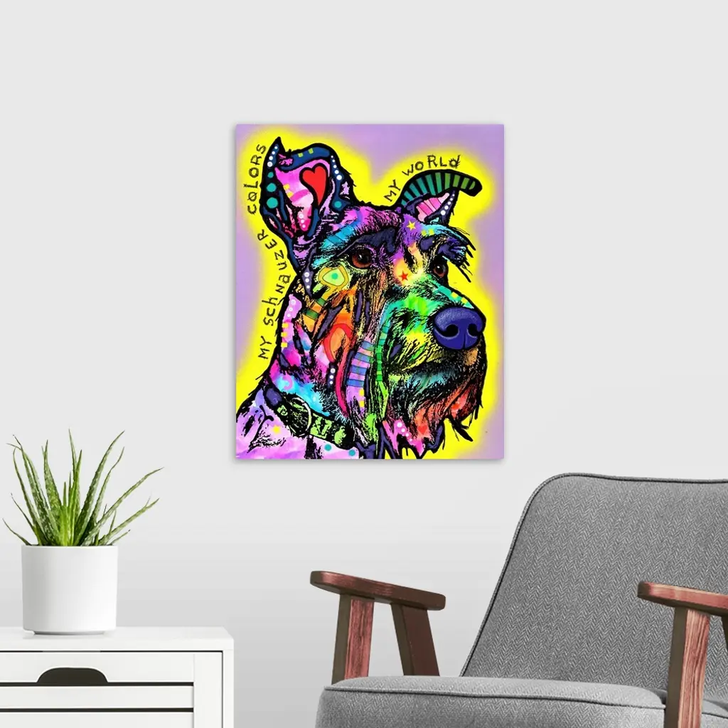 "My Schnauzer Colors My Wold" handwritten around a colorful painting of a Schnauzer on a purple background with a yellow spray painted outline.