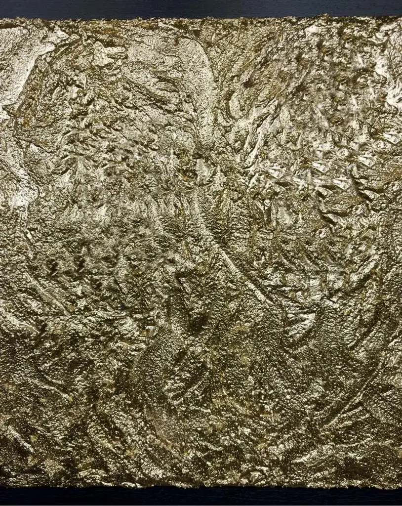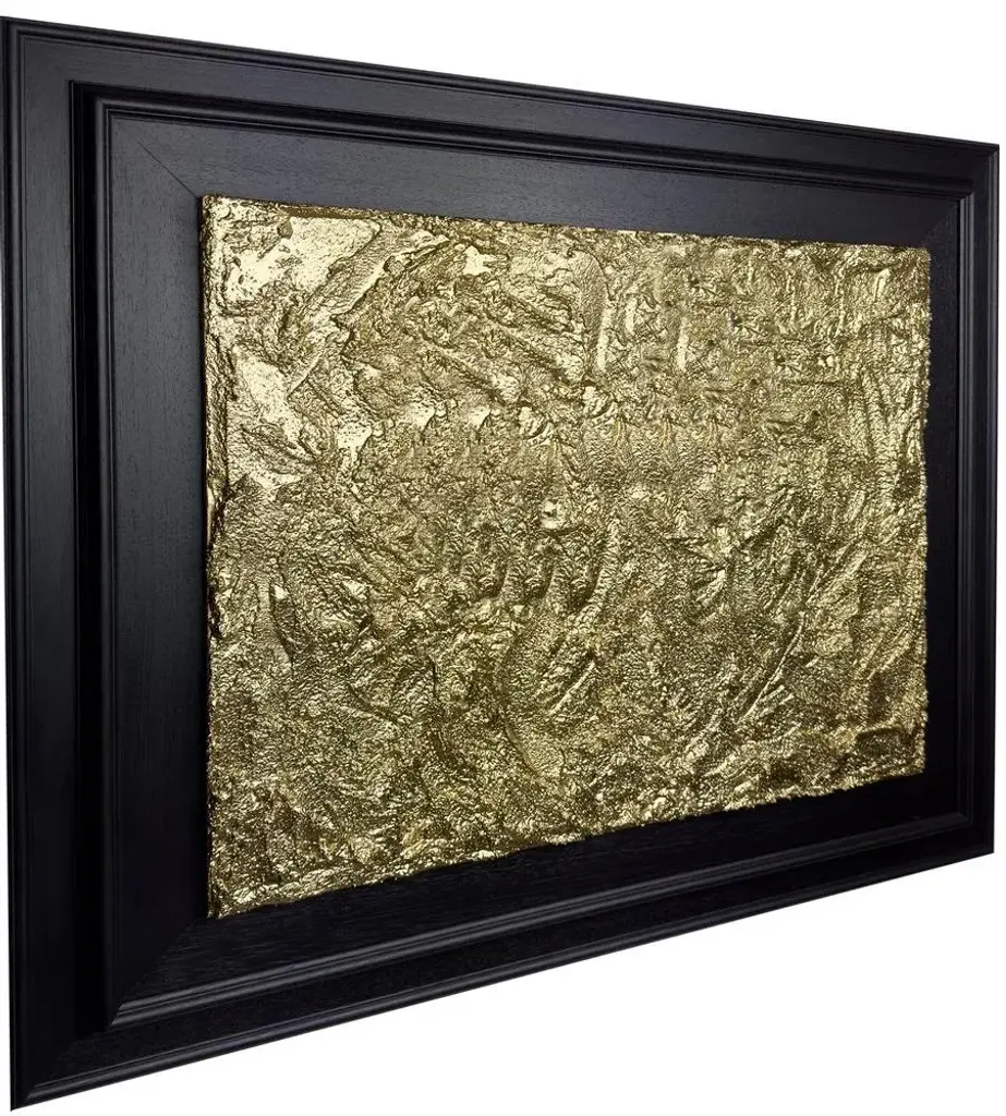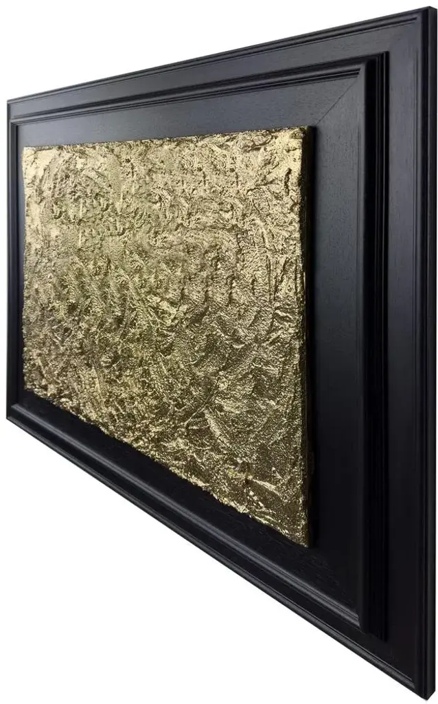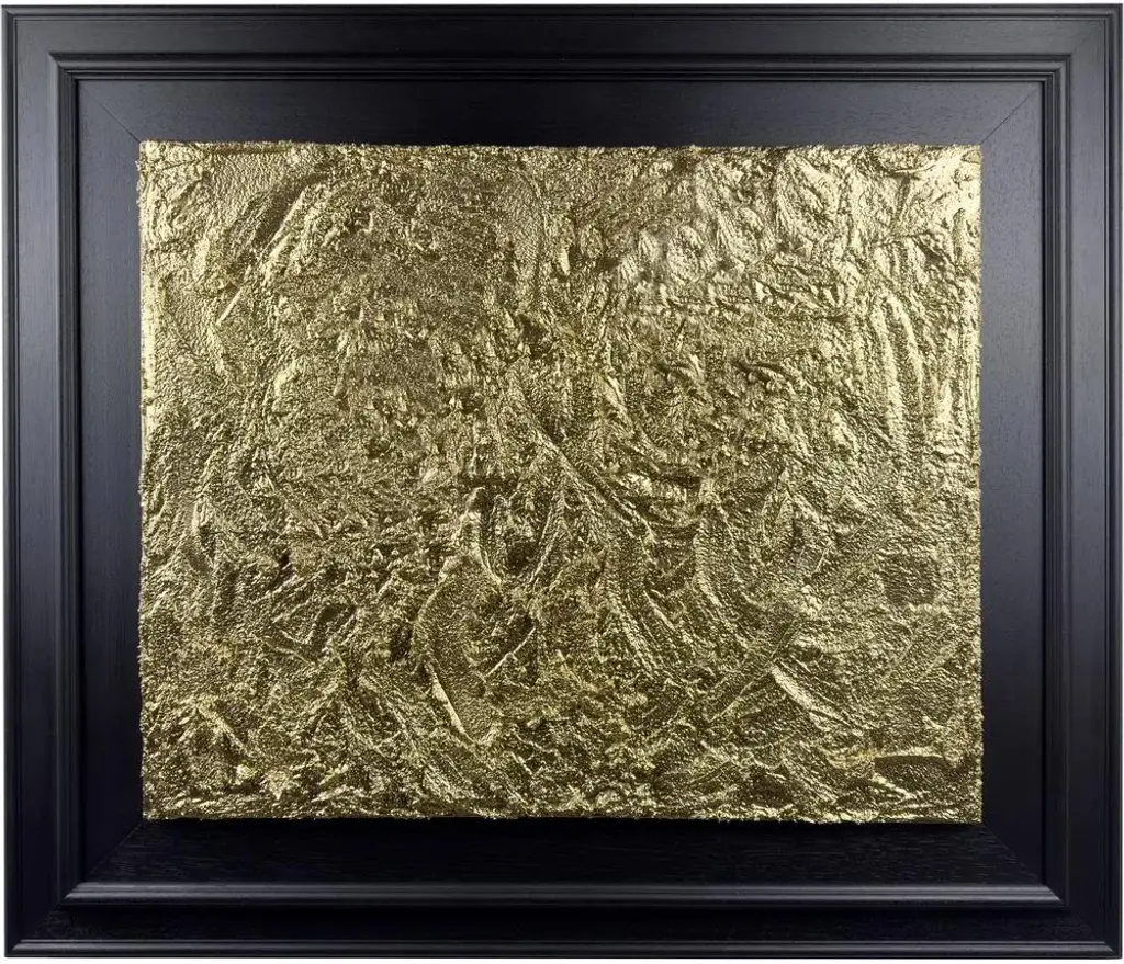 "My Soul 1" is the title of the work that represents the immaterial principle of life, opposed to the body. The soul that is traditionally considered immortal, but also a manifestation of the divine and center of thought, feeling and will, is depicted through the painted cement of gold. The concrete is randomly spread on the painting thus creating contrasts of lights and shadows on the surface. Calables thus generates always different works. Cement including the entire composition deliberately understanding the most intimate part of the composition as a symbol of closure towards an external interlocutor. The entire work is painted with a shade of shiny gold and applied on a black wooden background with a worked frame of the same color. Signed by Maker,Numbered
