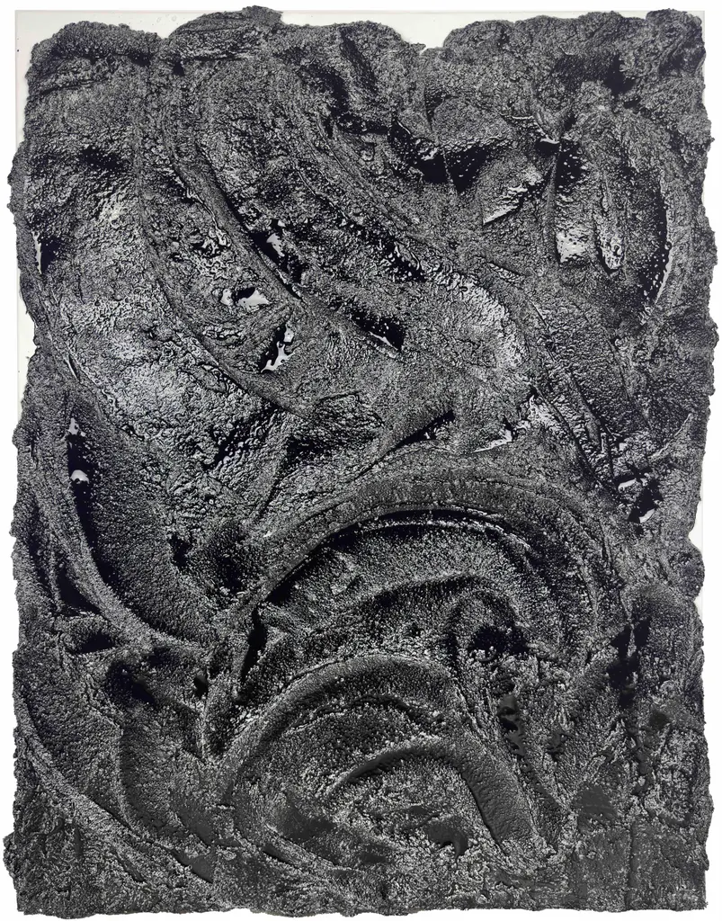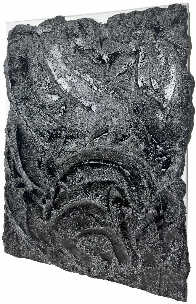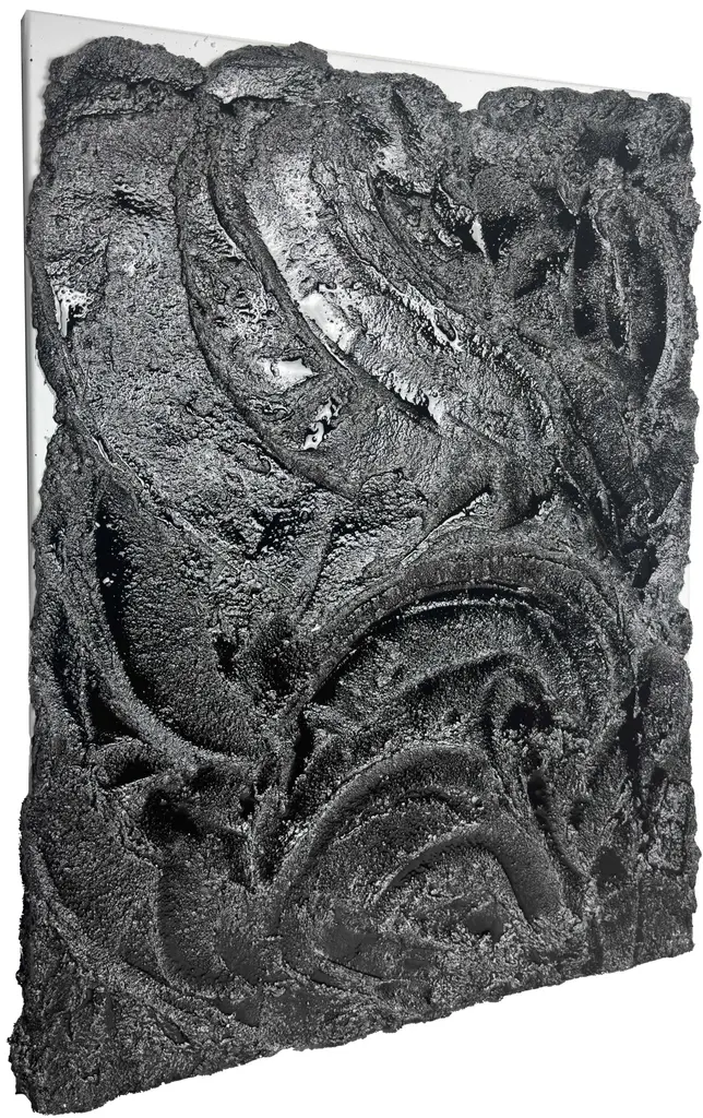 “My Soul 5” is the title of the work that represents the immaterial principle of life, as opposed to the body. The soul, which is traditionally considered immortal, but also a manifestation of the divine and the center of thought, feeling and will, is depicted through concrete painted with a special black enamel. The concrete is spread randomly on the painting thus creating contrasts of light and shadow on the surface. Randomness thus generates unique works that are always different. The cement includes the entire composition, deliberately including the most intimate part of the composition as a symbol of closure towards an external interlocutor. The entire work is painted with glossy black enamel. Signed by Maker