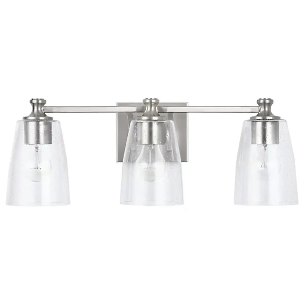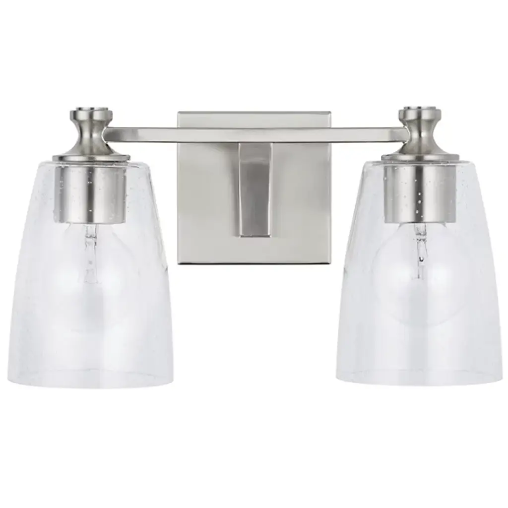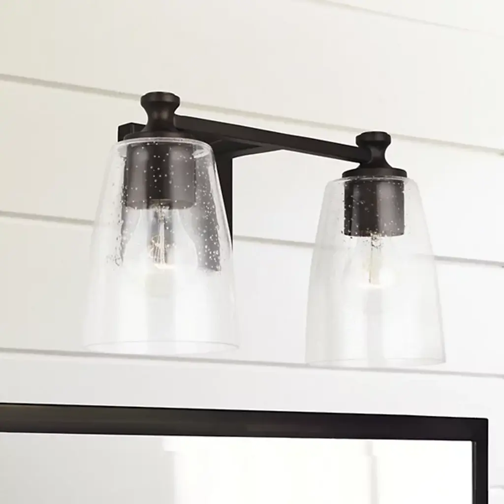 Reign in the sophisticated modern aesthetic of your bathroom with the shapely visuals of the Myles Vanity Light from Capital Lighting. Sporting a low-profile backplate, it’s hard not to be satisfied with this piece neatly mounted over the modern mirror. The bath bar says refined beauty with sculptural metal finials highlighted by their rounded silhouette. To satisfy your vintage taste, the piece wraps its bulbs with a charming clear seeded glass shade. The warmth of the bulbs catches the seeded accents as brief highlights. The outpouring light fills out the bathroom with an upscale warmth.