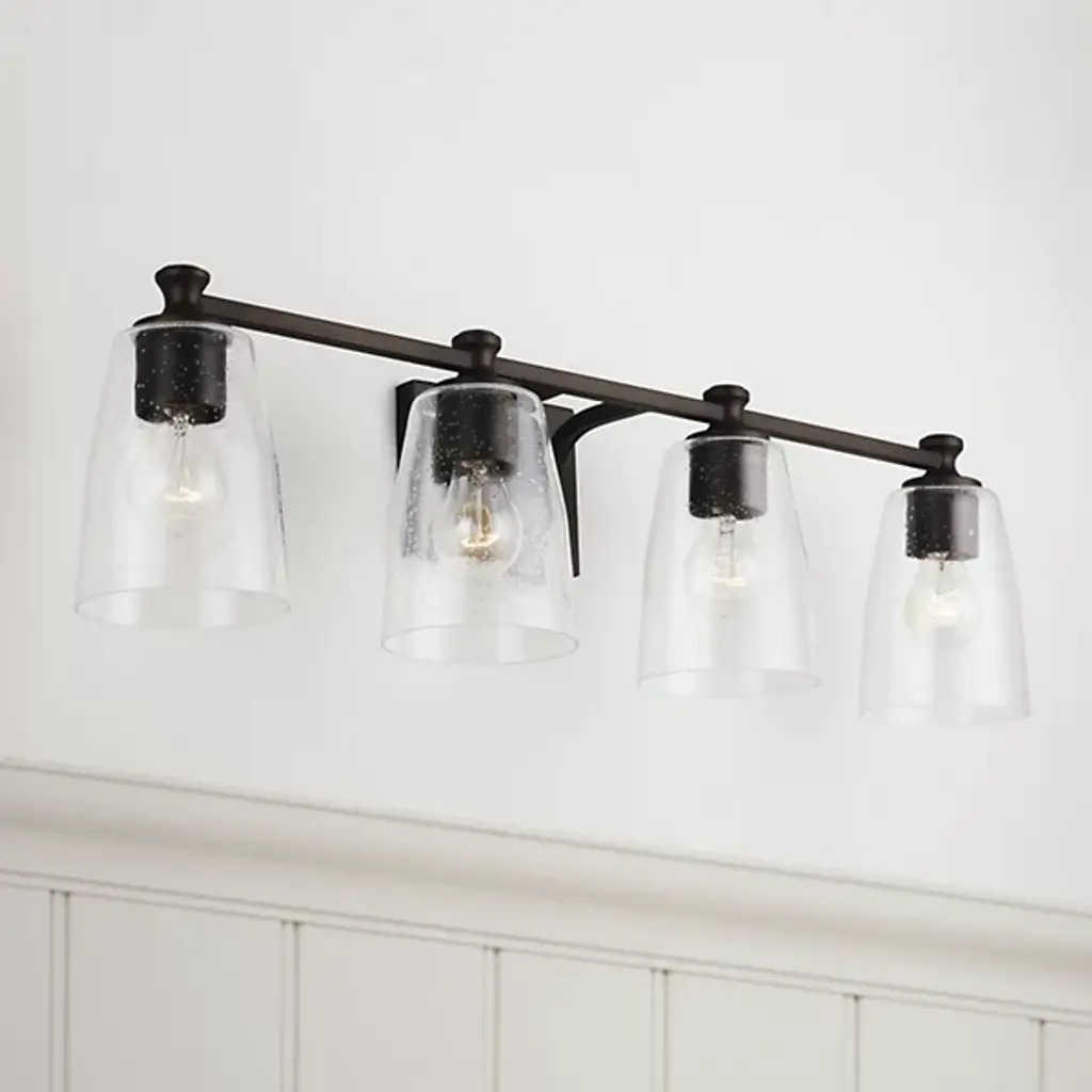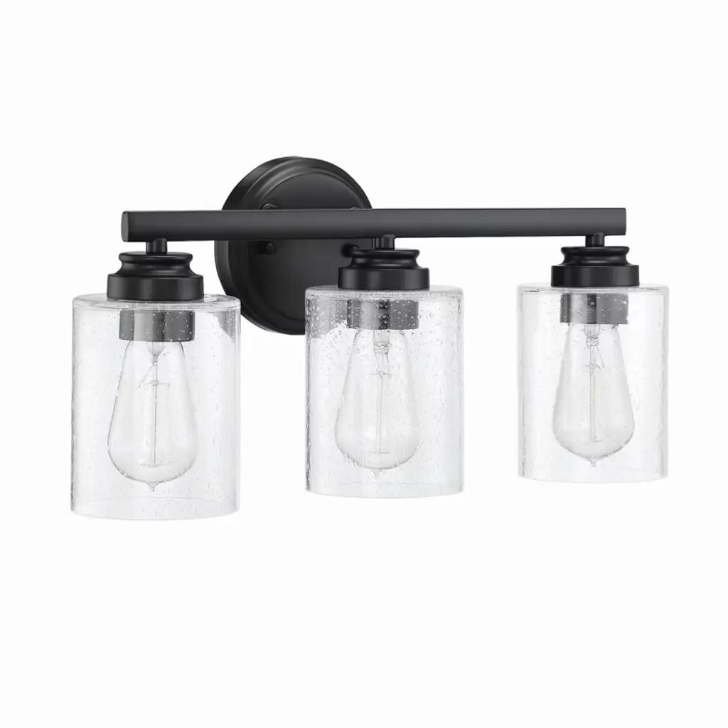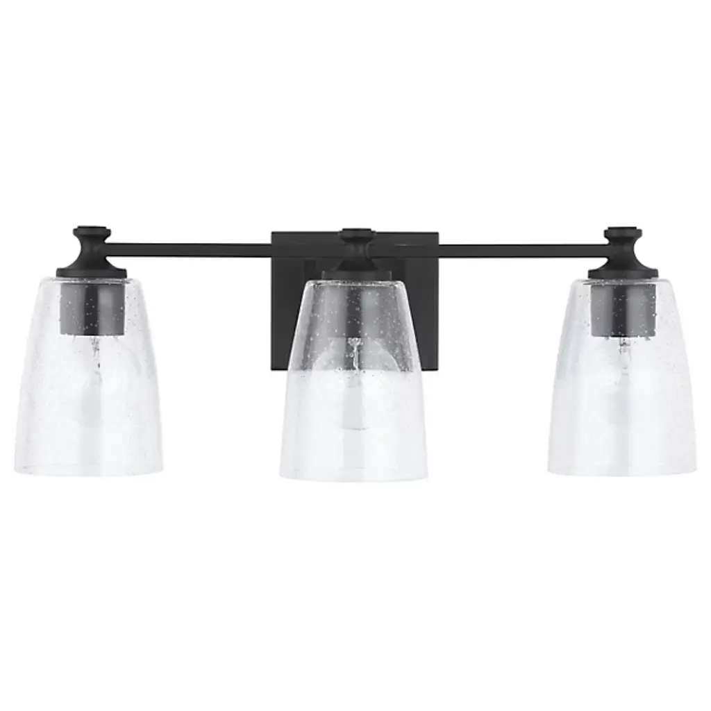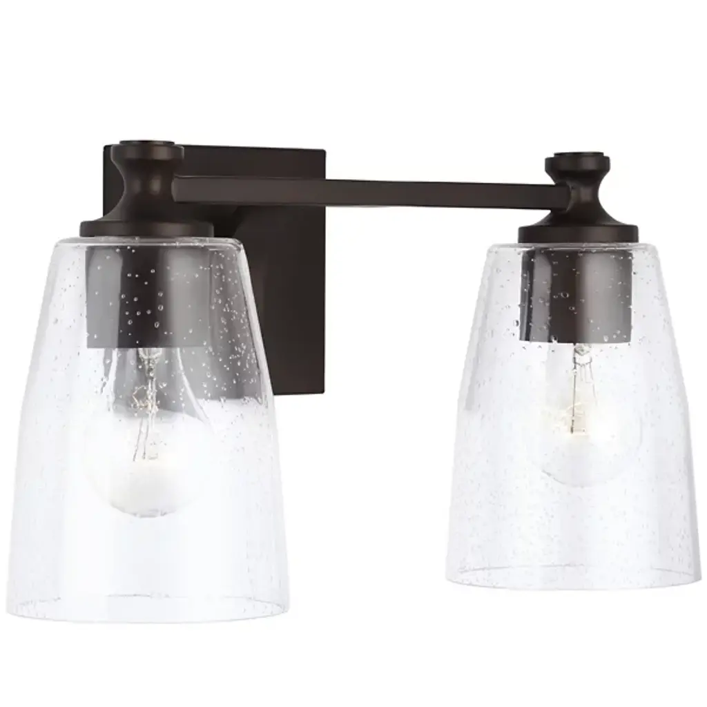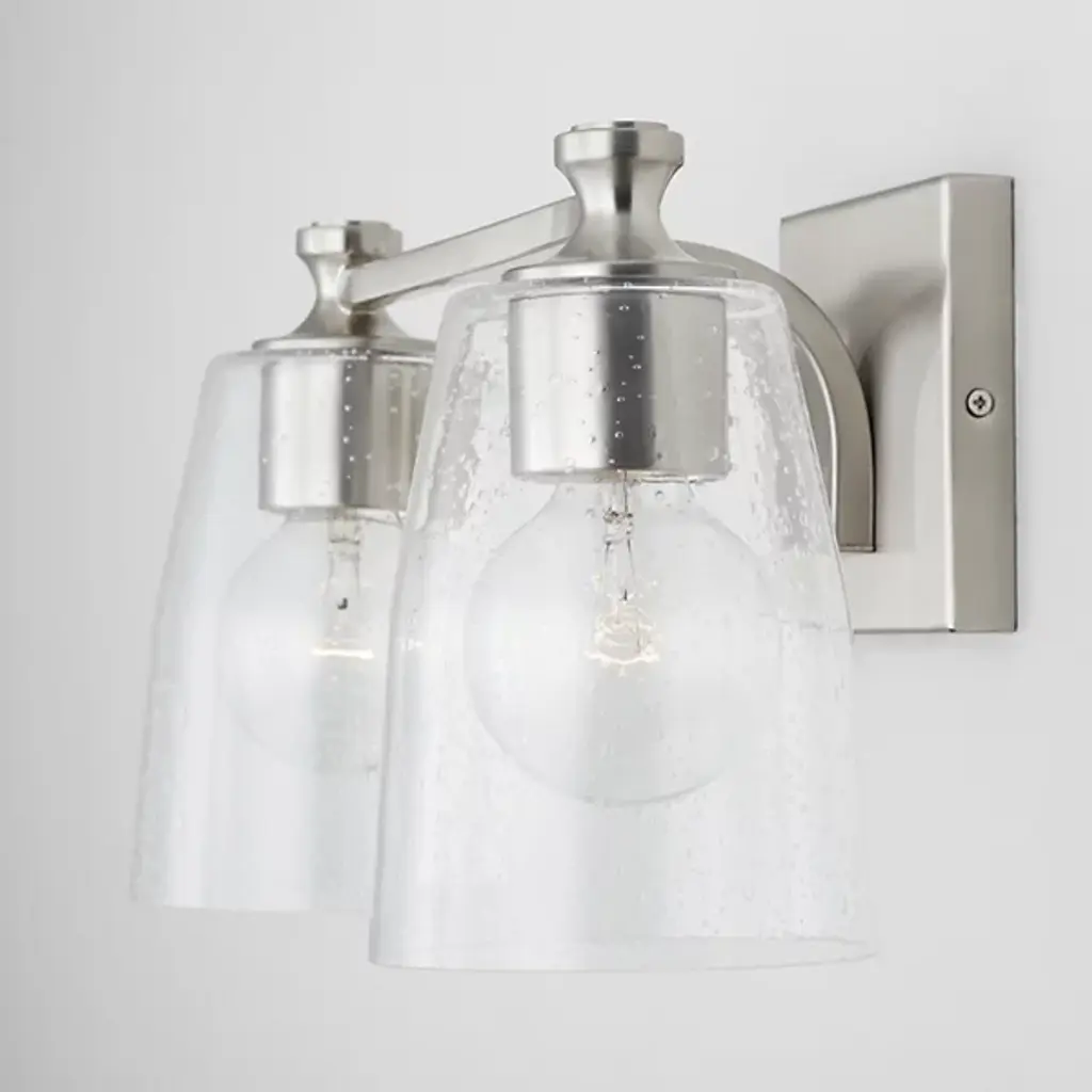 Reign in the sophisticated modern aesthetic of your bathroom with the shapely visuals of the Myles Vanity Light from Capital Lighting. Sporting a low-profile backplate, it’s hard not to be satisfied with this piece neatly mounted over the modern mirror. The bath bar says refined beauty with sculptural metal finials highlighted by their rounded silhouette. To satisfy your vintage taste, the piece wraps its bulbs with a charming clear seeded glass shade. The warmth of the bulbs catches the seeded accents as brief highlights. The outpouring light fills out the bathroom with an upscale warmth.
