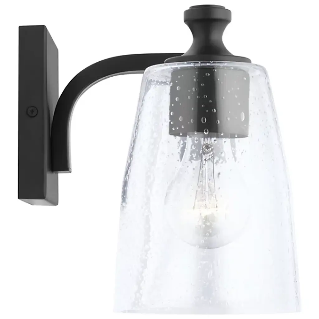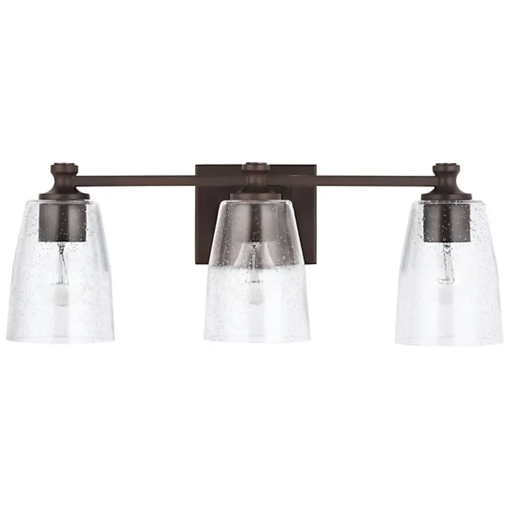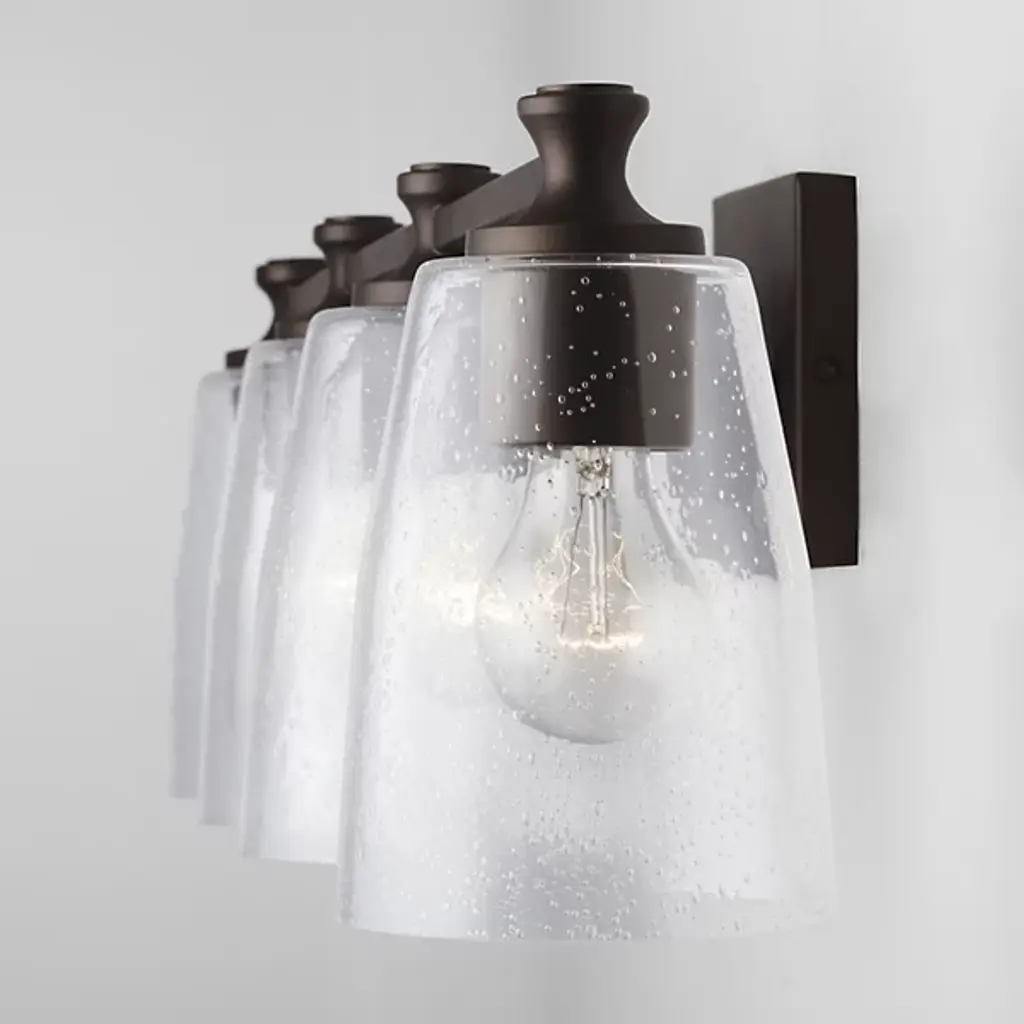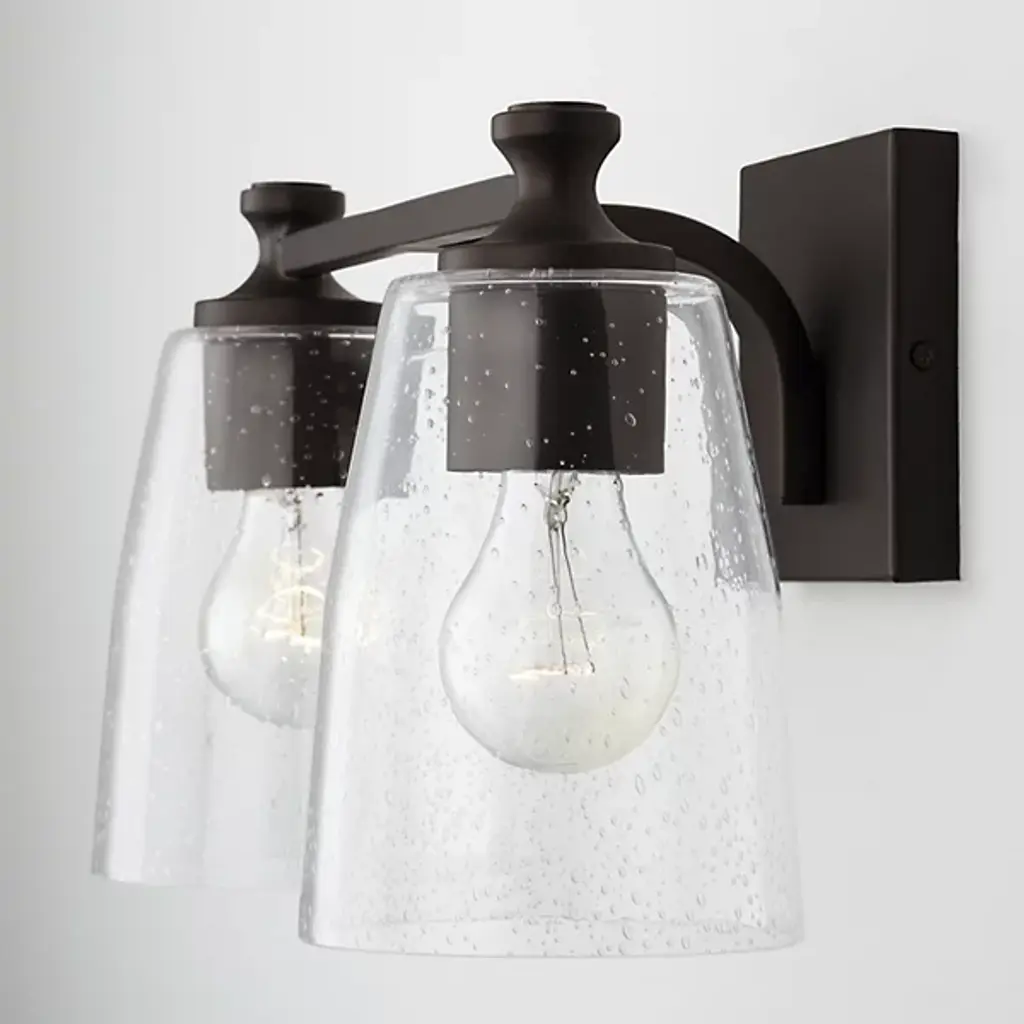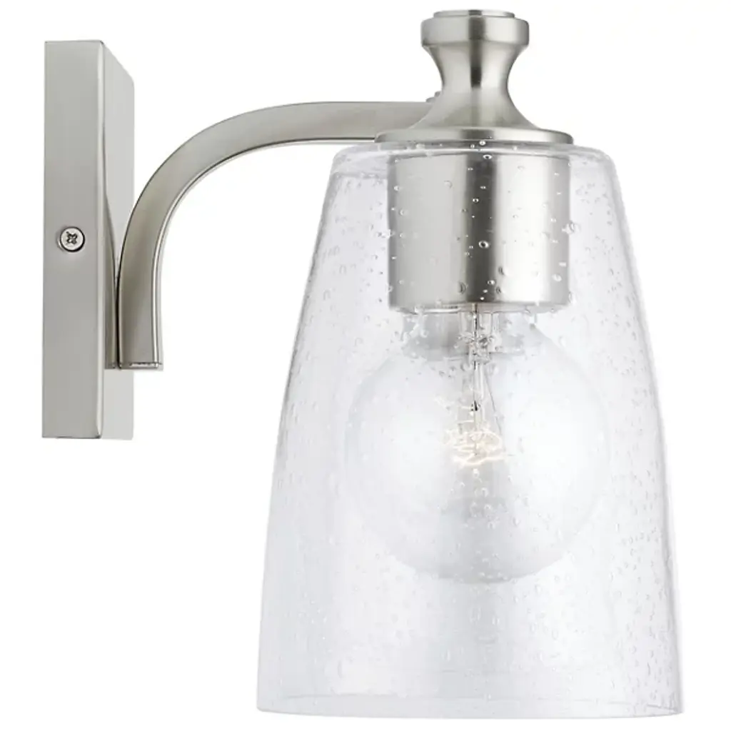 Reign in the sophisticated modern aesthetic of your bathroom with the shapely visuals of the Myles Vanity Light from Capital Lighting. Sporting a low-profile backplate, it’s hard not to be satisfied with this piece neatly mounted over the modern mirror. The bath bar says refined beauty with sculptural metal finials highlighted by their rounded silhouette. To satisfy your vintage taste, the piece wraps its bulbs with a charming clear seeded glass shade. The warmth of the bulbs catches the seeded accents as brief highlights. The outpouring light fills out the bathroom with an upscale warmth.