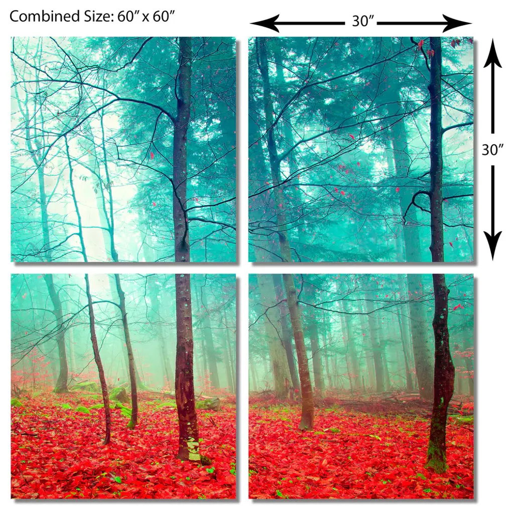 60"œ x 60"œ total size. Ready To Hang! (4 pieces - 30"œ x 30"œ each). 4 Panel Split (Quad) Nature photography of a colorful mystic autumn trees in forest. Modern metal wall art for home or office wall decor & interior design. Printed on Luxurious, HD aluminum glossy metal panels. Multi panel art.. HD aluminum panels. Metal print wall art. Includes Shadow Wall Mount on the back.• Aluminum Metal Wall Art• Made in USA• Ready to hang - No assembly required• Shadow mount hardware on the back• 0.045"œ thick HD Aluminum Panels• Scratch resistant, glossy finish• Superb color clarity, luxurious prints• Epson printing process• For indoor or moisture rich environment use• Easy to clean. Gently wipe with microfiber cloth.