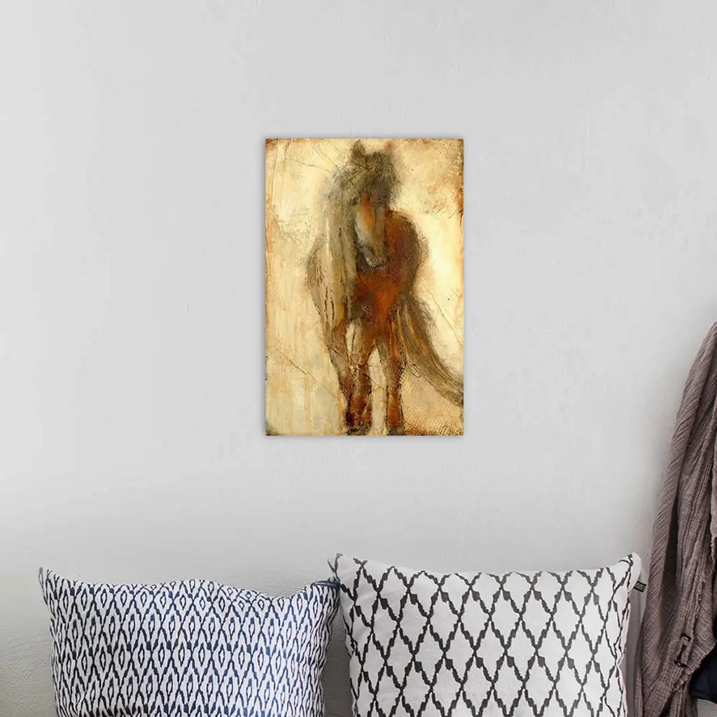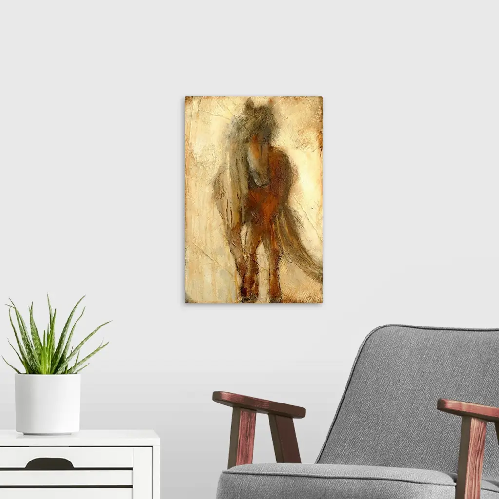 A large contemporary art piece of a horse that includes a lot of texture and warm tones.