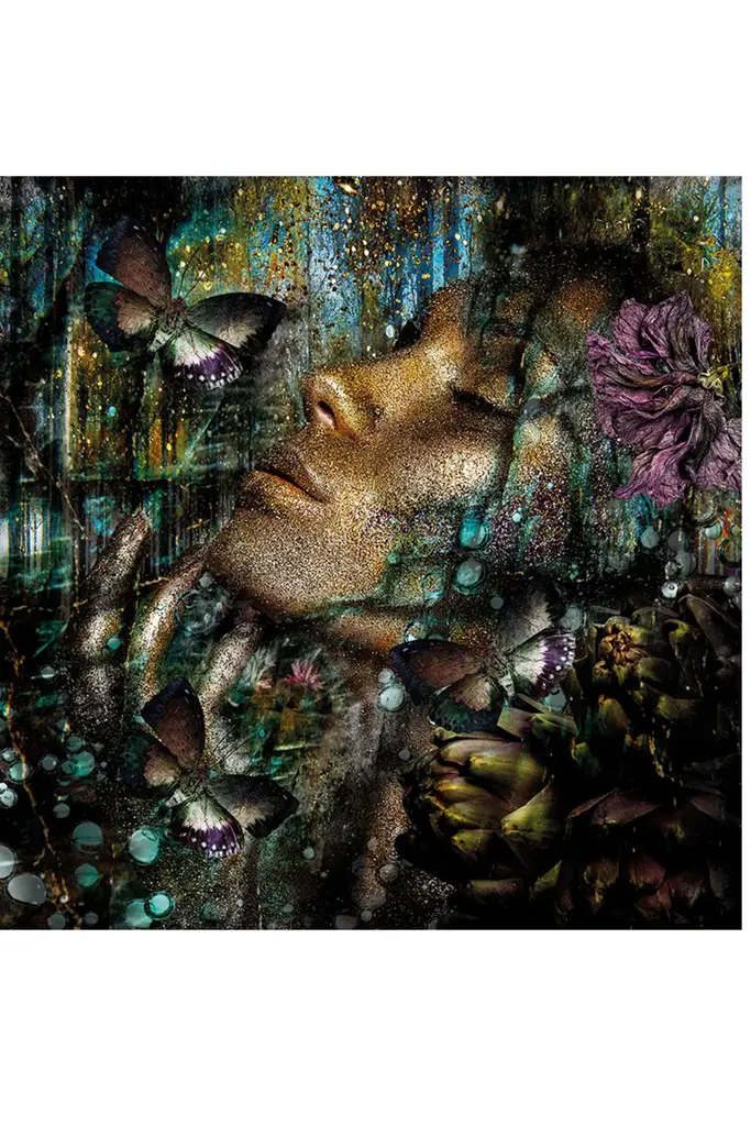 A photographic piece of a woman's face covered in blue shimmering makeup and gems, surrounded by butterflies that add to the mystical appearance. Printed onto smooth plexiglass this artwork has a sleek, glossy finish and is part of our curated collaboration with Cobra Art.