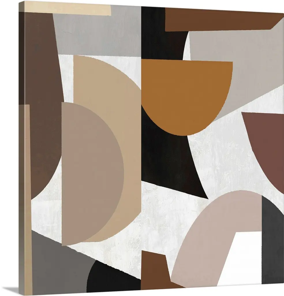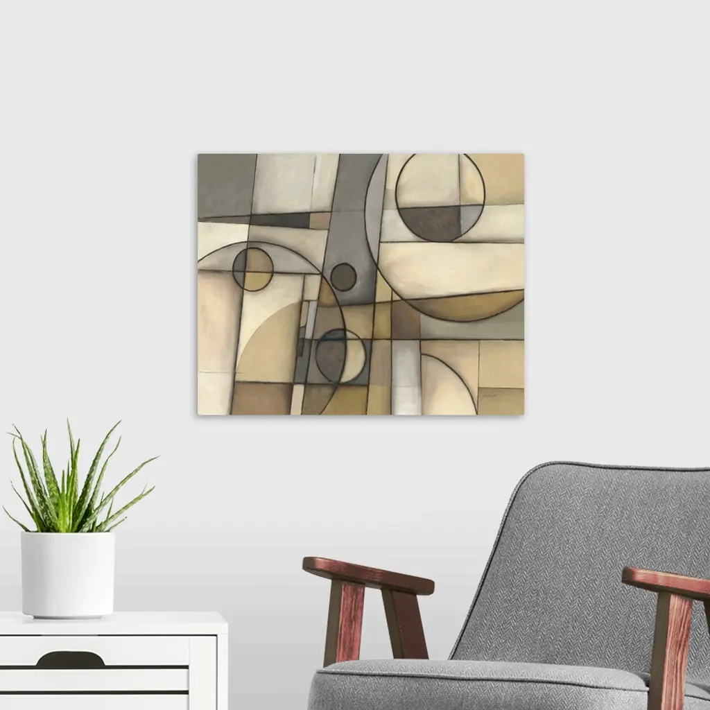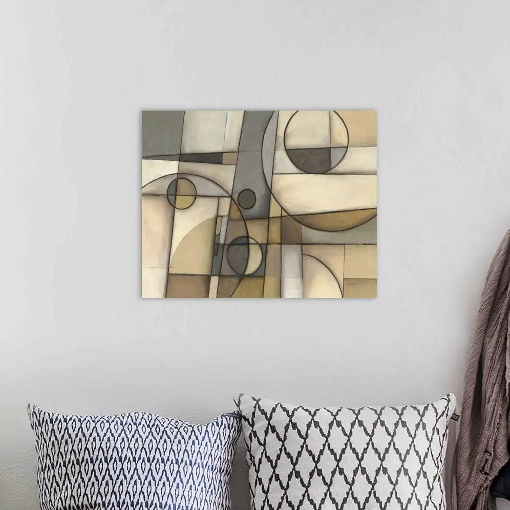 Abstract cubism style painting in neutral colors with geometric shapes.