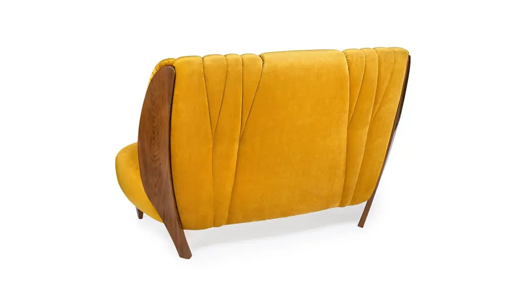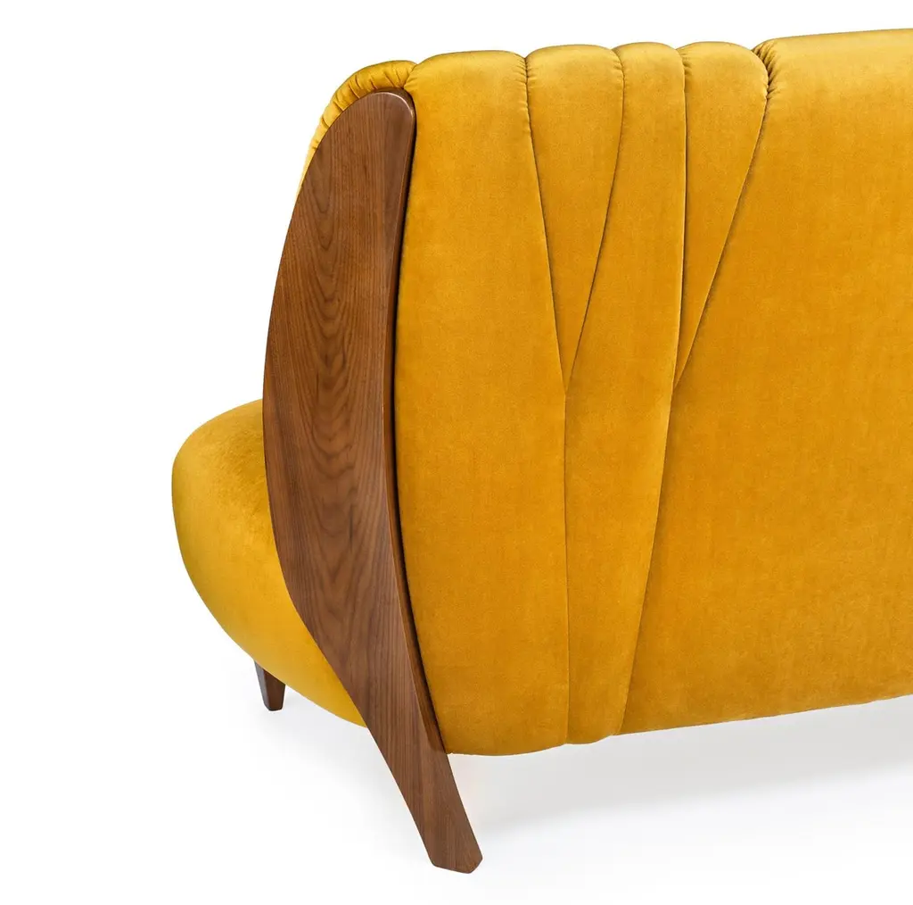 Na Pali 2 Seat Sofa by InsidherLandDimensions: D 82 x W 190 x H 95 cm.Materials: Walnut, InsidherLand Bright Velvet Ref. Gold fabric.45 kg.Available in different fabrics.The Na Pali sofa was designed as the original armchair, evoking the breathtaking landscape of Na Pali coast located on Kaua'i Island.The wooden sides extend as cliffs from the bottom to the top and the front feet get the form of the numerous sculpted needles across the landscape.Created by Architect Joana Santos Barbosa in 2012, InsidherLand is a Portuguese brand of exclusive design. Drawn with the signature of the creator, the impressive range of contemporary luxury furniture, lighting, upholstery and accessories are connected to her personal memories and have been highlighted for their innovative and soulful designs.Joana explores several influences from travels around the world to define her own Land as a place that allows her to translate her perceptions into objects of art.The essence of InsidherLand is presented by two inspiring collections. Beyond Memory Collection is deeply influenced by organic forms of nature, legends and traditional cultures, as for the Identity Collection is molded by forms of Architecture and Art. Both collections are designed as a dialog in which nature meets strong architectural lines to create relaxed and sophisticated interiors surrounded by natural materials and meaningful art pieces.Being positioned in strategic markets of high-end luxury decoration, InsidherLand team is proud of working with the best architects and interior design studios from all over the world who seek for handmade exclusive objects that arouse emotions and stand out in exquisite spaces.We are dedicated with love and enthusiasm into every creation to surprise a sensitive but demanding public. Using the expertise of traditional craft techniques, all creations are made by the hands of Portuguese master craftsmen and jewelers who wisely sculpt them in noble materials, finalizing every detail with elegance and perfection.