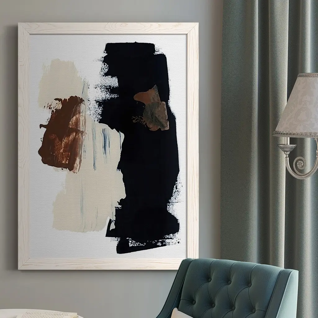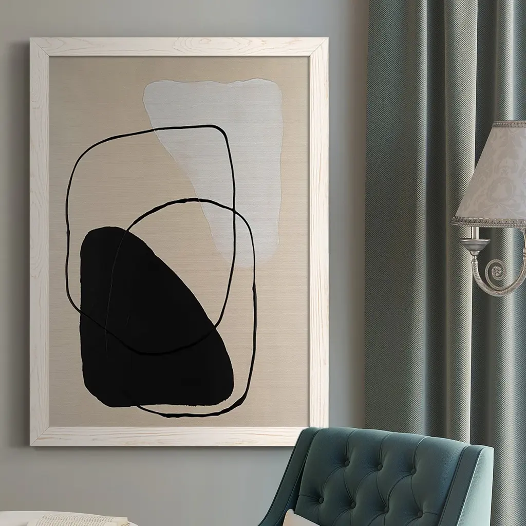 The Lunara Framed Painting from Nadaal Studios is a contemporary abstract masterpiece, blending soft warm tones with muted grey blues in a graceful, layered composition. This high-quality print on paper is encased in a sleek black solid pine frame and protected by tempered glass, ensuring lasting vibrancy and elegance. Whether displayed in a living room, bedroom, or office, this piece adds a sense of depth and harmony, creating a sophisticated focal point in any space.