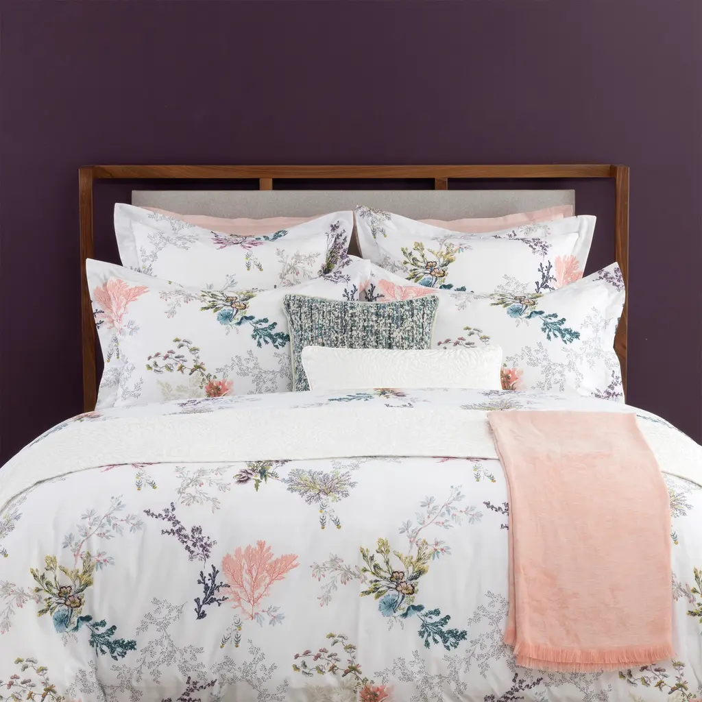 In the clear waters of the fairytale world, naiads bring aquatic plants to life, creating the inspiration for Yves Delorme's exquisite Naiades Bedding Collection. Pen sketches and light watercolors on white cotton batiste decorate the reversible duvet covers, shams and sheets.