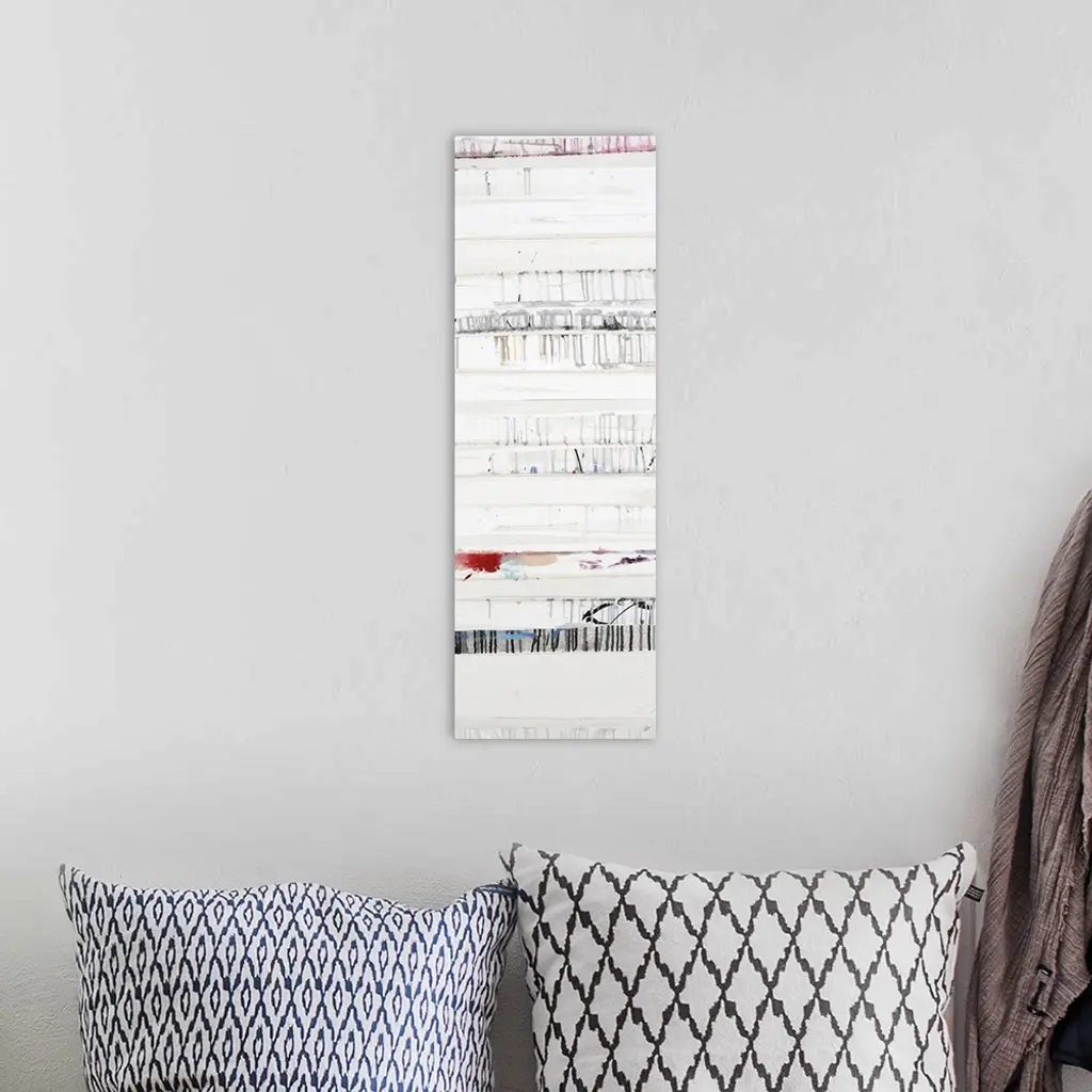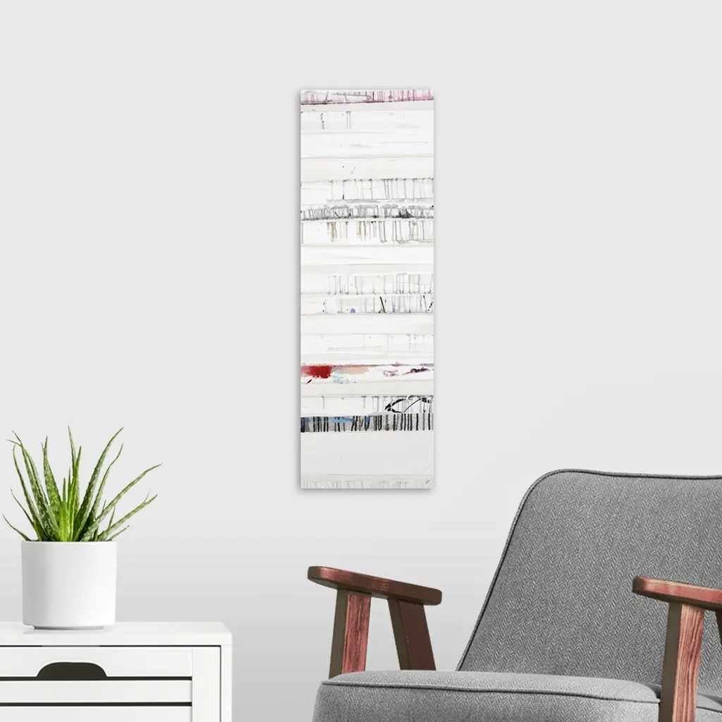 A long vertical painting of horizontal lines with dripped paint textures and subtle colors.
