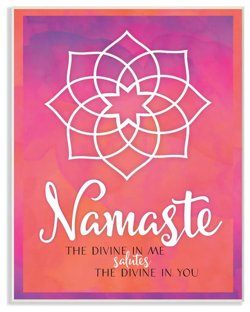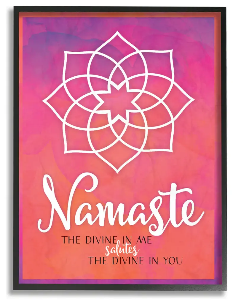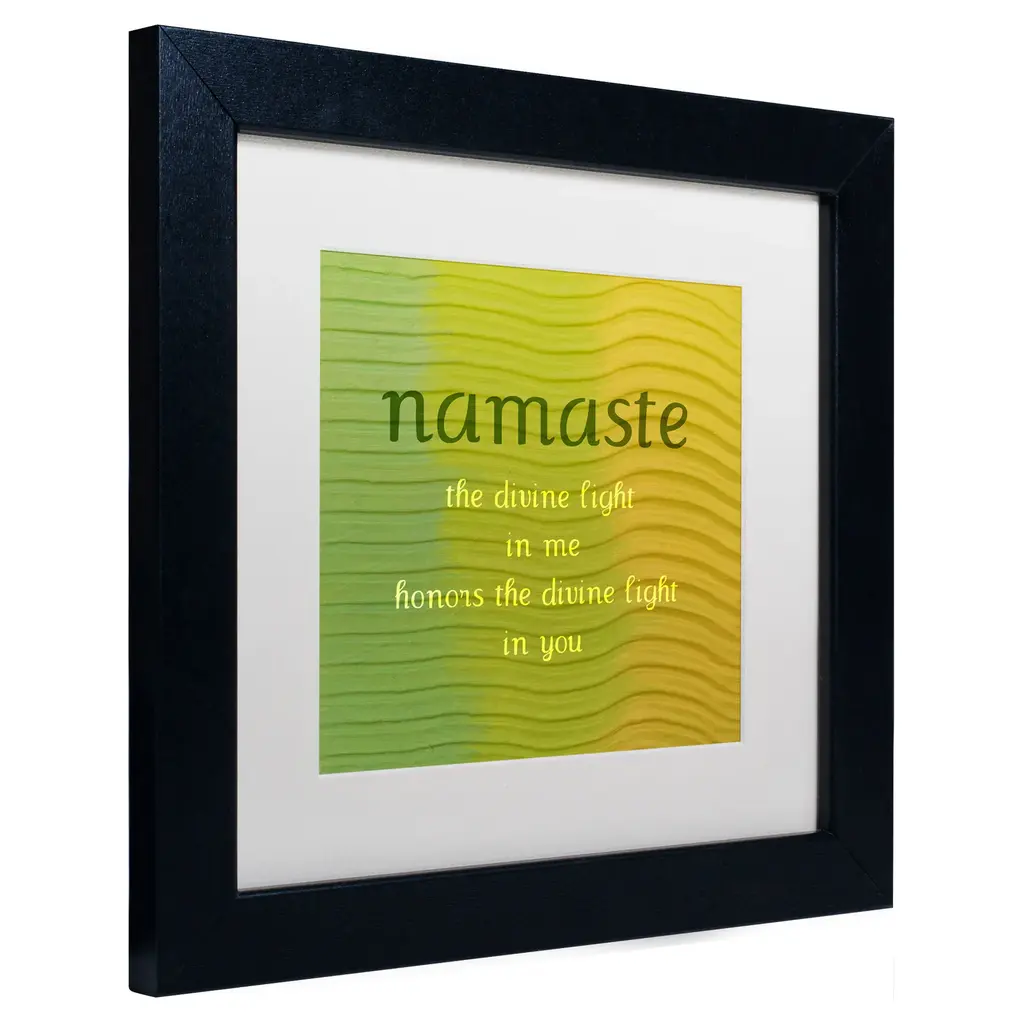 Title: NamasteArtist: Michelle CalkinsProduct Type: Matted Framed Canvas ArtMatte Color: WhiteFrame Color: BlackSize: 11" x 11"Made in the USA.Michelle found solace in the creation of art since childhood. Her influences include Edward Hopper, Andy Goldsworthy, ants, snails and people who paint things on the head of a pin. She is especially impressed with artists who create art that is not permanent, like sand painters and ice sculptors. Michelle's media of choice are oil and acrylic paint, oil pastel, and photography. Having been a professional picture framer since 1990, the presentation aspect of the art world has been foremost on her mind.A 7" x 7" giclee print under acrilyic in an 11" x 11" Black Frame. Giclee (jee-clay) is an advanced printmaking process for creating museum quality fine art reproductions. This high quality print is matted using White Matting and comes in a Black Frame. A clear acrylic facing is added to protect the print. The piece is fully assembled by professional framers and comes ready to hang.