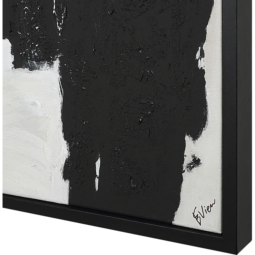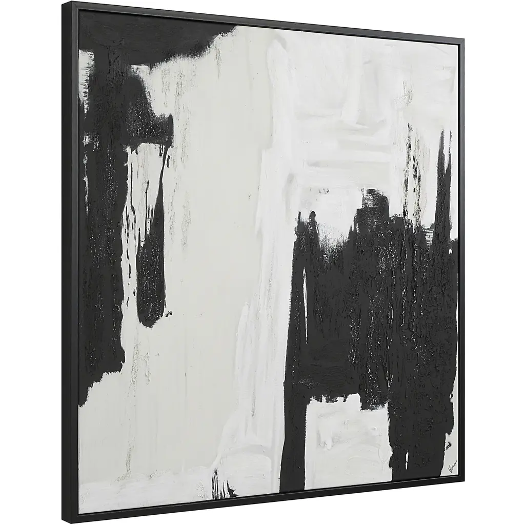 Mixing neutral tones with heavy texture, this abstract painting has what it takes to create a striking focal point in your design project. Bordered by a black frame, its hand-painted cotton-linen canvas will deliver a fresh update to any modern space.