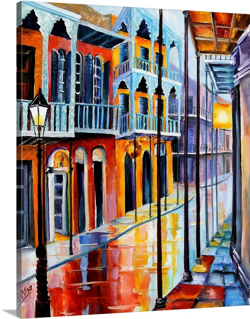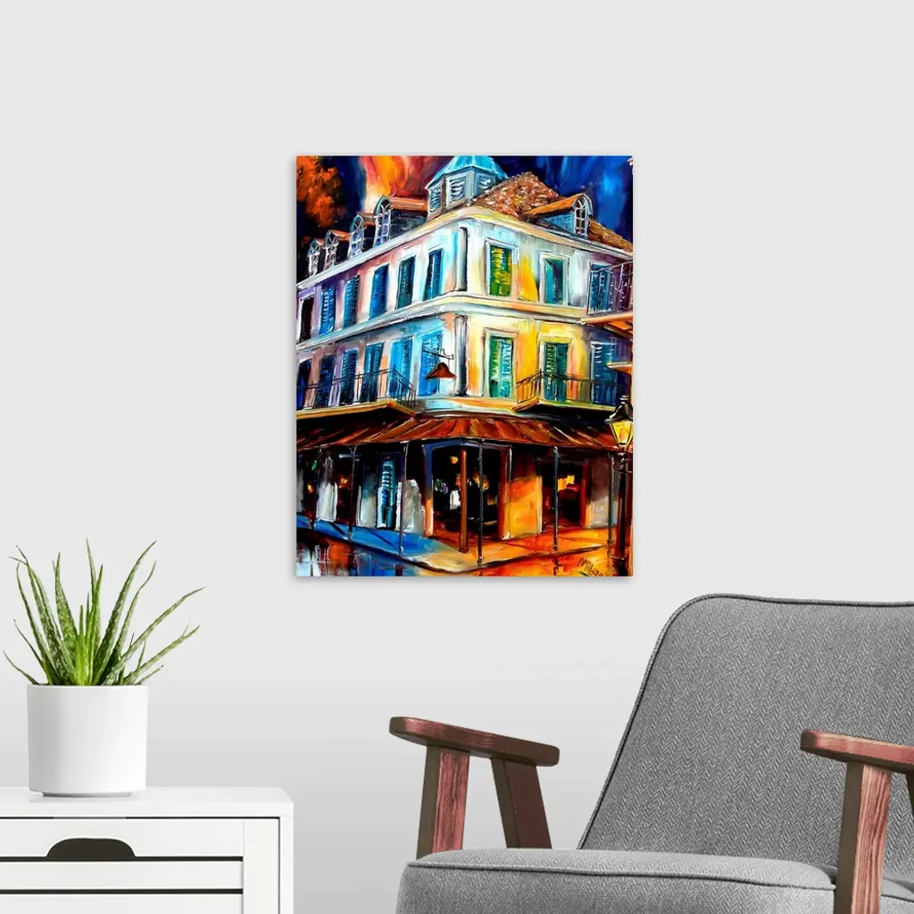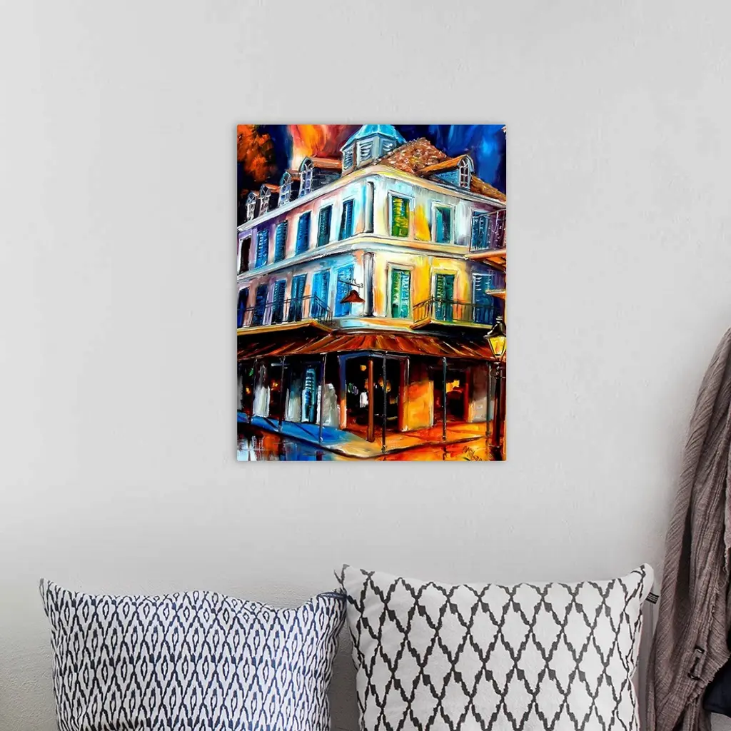 Painting of building on street corner with two story balcony under a dark stormy sky.