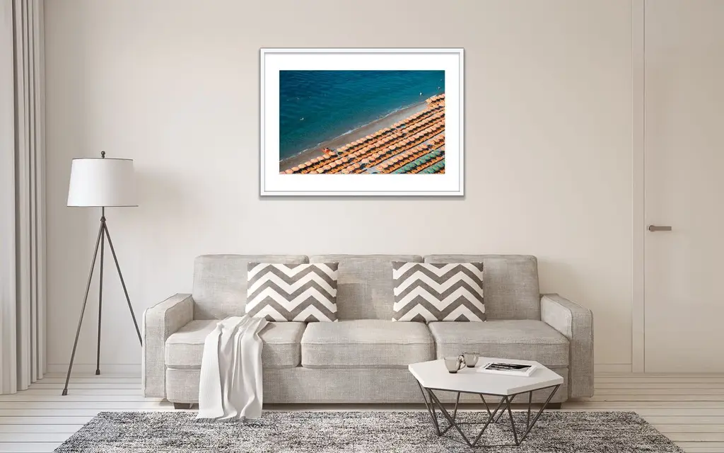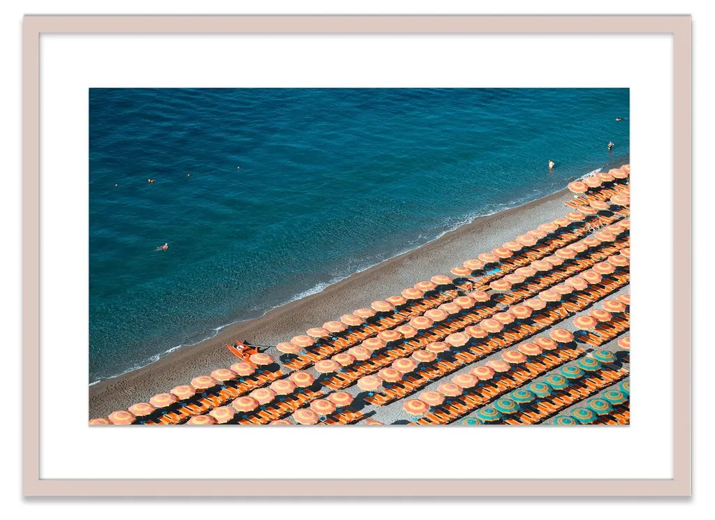 This aerial image from Natalie Obradovich transports the viewer to an idyllic beach on the Amalfi Coast, lined with rows of colorful umbrellas. Printed on semi-gloss photo paper and displayed in a shadowbox frame, this piece arrives ready to hang.Natalie Obradovich is a New York- and Los Angeles-based travel photographer inspired by work in interior design, international trips, and love of all things oceanic. A graduate of USC, Natalie worked for the iconic Kelly Wearstler in Los Angeles followed by tenures in New York under other prestigious interior decorators including Thad Hayes and Neal Beckstedt.