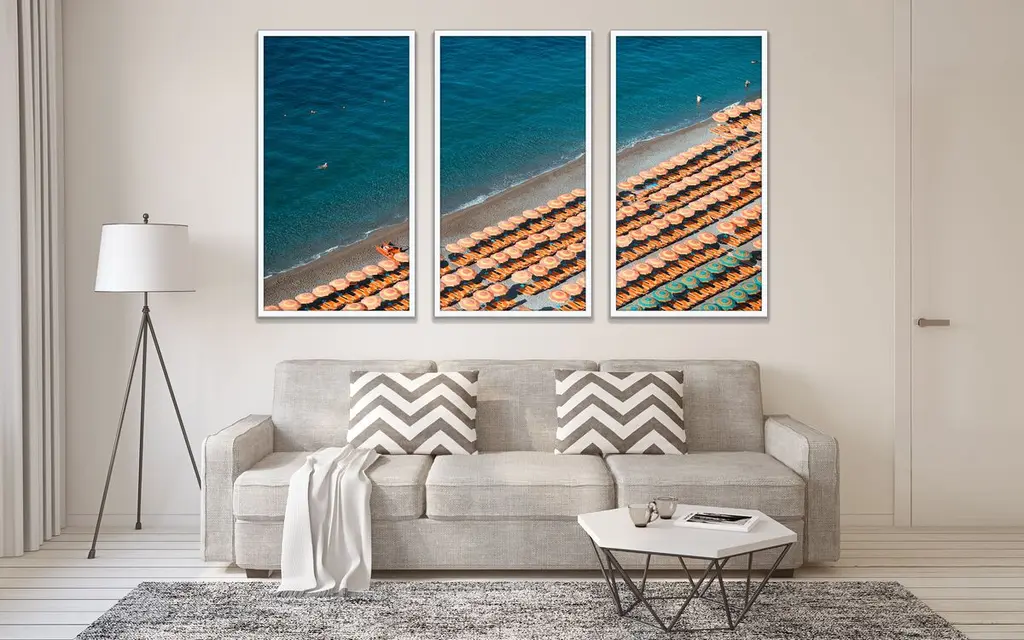 This aerial triptych from Natalie Obradovich transports the viewer to an idyllic beach on the Amalfi Coast, lined with rows of colorful umbrellas. Each component in this set is printed on semi-gloss photo paper, displayed in a shadowbox frame, and arrives ready to hang.Natalie Obradovich is a New York- and Los Angeles-based travel photographer inspired by work in interior design, international trips, and love of all things oceanic. A graduate of USC, Natalie worked for the iconic Kelly Wearstler in Los Angeles followed by tenures in New York under other prestigious interior decorators including Thad Hayes and Neal Beckstedt.