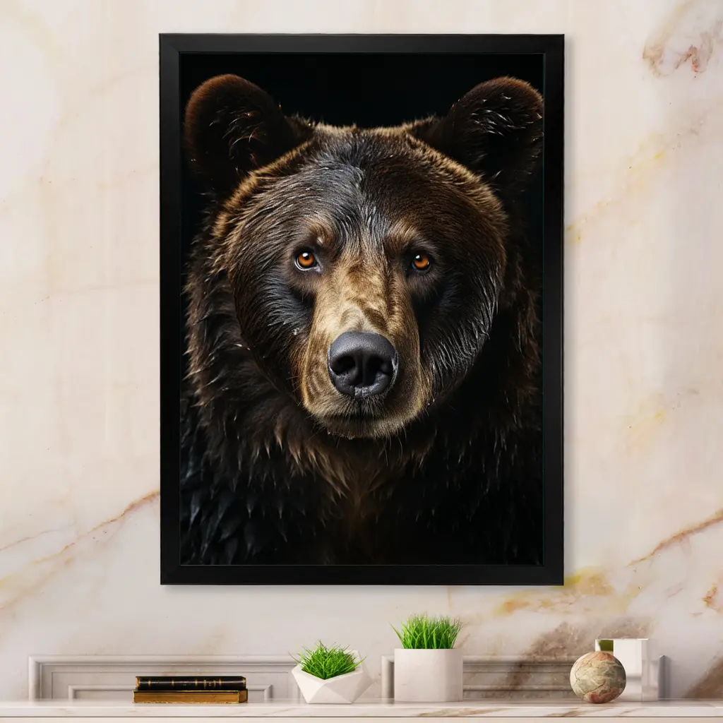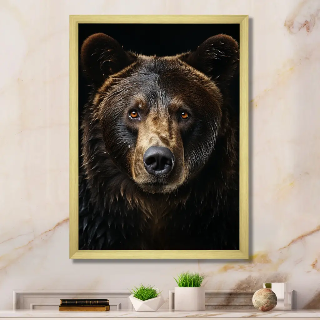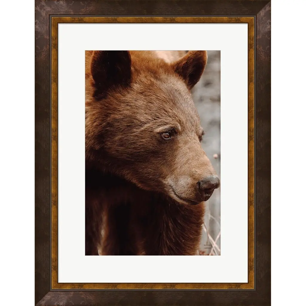 Bear Profile I by Nathan Larson is a high quality piece of framed artwork. The finished size of this piece is 20.5" X 26.5". It has a Bronze Textured Mocha Brown with Bronze Inner Edge frame, is single matted and finished with high quality Acrylic Plexiglass. 100% Satisfaction Guaranteed.