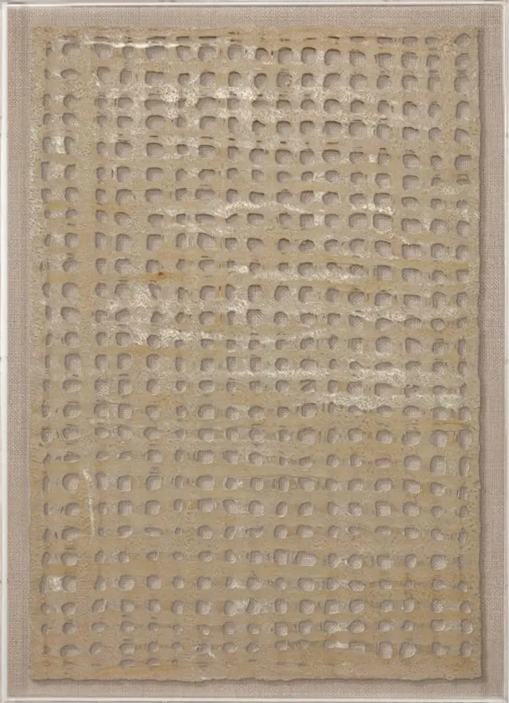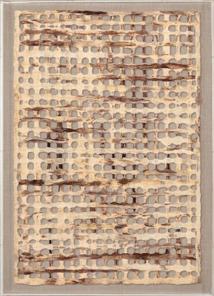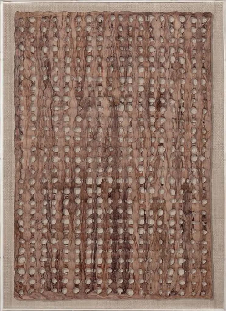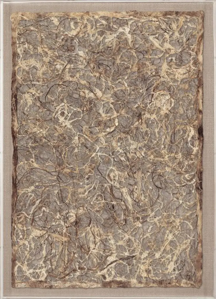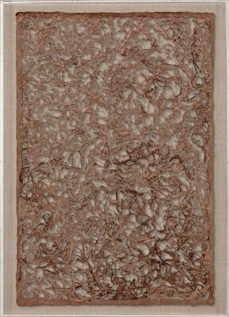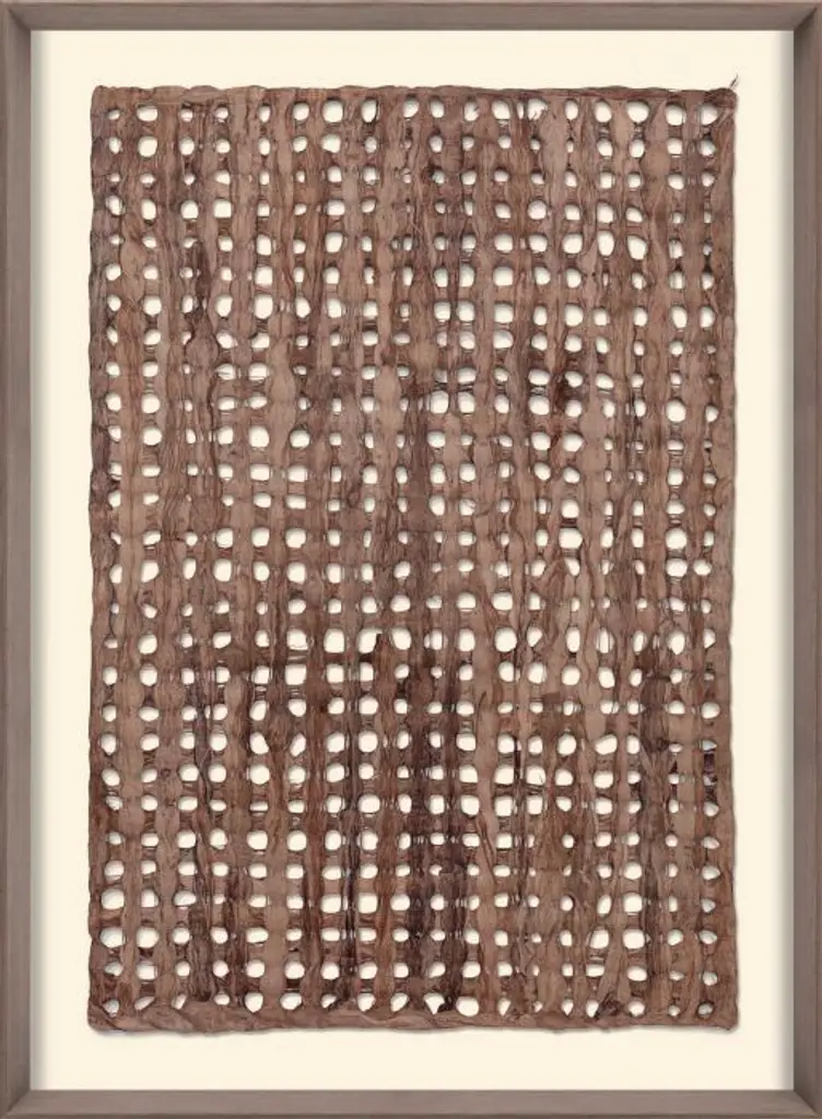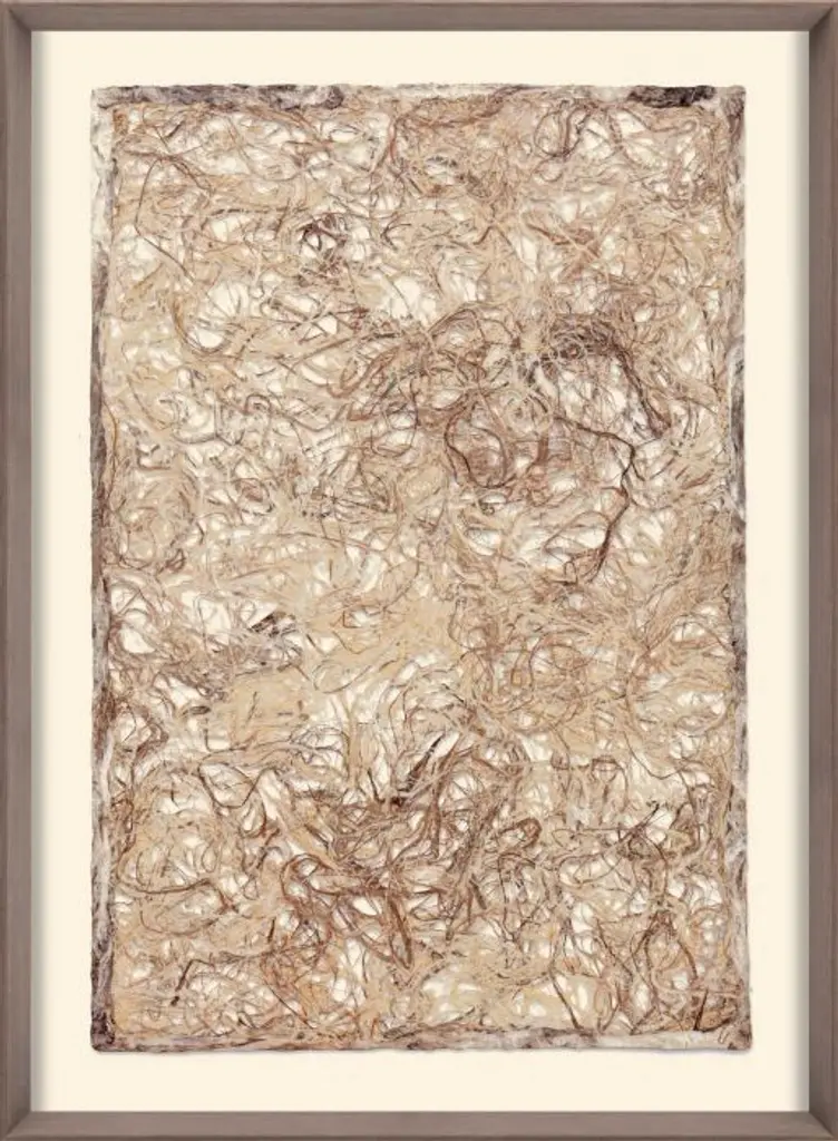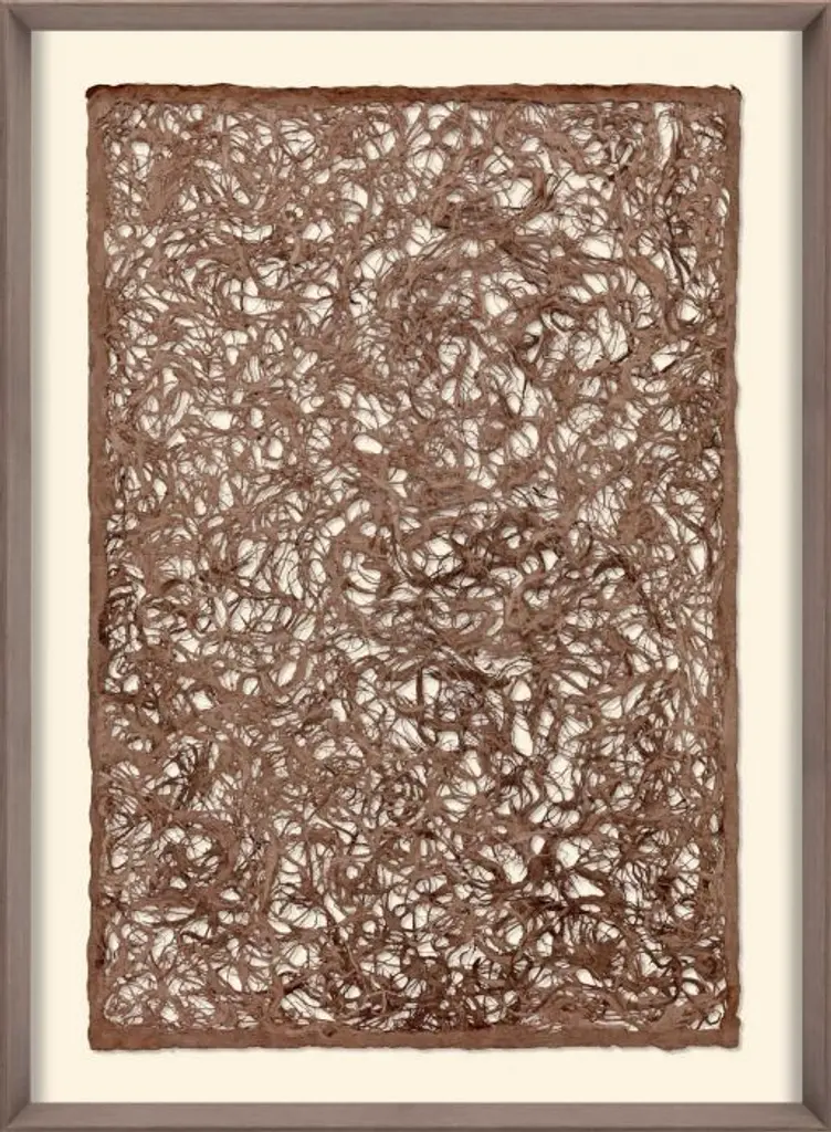 A selection of handmade papers using natural wood and fruit fibers, the art is then floated on a substrate and then framed.