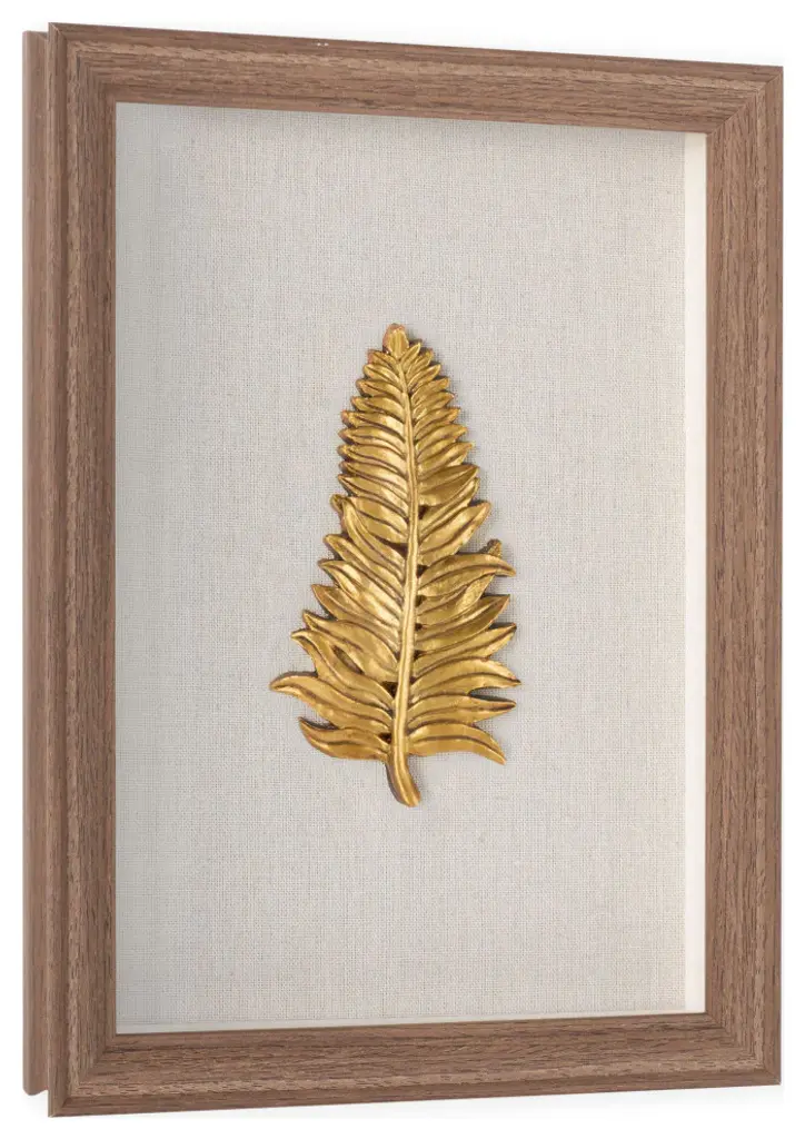 A spirited grace glows from inside this shadowbox. Feathers are painted in gold and then mounted to linen, creating the wind-swept feeling of flight. Dynamic and captivating, these companion pieces are a splendid example of creativity’s bright beauty.