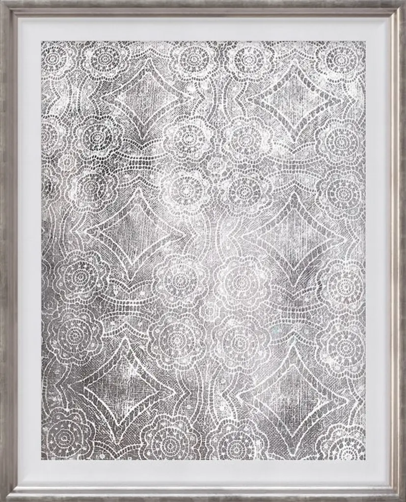 Lace Pattern Silver #1 - artwork by Natural Curiosities This beautiful art is custom made by artisans in California. Framing options include an acrylic box or wooden frame. Also available unframed.See corresponding Lace Pattern Silver 2. Sizing
