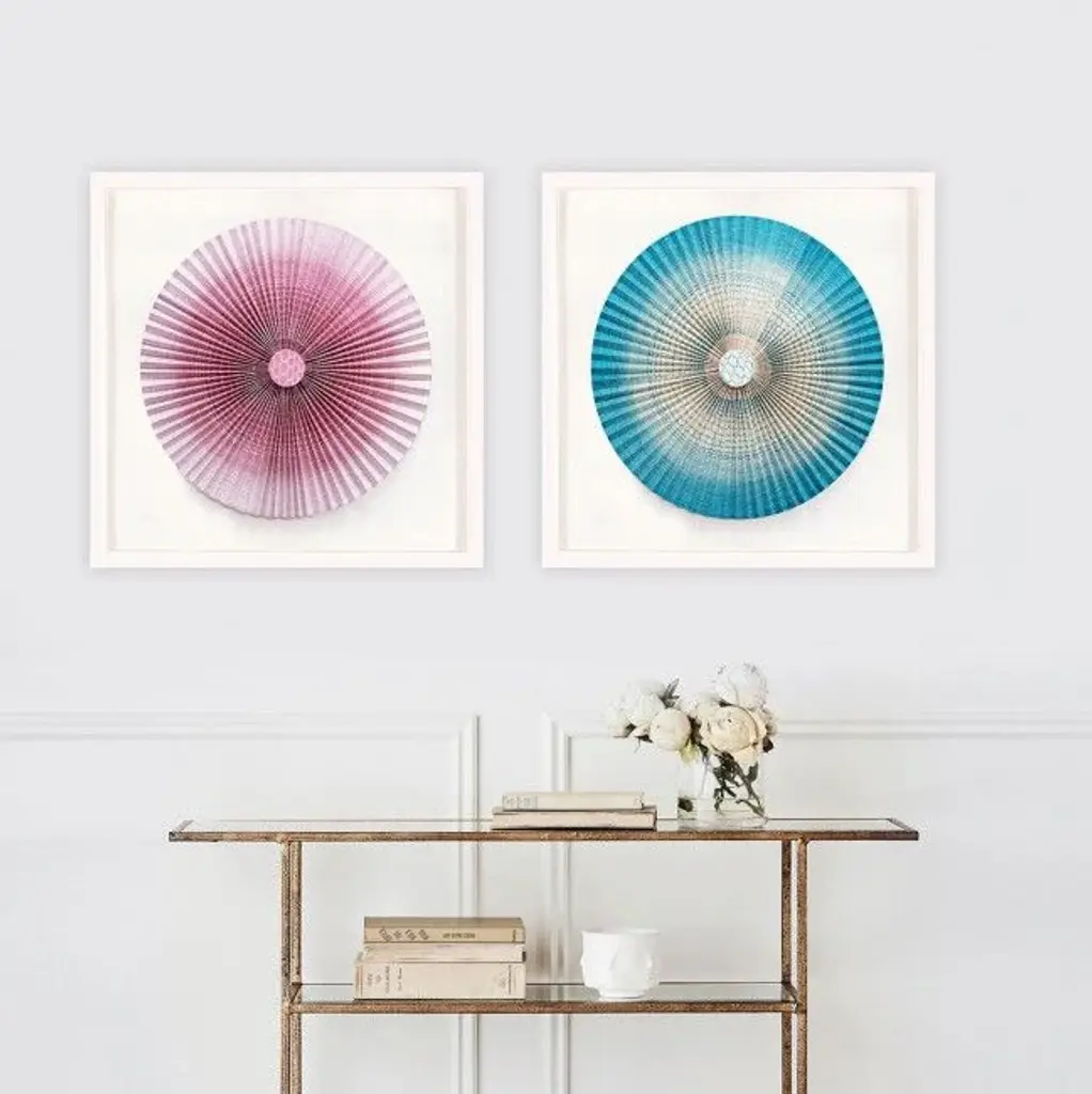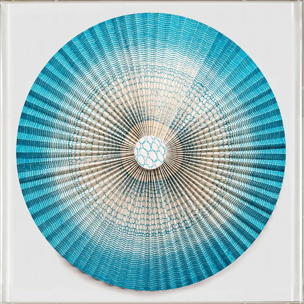 Through meticulous hand folding of lavishly silkscreened Bhutan paper, structure sings in rich texture and ethereal harmony in these graceful geometrics. This art is custom made by Natural Curiosities in California.
