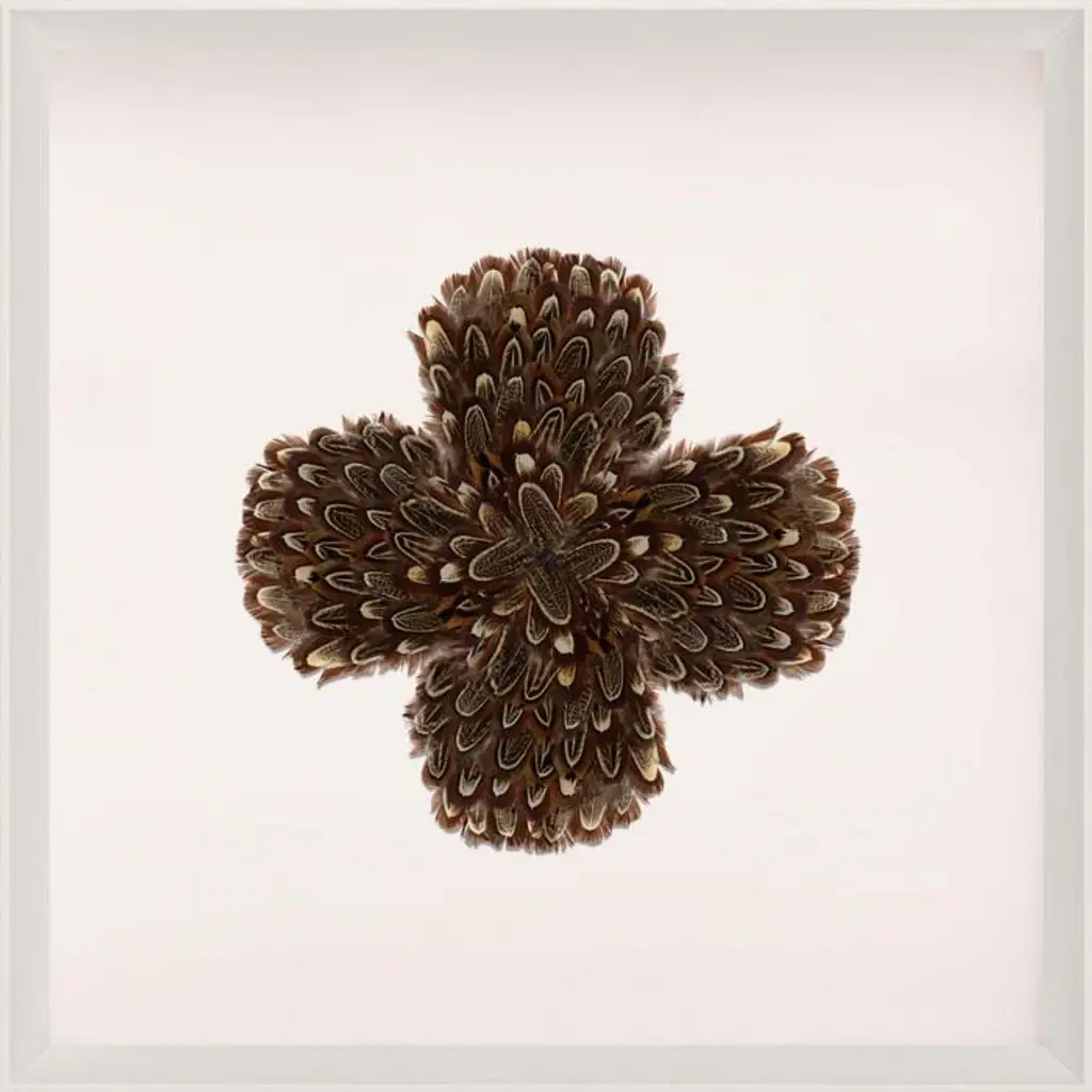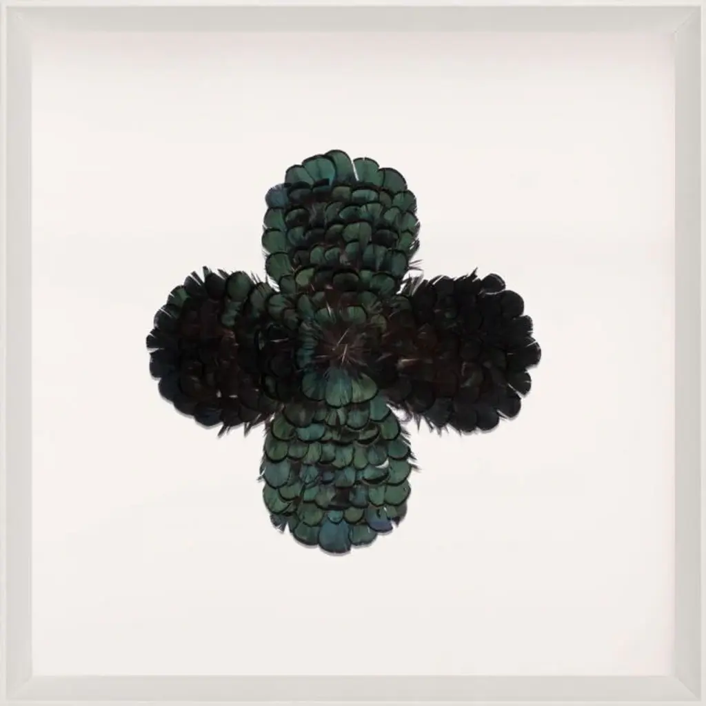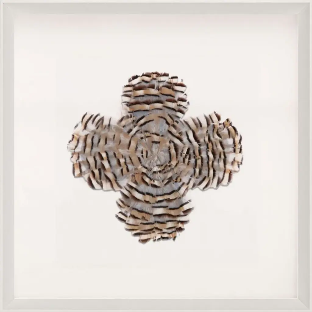 Introducing our newest Queen Victoria Feathers series, this time using real feathers that have been responsibly sourced and creating these magical designs through their amazing feather patterns. Each collection is handmade and each one will have a slight variation based on the unique patterns in the real feathers. Framed and floated in a white wooden frame. Custom made by artisans in California.