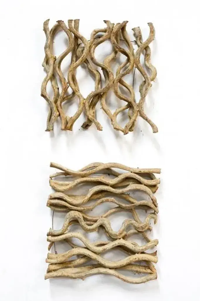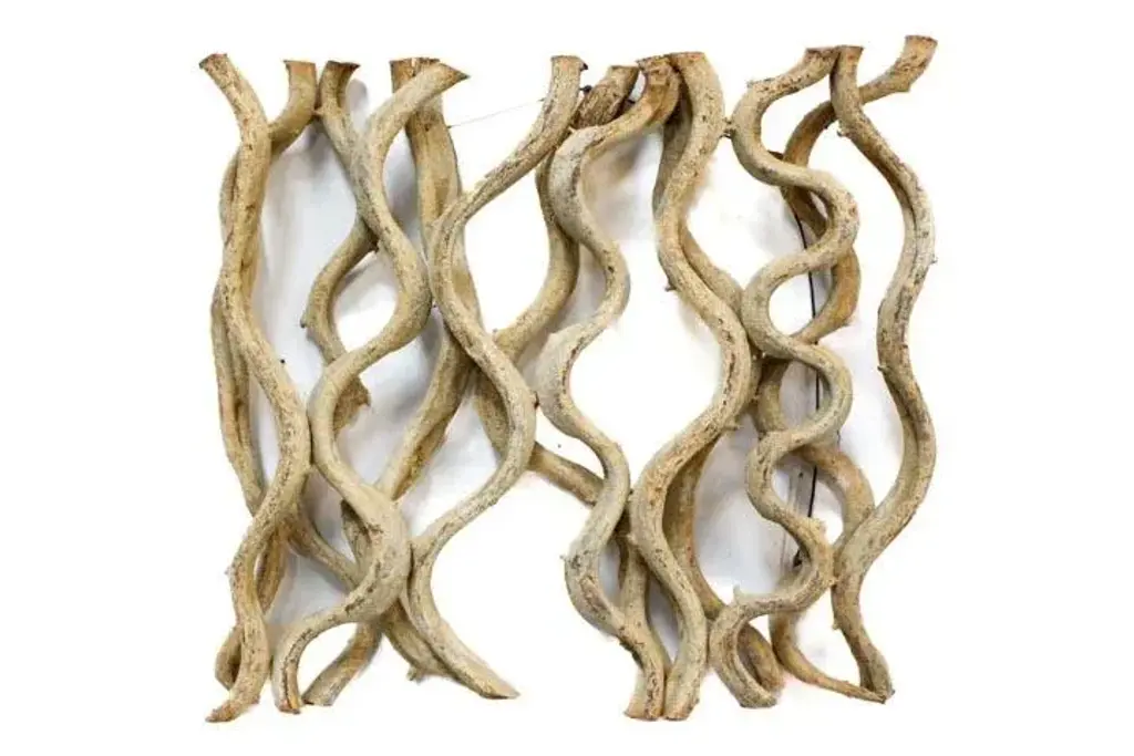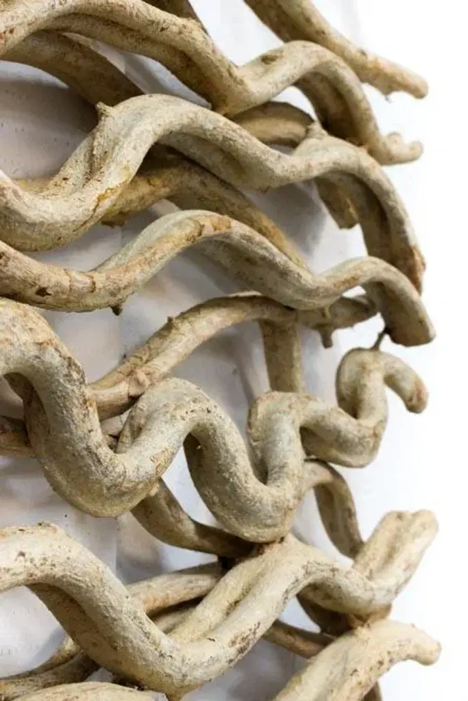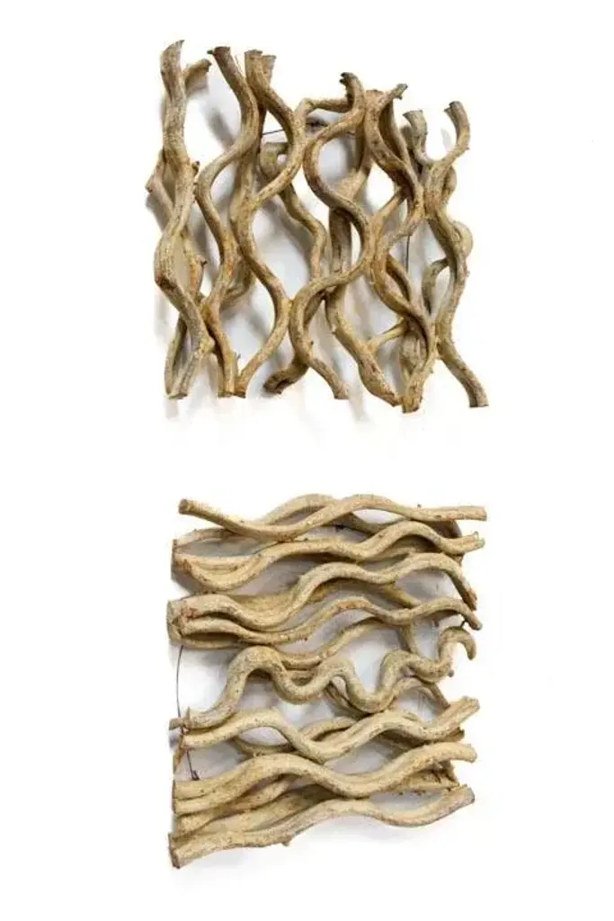 Enjoy these unique handcrafted vine plaques as a grouping or individually. Enhance your home experience with this transitional airy wall hanging. Use individually or combine with our rectangle wall hanging. Balance the elements of the room and add texture. Each item is one of a kind, as a product of nature; coloration throughout will vary slightly, neutral, tan, tones. Vine is arranged in a square pattern measuring 18 x 19 1/2.