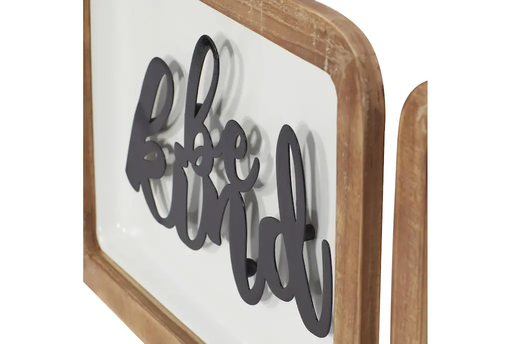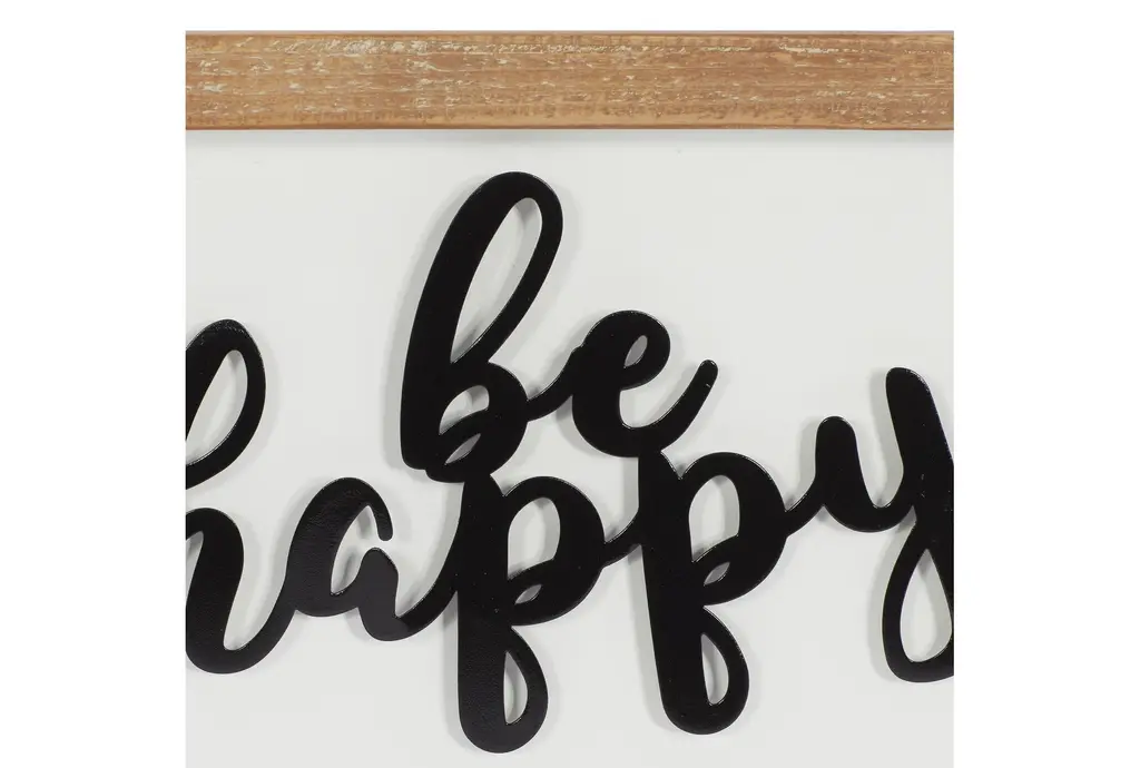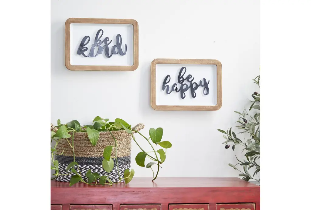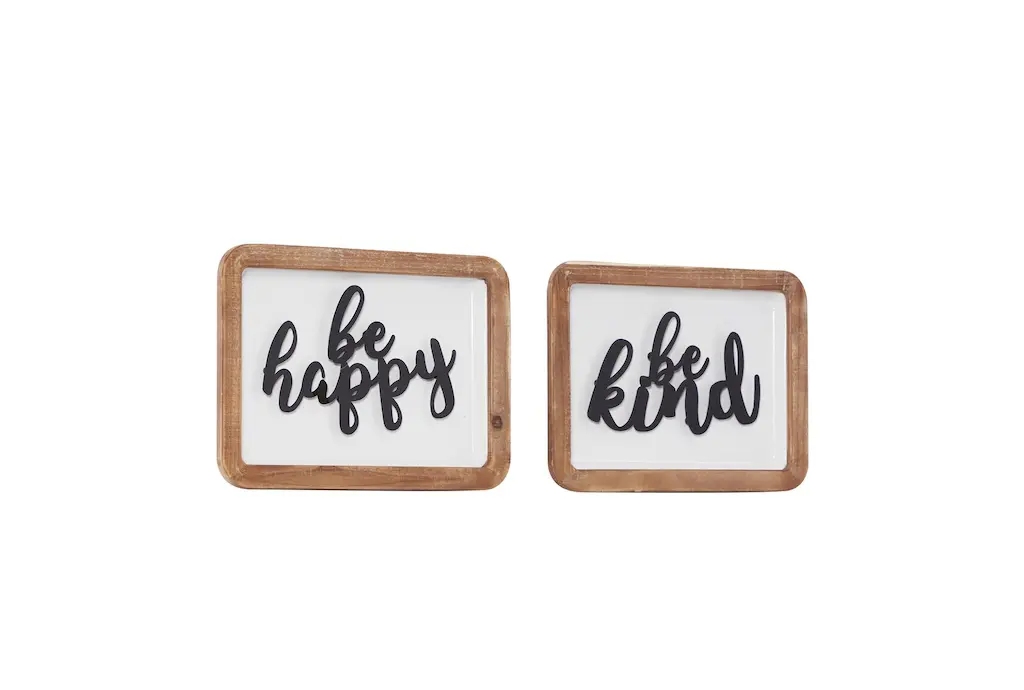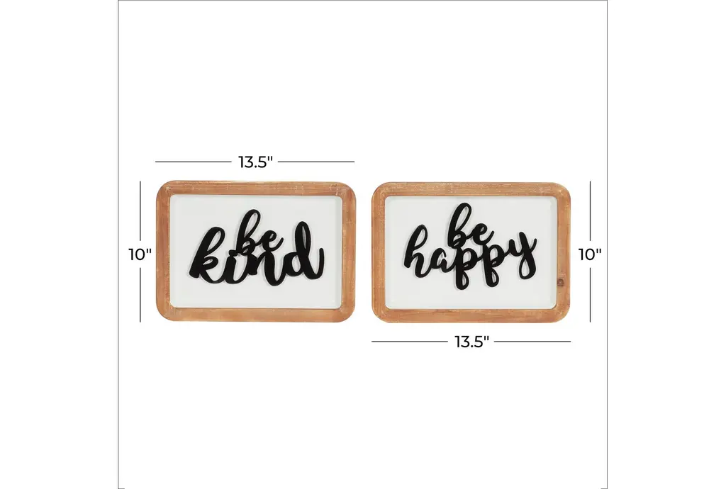 Create an excellent focal point on your walls paired with some cute accent tables, and level up your home with this amazing wall decor . It makes a great centerpiece over your sofa or in your dining room . Display these signs in a farmhouse-style room. These are constructed with floating cut-out letters that seem to pop from the sign. This item ships in one carton. Keyhole hooks each on the back allow easy hanging. Suitable for indoor use only. Each set comes with 2 signs. The signs say, "Be Happy" and "Be Kind.". Farmhouse-themed style.
