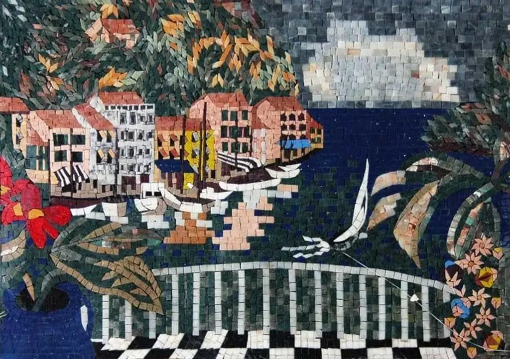 Introducing the Natural Scene Mosaic Marble, an exquisite piece of art that brings the beauty of nature into your home. This handcrafted masterpiece is meticulously created using all-natural stones and hand-cut tiles, showcasing a stunning depiction of a serene landscape. At its heart, the Natural Scene Mosaic Marble illustrates a tranquil scene of charming houses by the sea, with a picturesque bridge arching gracefully over calm waters. Surrounding this idyllic view are vibrant flowers and lush trees, expertly crafted to bring the artwork to life. Each tile is carefully selected and pieced together by skilled artisans, ensuring that no two mosaics are alike. This unique creation not only serves as a beautiful decorative element but also as a conversation starter, inviting anyone who sees it to appreciate the artistry and craftsmanship involved. Perfect for adorning your living room, hallway, or entryway, the Natural Scene Mosaic Marble effortlessly combines elegance with the raw beauty of nature.Elevate your home decor with this one-of-a-kind mosaic that captures the essence of serene landscapes. Whether you're decorating your own space or searching for the perfect gift for a loved one, the Natural Scene Mosaic Marble is sure to impress with its intricate details and vibrant colors.Add a touch of nature-inspired charm to your surroundings with the Natural Scene Mosaic Marble – where art meets nature in perfect harmony. Bring home this stunning piece today and transform your living space into a tranquil retreat.