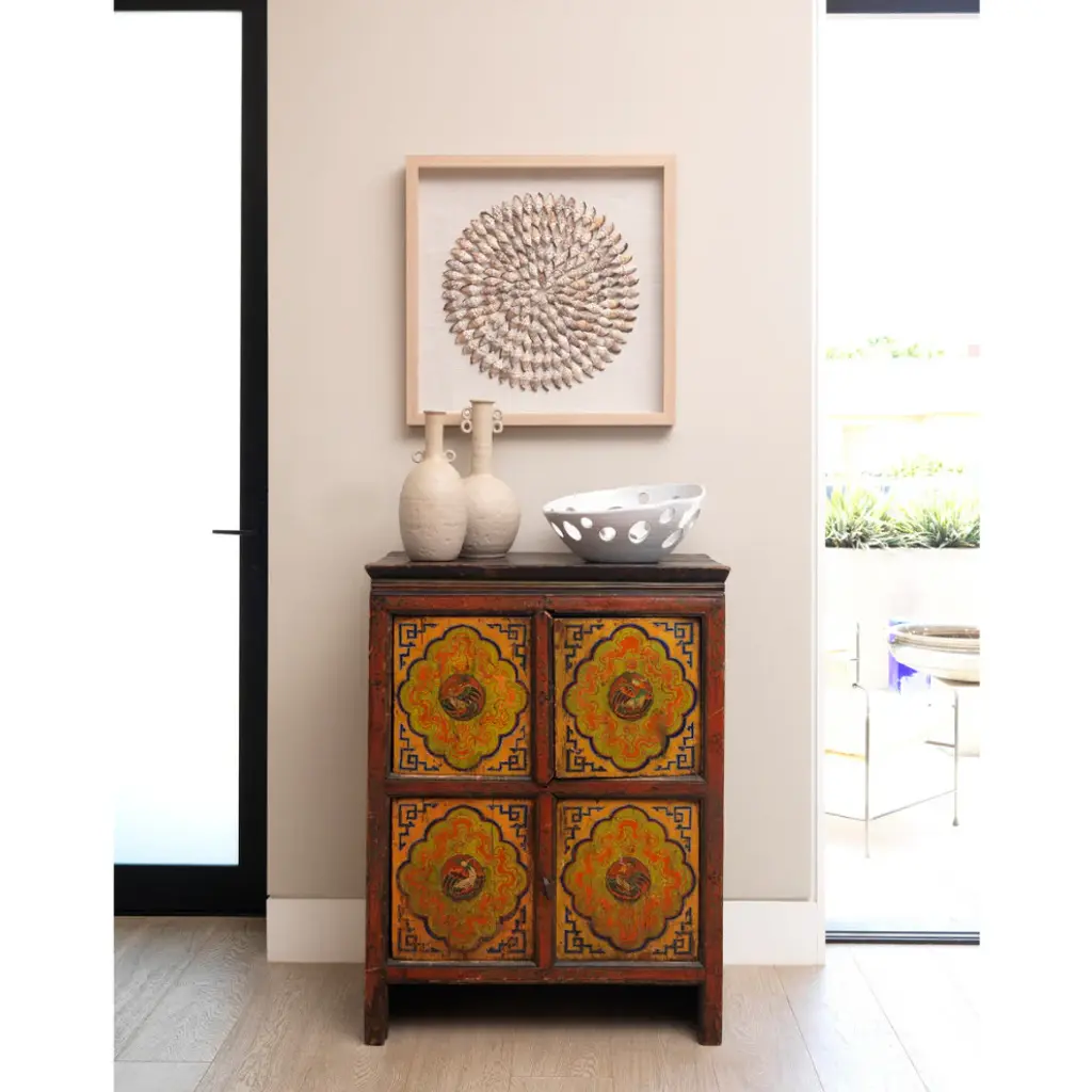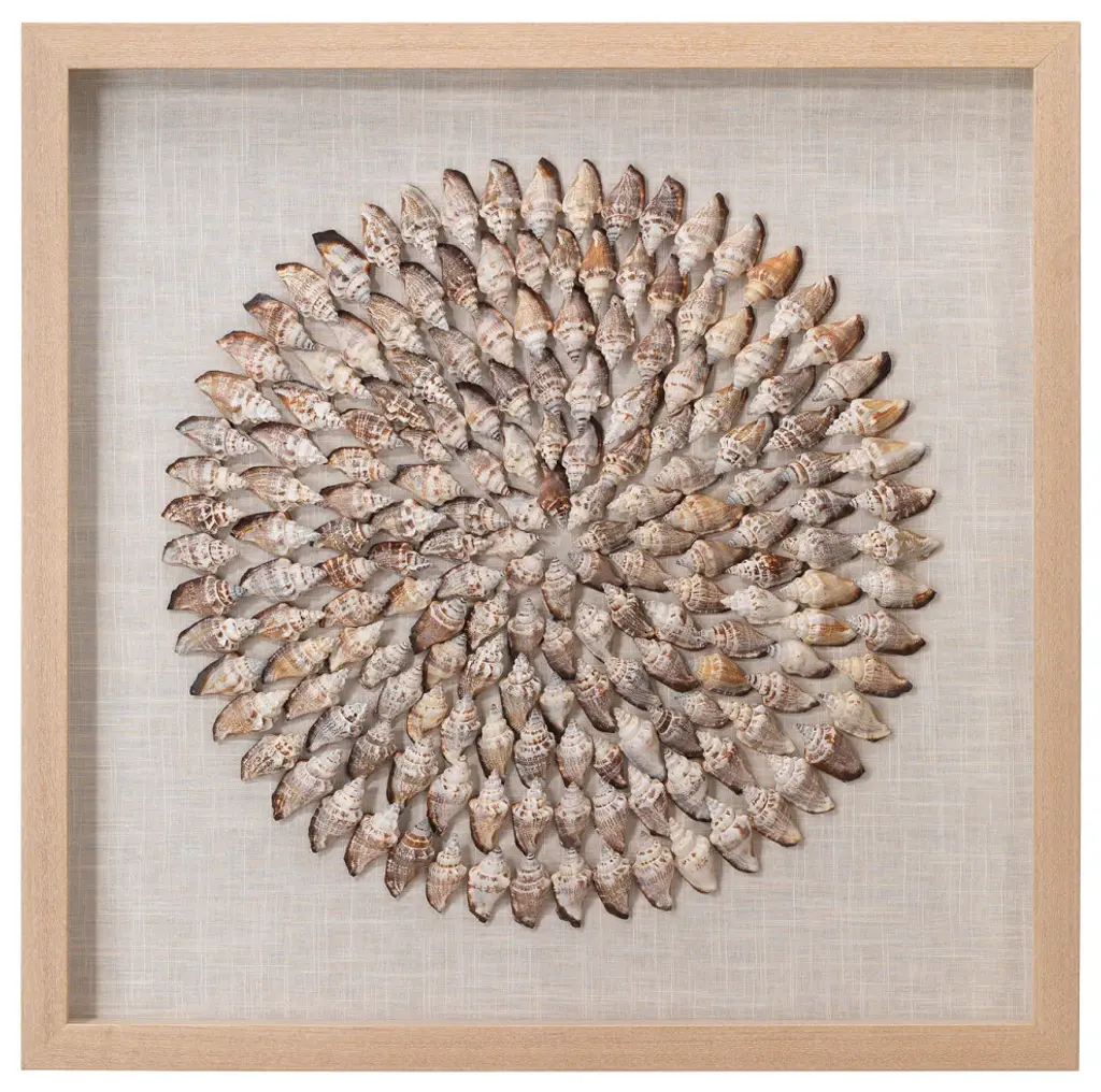 A revolving pattern of unique shell shapes create a circular pattern of organic beauty. Natural colors and textures of radiate outward while drawing you into this stunner from the sea as if this wall art piece washed ashore, specifically for your wall. Use individually, or mix and match with our coordinating shell wall art pieces for a showstopping display.• 23.75" square x 1.75" deep. Weighs 13 lbs.• Natural Shells on Linen Mat with Pine Wood Frame• Because these pieces are made of natural shells, no two are identical. Properly weighted hanging hardware attached.• Heirloom Quality - Expertly hand crafted and hand finished. Due to the hand crafted nature of this piece, each piece may have subtle differences.