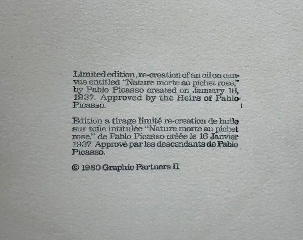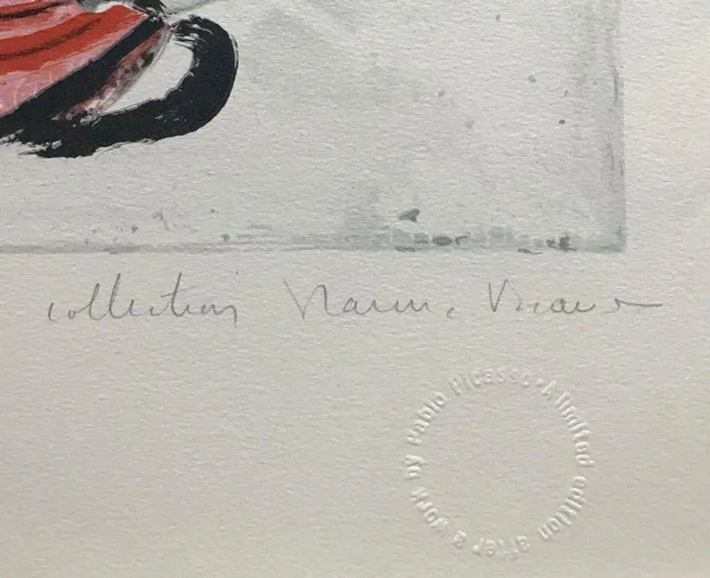Selected from the personal collection inherited by Marina Picasso, Pablo Picasso's granddaughter. After Pablo Picasso's death, his granddaughter Marina authorized the printing of these original lithographs which have come to be known as the Picasso Estate Collection The lithographs were meticulously created after the original works oil paintings watercolors pastels and charcoal drawings by Master Chromist Marcel Salinas who worked closely with Picasso in his lifetime. Lithograph on Arches paper. Hand signed by Marina Picasso lower right and hand numbered lower left. Published by the Estate of Picasso (Marina Picasso) in conjunction with Jackie Fine Arts and printed by Chromist Marcel Salinas with blind stamps lower right and left margin. 'Approved by the heirs of Pablo Picasso' ink stamp on verso. Sheet size 21.5 x 28.5 inches. Image size 16 x 19.75 inches. Please note our gallery has more than 1 of this artwork in stock and the exact edition number you may receive may be different than pictured. Artwork is in excellent condition. All reasonable offers will be considered. About the Artist: Pablo Picasso (Spanish, 1881–1973) was one of the most influential artists of the 20th century. Picasso melded forms he saw in African sculpture with the multiple perspectives he gleaned from Paul Cezanne, to produce Cubism. Not limited to painting, the artist also expressed himself through collage, sculpture, and ceramics. The artist was prolific up until his death on April 8, 1973 in Mougins, France. Today, his works are held in the collections of The Museum of Modern Art in New York, the Tate Gallery in London, the Hermitage Museum in St. Petersburg, as well as institutions devoted solely to his life work, such as the Museo Picasso Málaga, the Museu Picasso in Barcelona, and the Musée National Picasso in Paris.