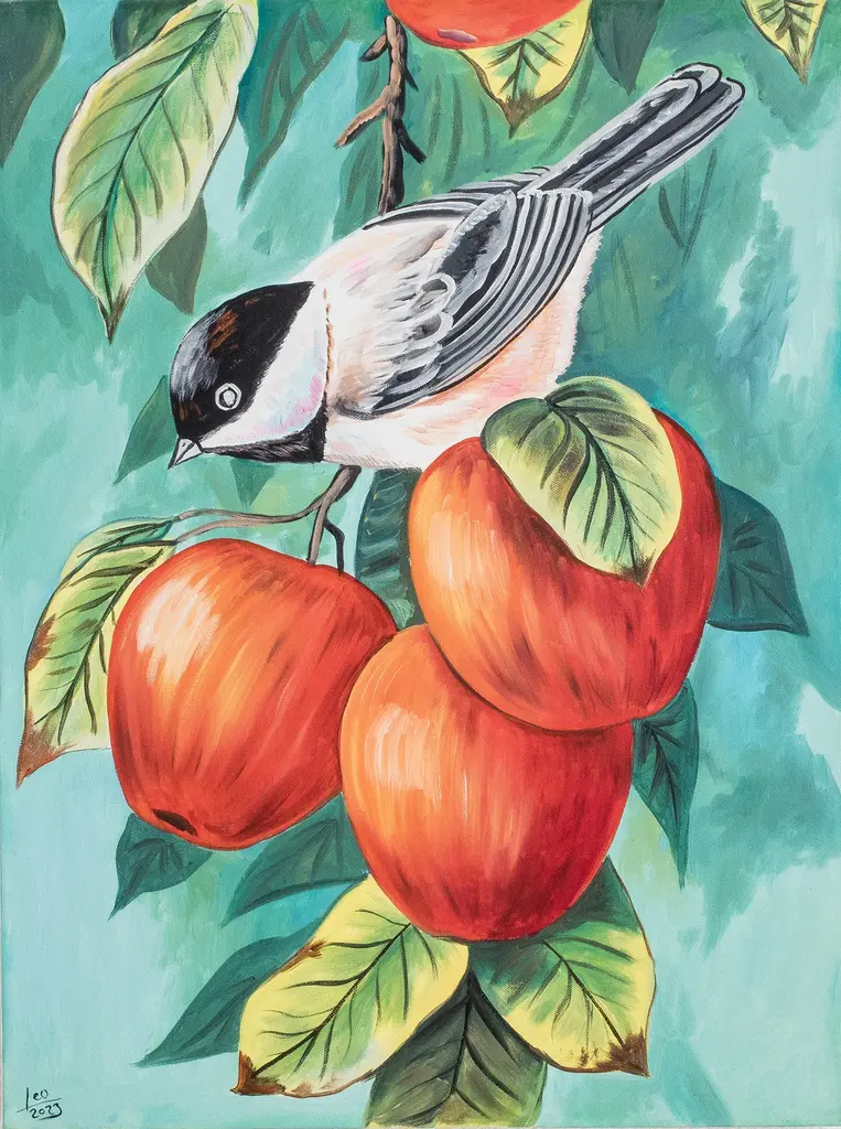 Nature-Themed Impressionist Oil Bird And Fruit Painting- Black-Capped Chickadee