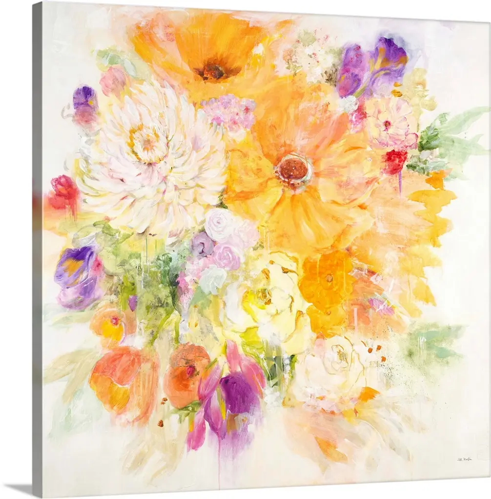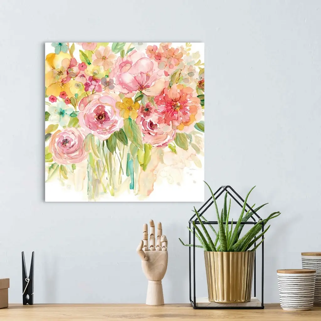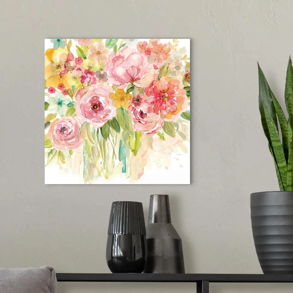 Square watercolor painting of a bouquet of pink and yellow flowers.