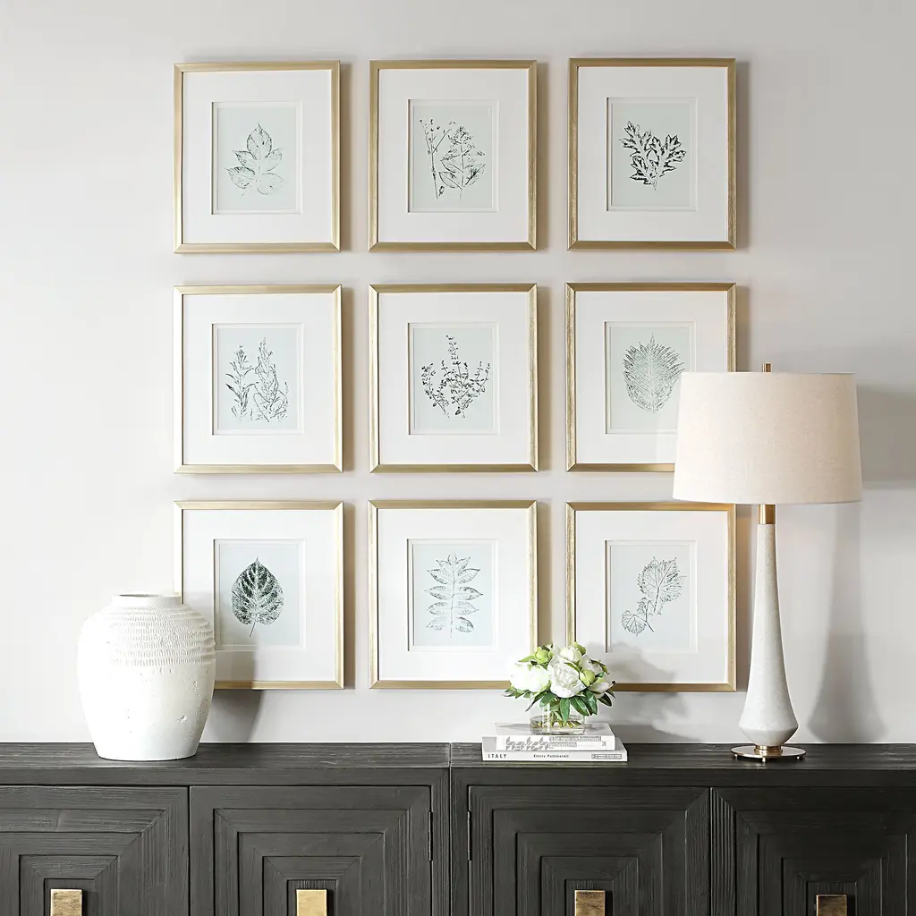 Bring A Touch Of Nature Indoors With This Set Of Nine Framed Botanical Prints. The Delicate Illustrations On Double Cream Mats Are Surrounded By A Gallery Frame With A Gold Finish. Each Piece Is Placed Under Protective Glass.