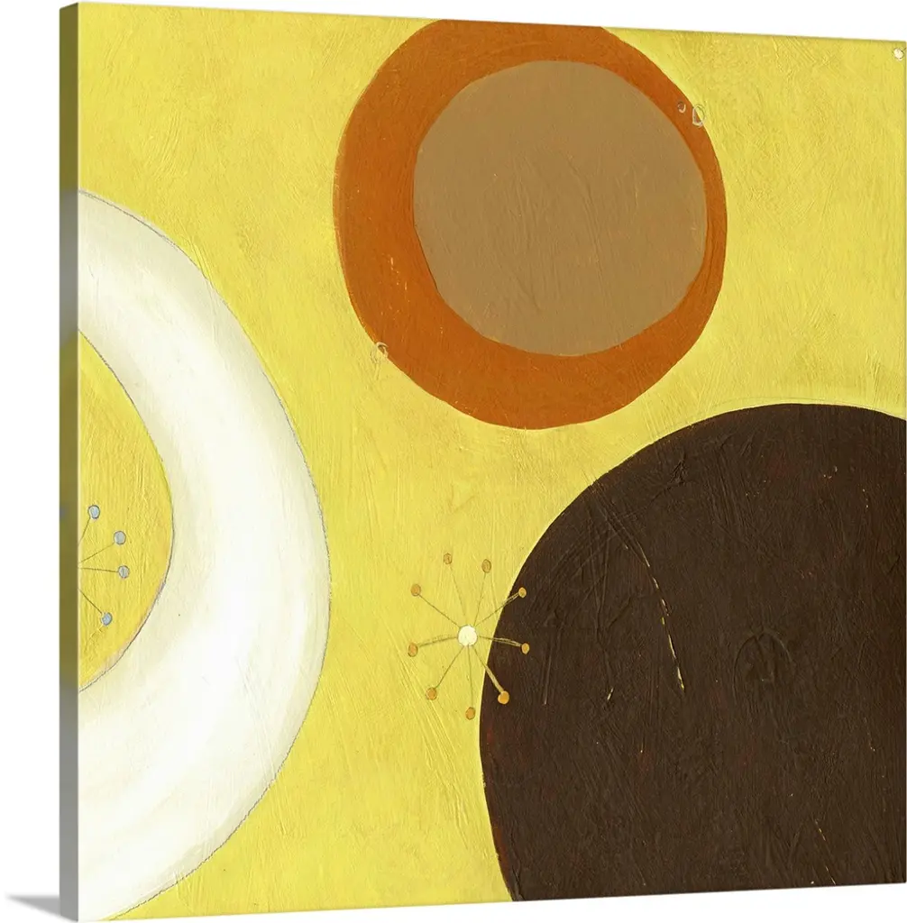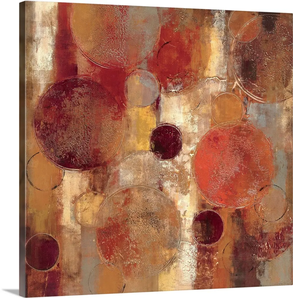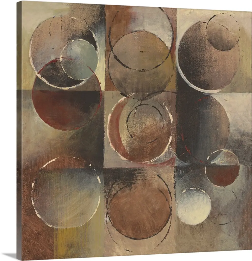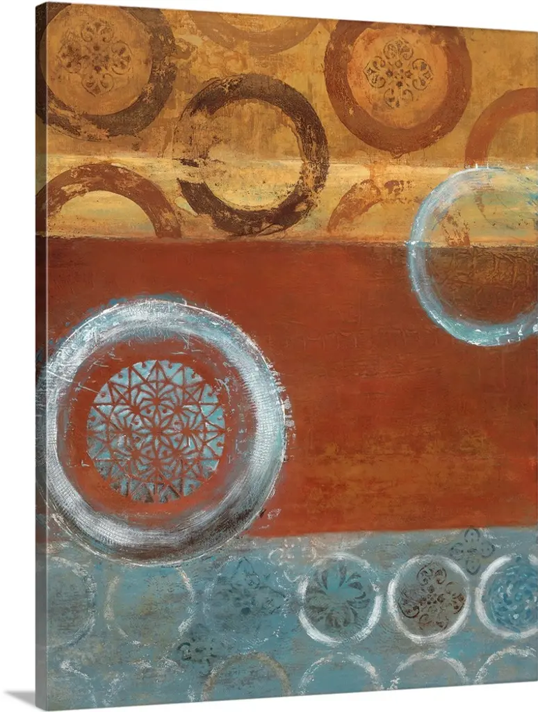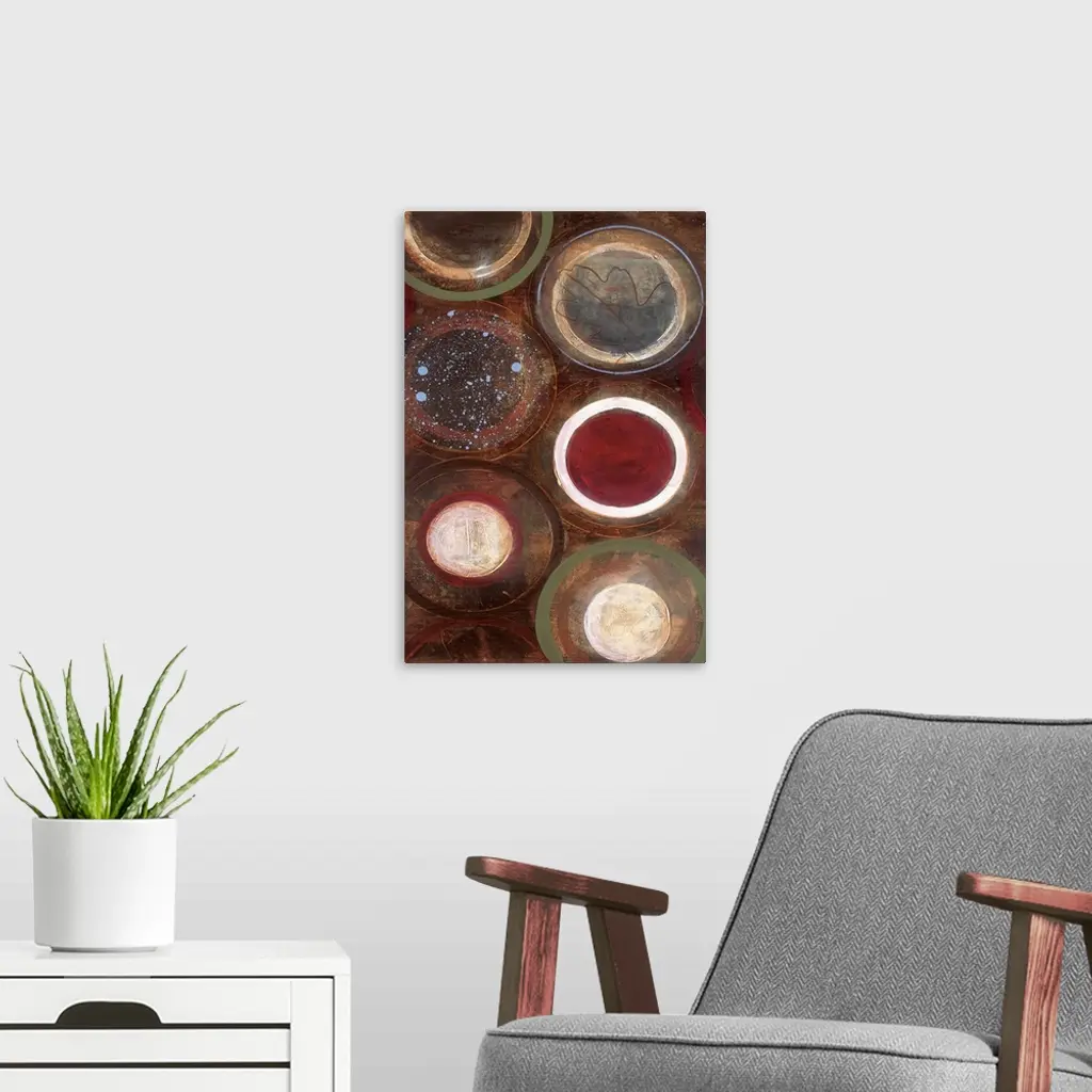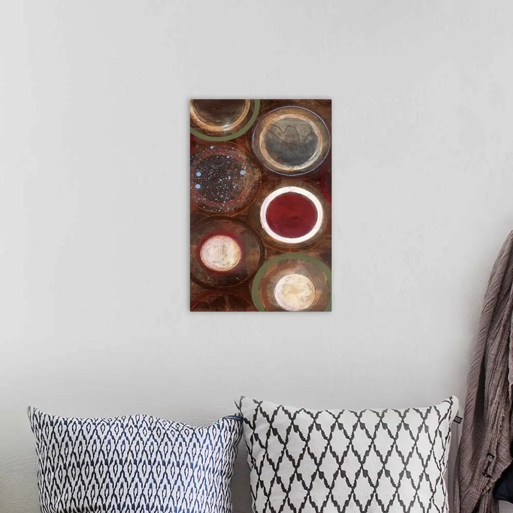 Vertical modern painting of circles in multiple colors with speckles of blue paint overlapping.
