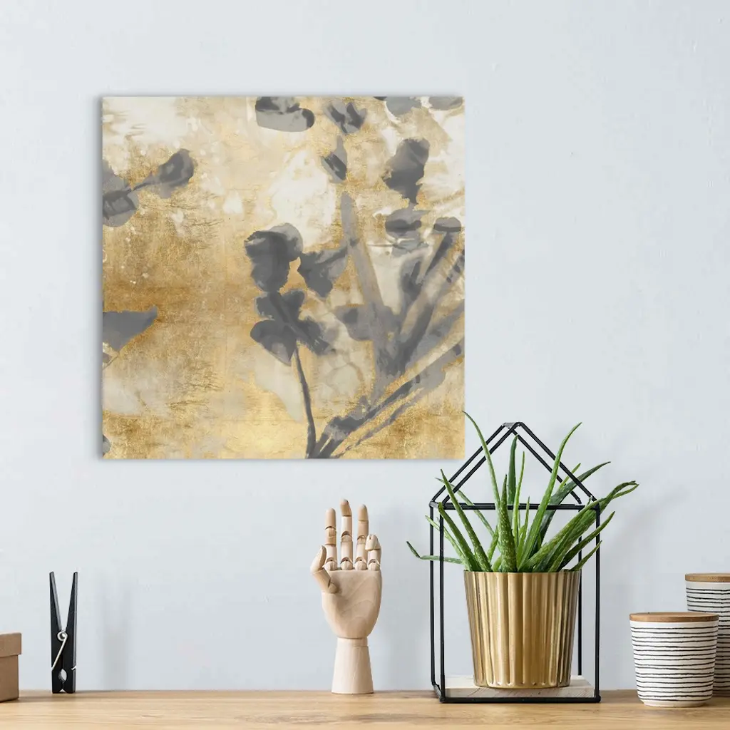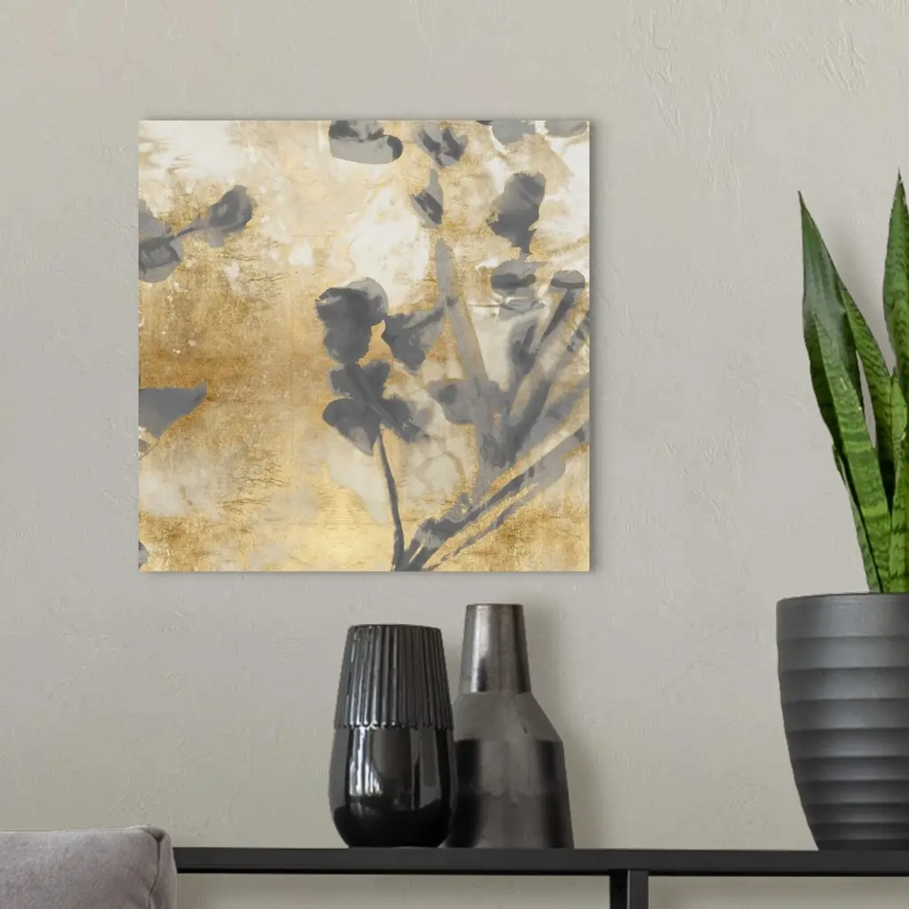 Contemporary artwork featuring soft gray petals over a foil textured background in shades of gold.