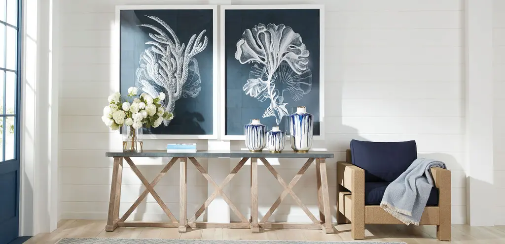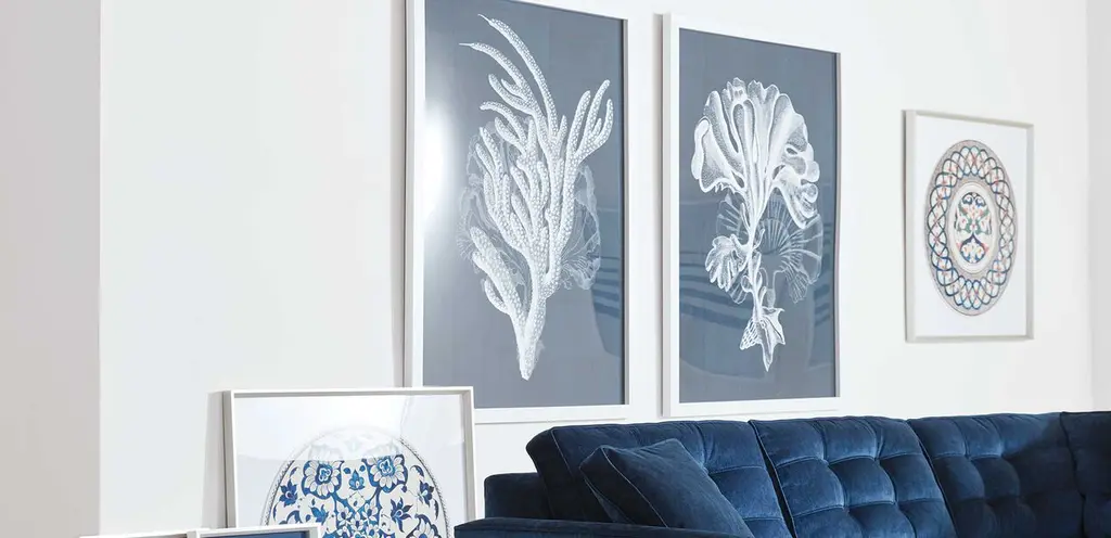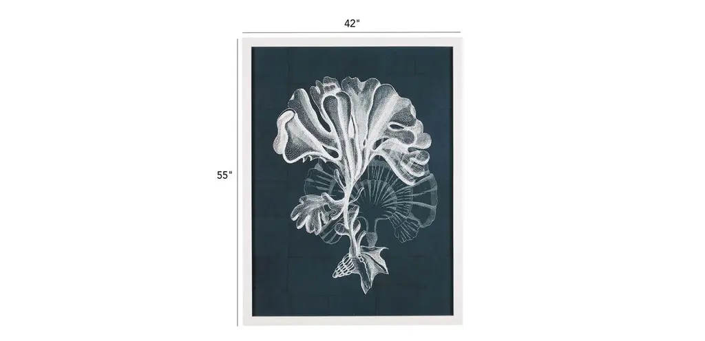 Stylized yet eerily lifelike, this example of coral wall art is a compelling piece that captures the uncommon grace of this underwater beauty. The reverse painting technique – white on a black ground – makes it especially impactful. Printed on paper, the over sized nautical print (one of two in a series) is displayed in a simple acrylic frame.