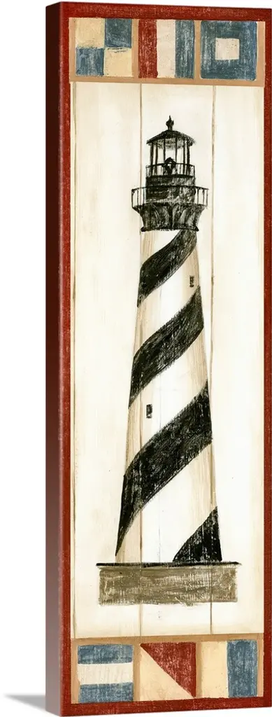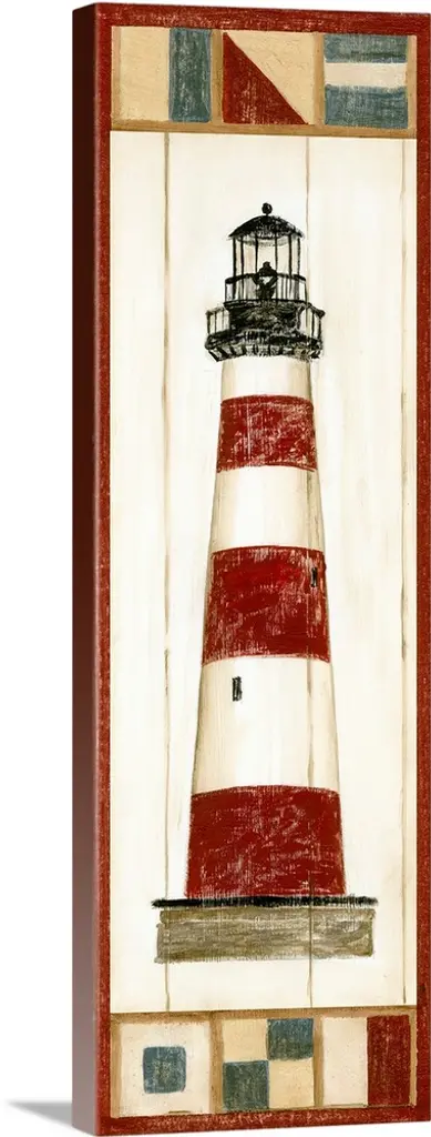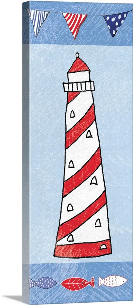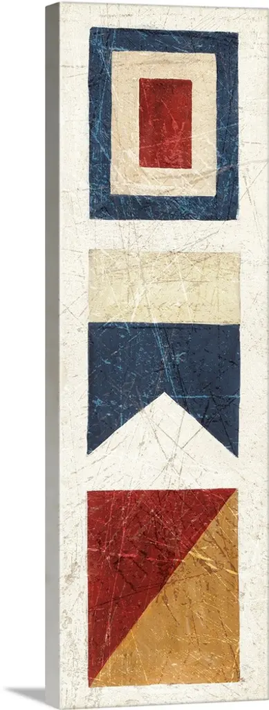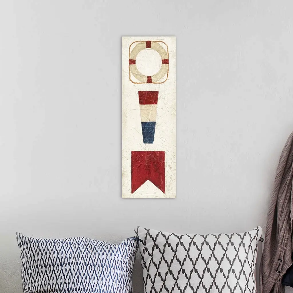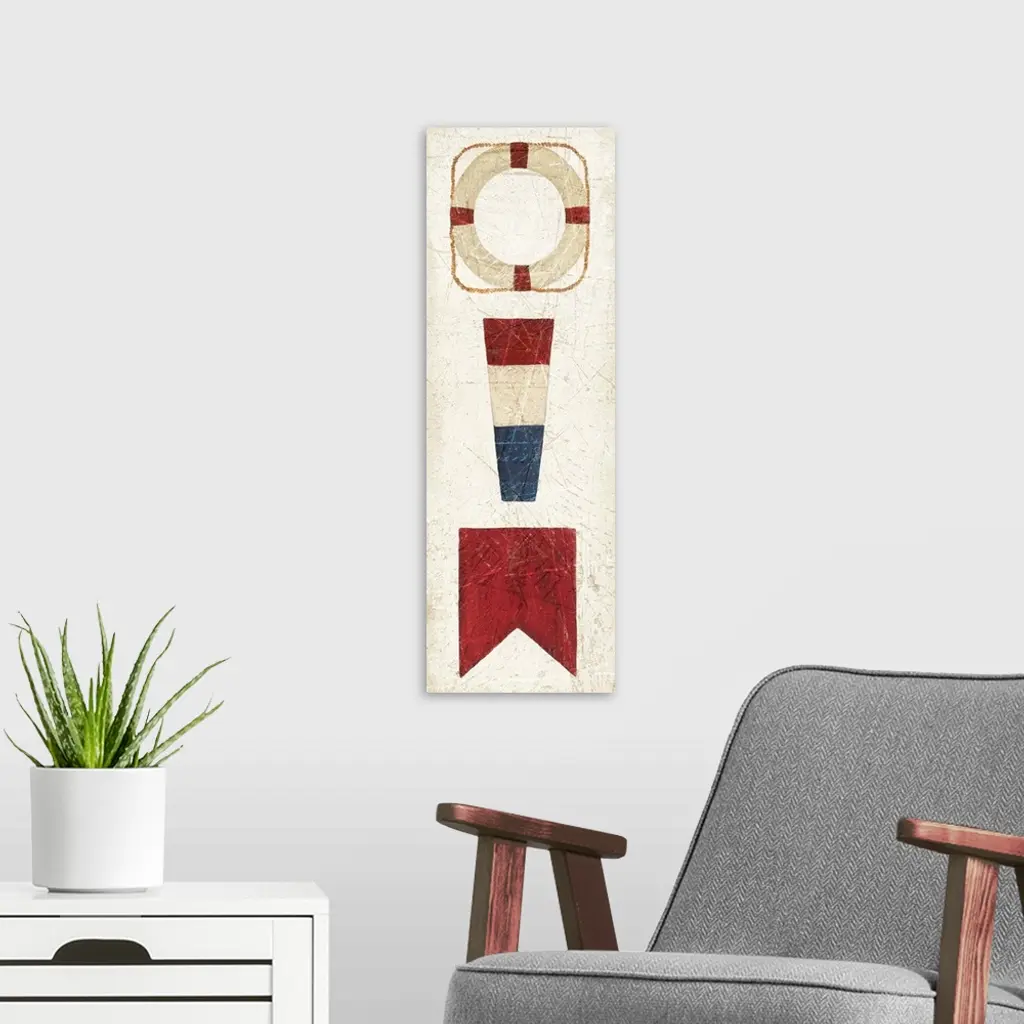 Vertical painting of three nautical elements, including two flags and a lifesaver.
