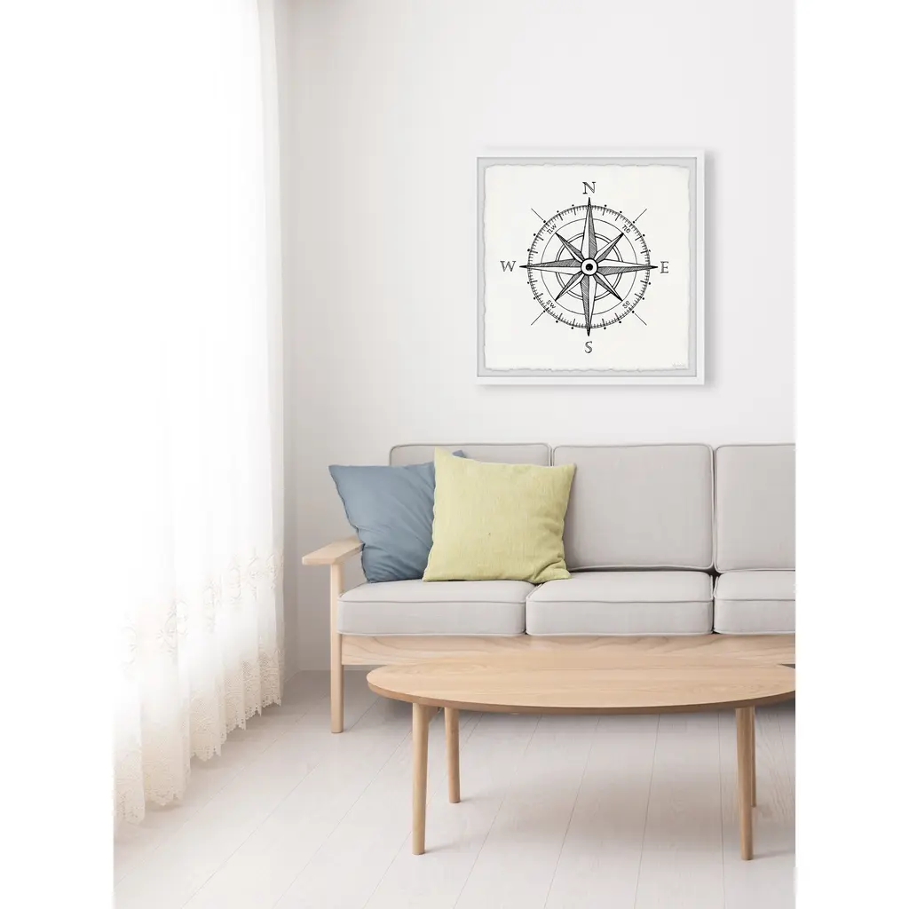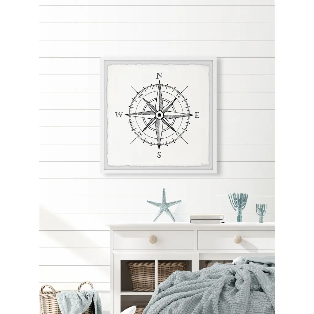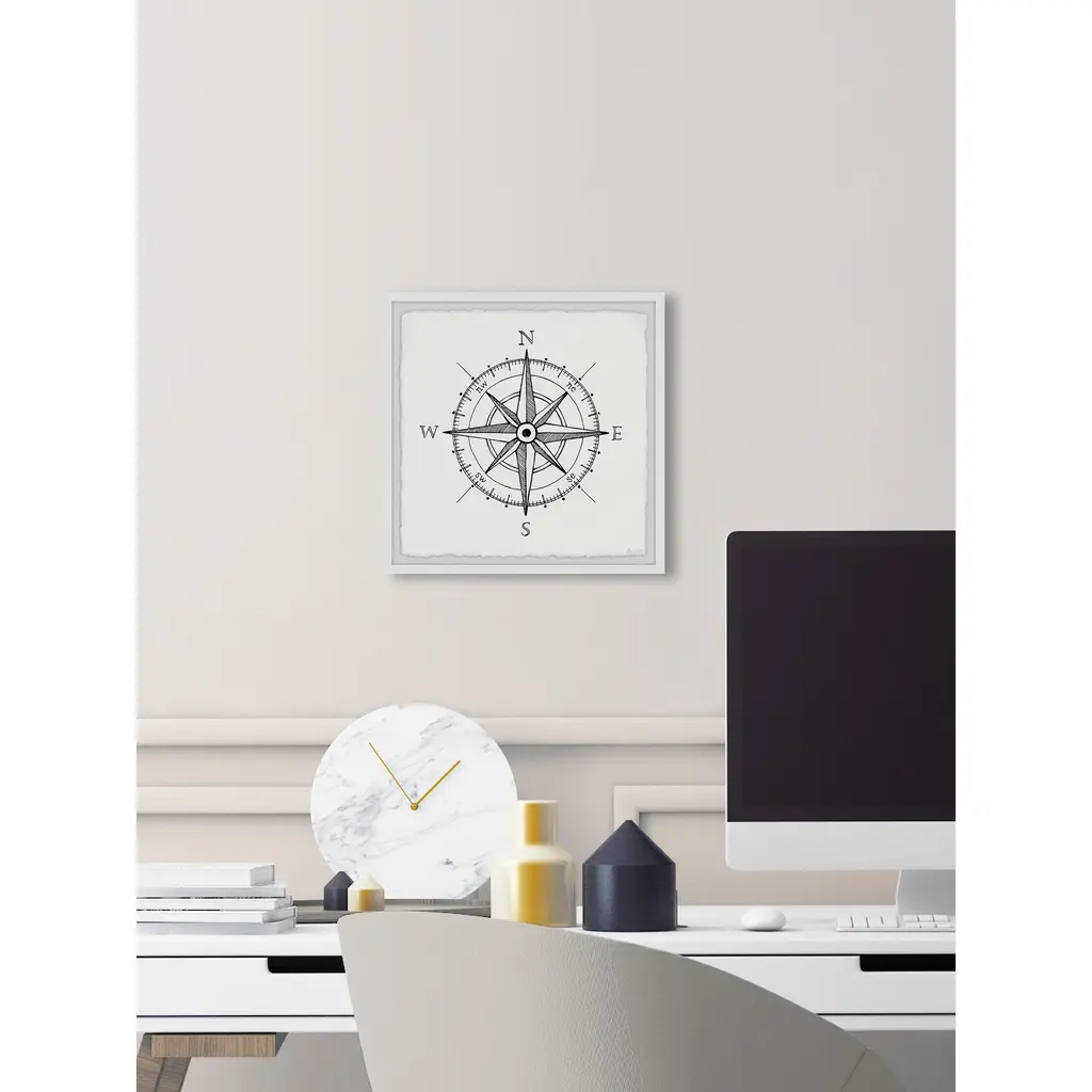 Whether you're striving for a bohemian or nautical interior style, this print is the perfect pick, featuring a black and white classic compass. Proudly printed in the USA, this piece is printed on high quality archive paper and professionally hand-framed. With wall-mounting hooks included, this artful accent is ready to hang up as soon as it reaches your front door. • Top quality Giclee print on high resolution Archive Paper • Hand cut deckled edges • High quality durable non-warping frame • Finished under shatter resistant plexiglass • Arrives ready to hang • Includes a certificate of authenticity • Printed in the USA